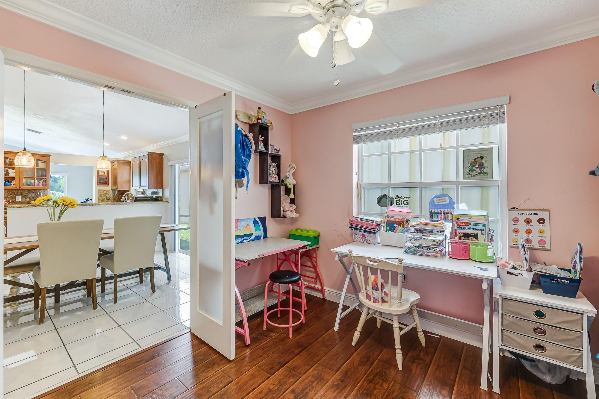 Spacious 4BR/2.5BA single-family home with 2-car garage in desirable Margate neighborhood, The Greens at Carolina—low HOA! Features include vaulted ceilings, crown molding, updated baths, ceramic tile throughout, and wood floors in bedrooms. The kitchen is being resurfaced with granite countertops. Impact-rated front and garage doors, accordion shutters, and a 2017 roof add value and security. Relax on your screened patio, taking in serene views of the golf course. Move-in ready and ideally located!