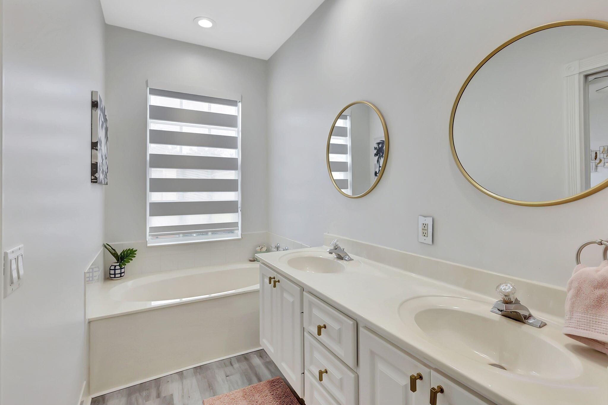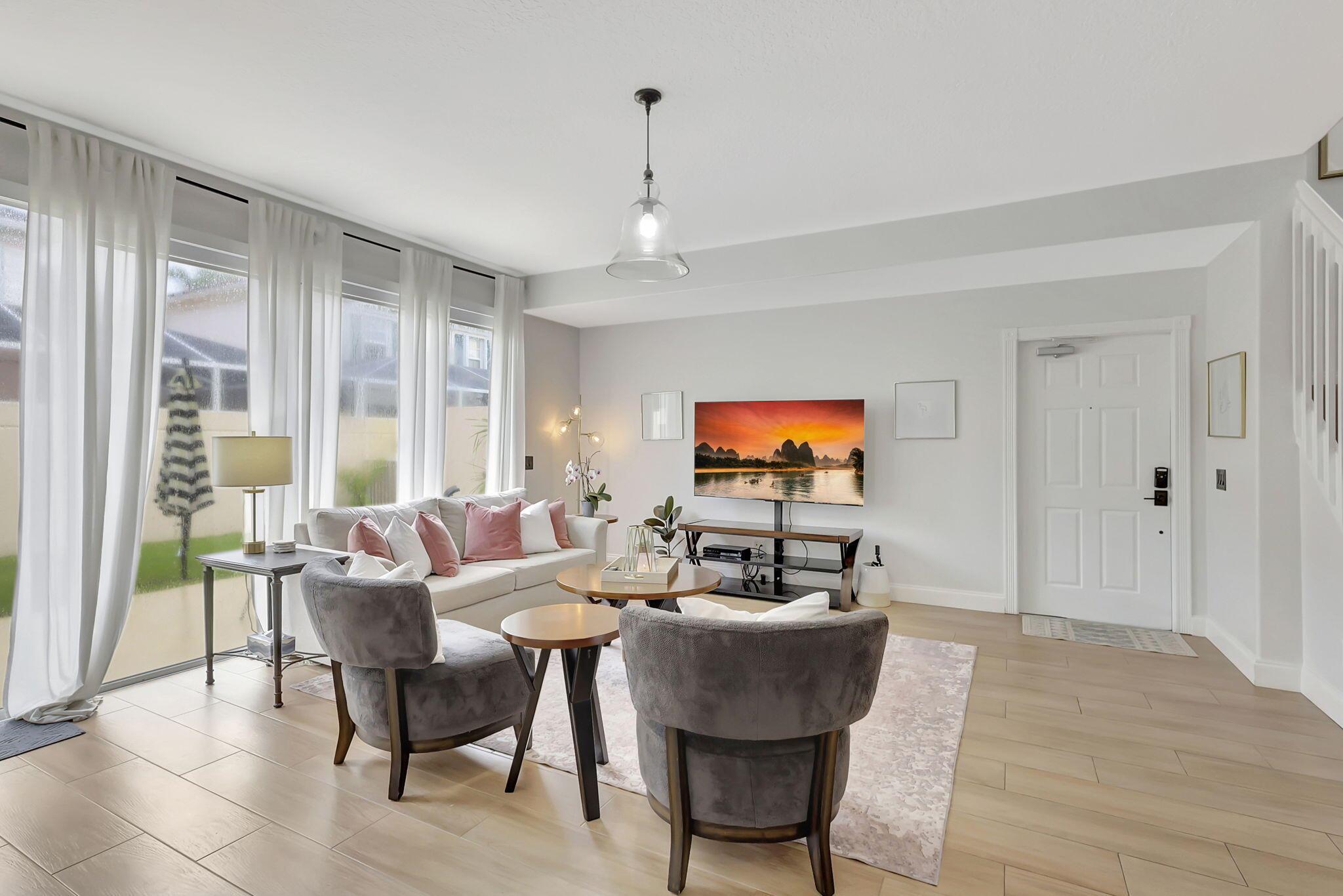 Beautifully updated 3 bedroom 2 bath townhouse with 1 car garage in Riverwalk in West Palm Beach! Wood-look tile floors throughout, gourmet kitchen with white marble countertops, fenced yard with open patio, custom lighting, all white paint, end unit that is full of light and bright. Community offers 3 pools, tennis, pickleball, gym, clubhouse space, walking paths and more. HOA fee includes internet and WiFi! Quick access to I95, Turnpike, Palm Beach Airport the areas best beaches. A short drive to lively downtown West Palm Beach, Palm Beach Island, great restaurants. See it today! AC is 2018.