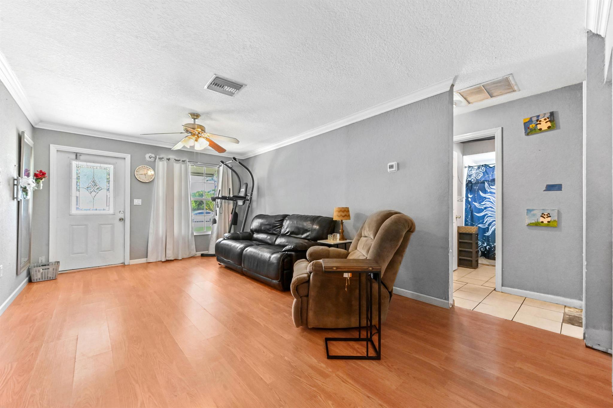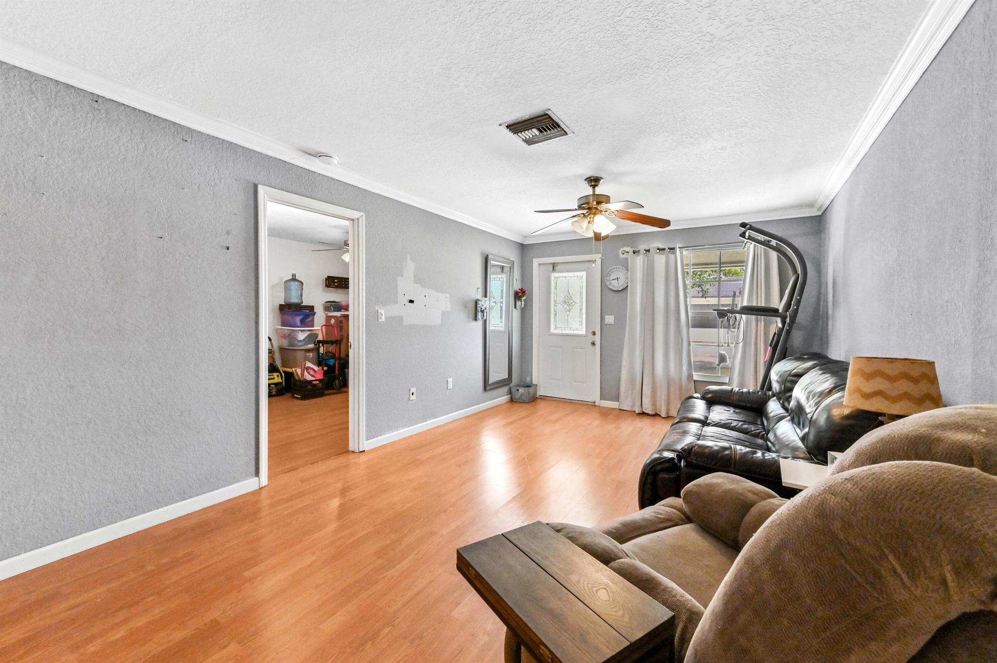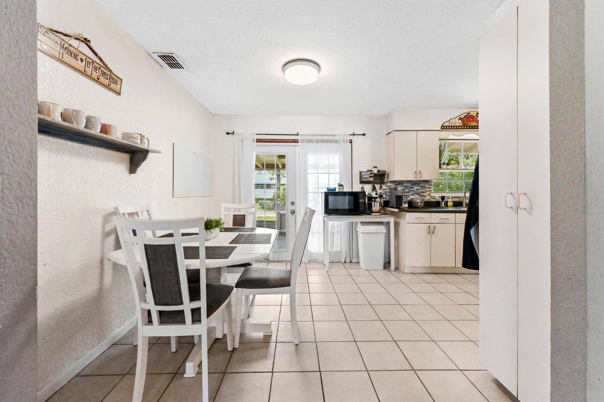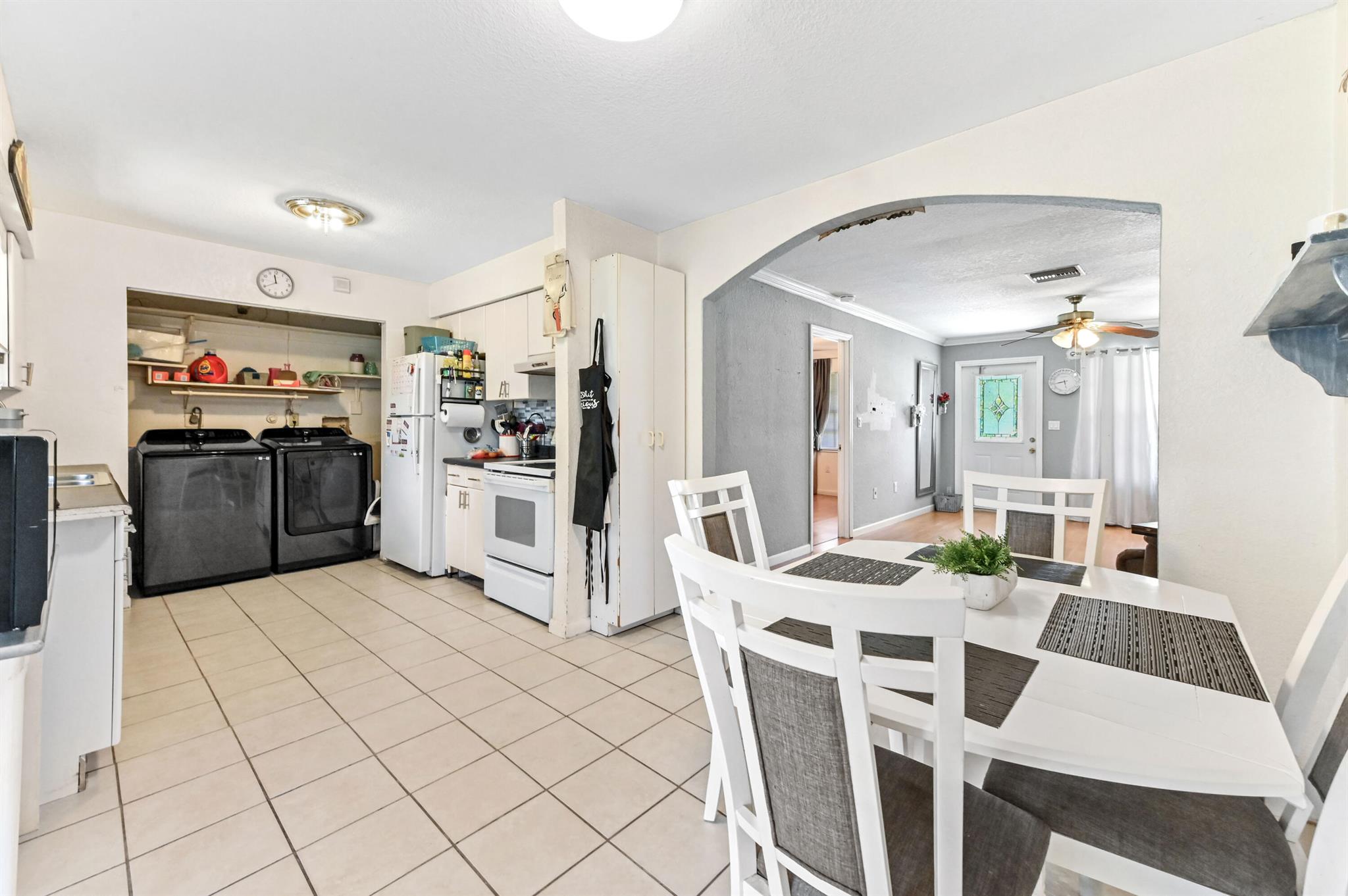 Discover a true sense of freedom and space in this charming single-family home, perfectly positioned on a generous corner lot within the non-HOA community of Palm Beach Farms in West Palm Beach, FL. This inviting residence features 3 comfortable bedrooms and 2 full bathrooms, offering a practical and serene living environment. Step inside to a welcoming living room that seamlessly flows into the combined dining and kitchen area, creating an open and connected heart of the home. The kitchen is both functional and stylish, boasting a classic tiled backsplash and a convenient laundry/storage closet for added utility.