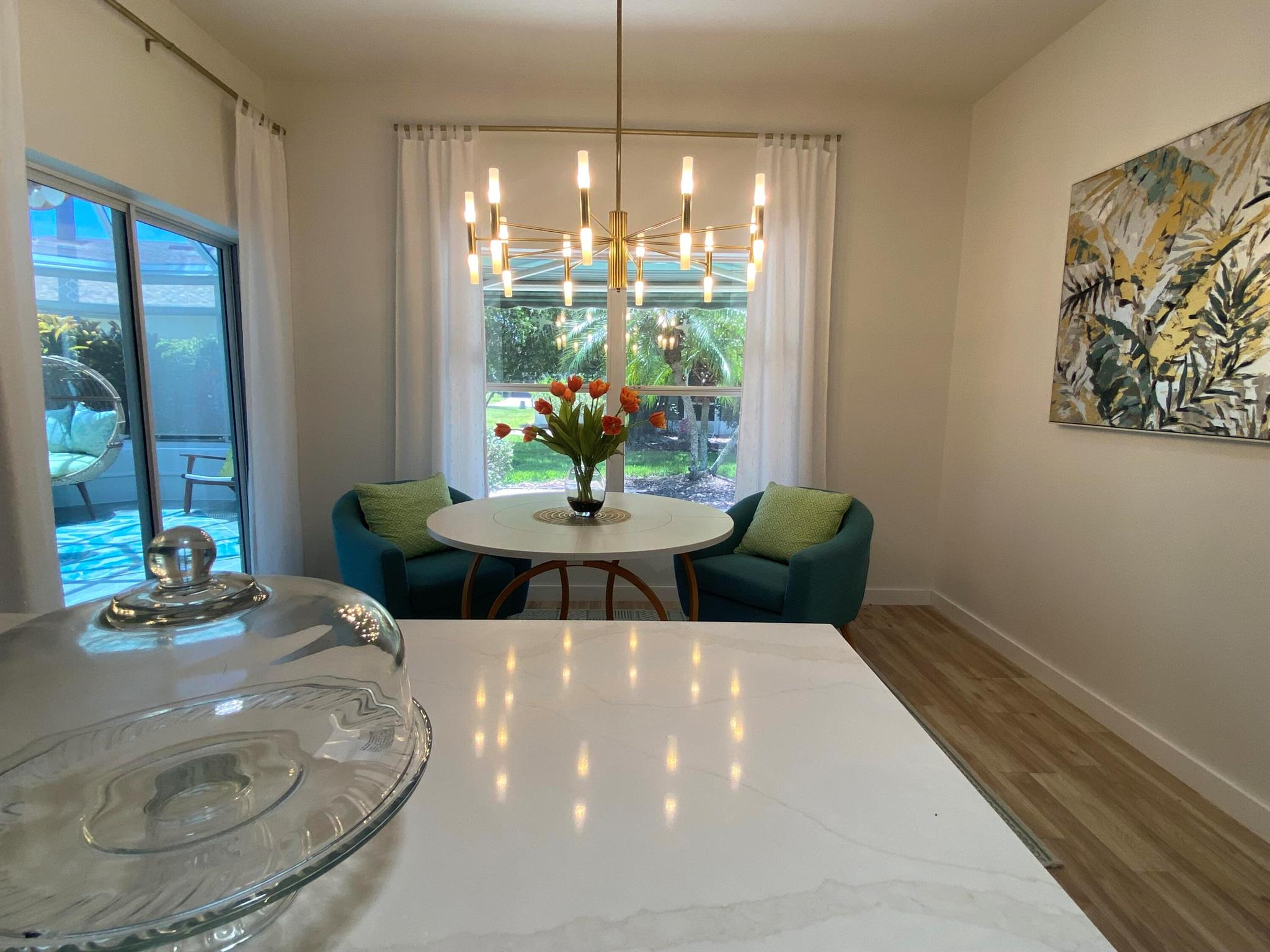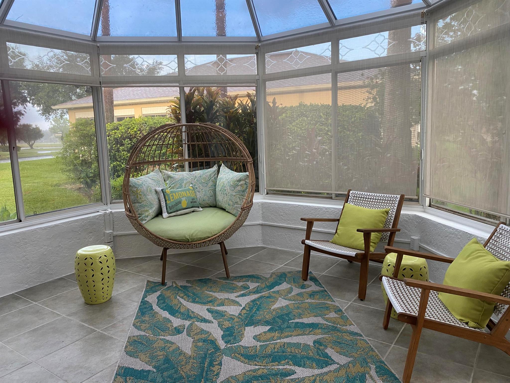 100% Designer Remodel! New flooring, cabinets, lighting, tile, paint, trim, kitchen & baths! HUGE corner lot with the nicest neighbors.Water views & moon views from the glass conservatory overlooking a 122' garden. Designer kitchen has new floating shelves & cabinets with quartz countertops & NEW appliances. The 6 person seating peninsula will be the center of this entertainer's dream home. Custom tile work. Feature walls in the den, living room and master bedroom. New garage epoxy floor.Butcher block laundry folding counter. Phantom screen on the stain glass front door & retractable canopy over the back patio. Enjoy the restaurants, gym, active life style in the golf course & nature community of gated Solivita!