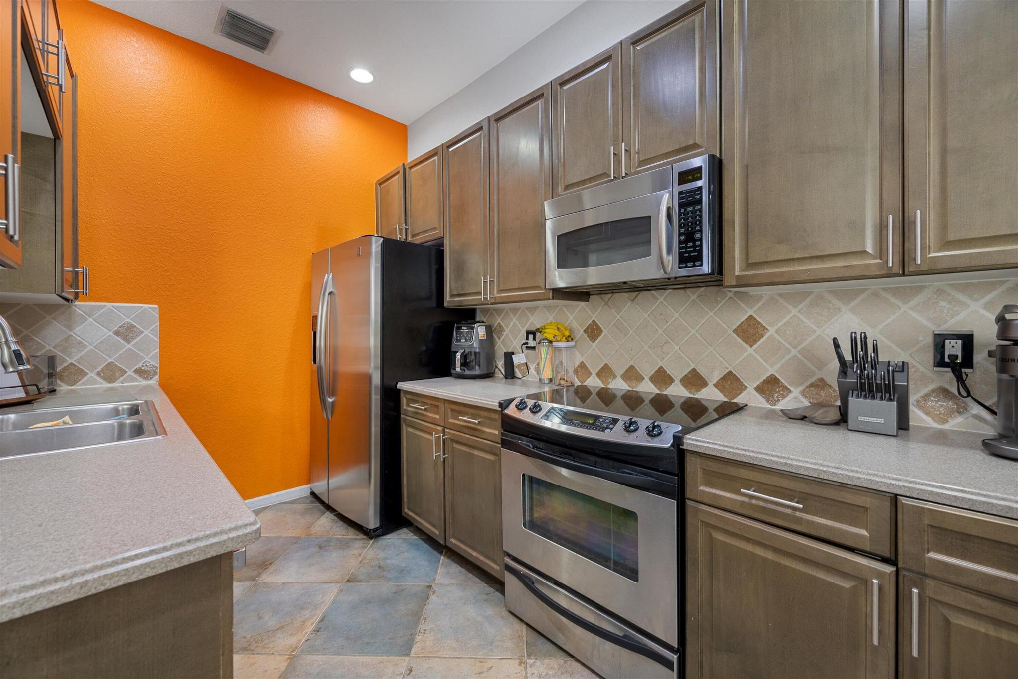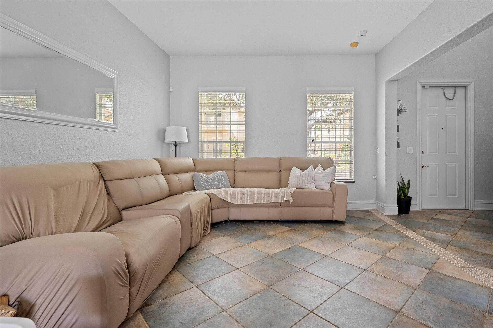 This stunning townhome offers the perfect blend of style, comfort and functionality, designed for both everyday living and effortless entertaining. Step inside to find a bright, open layout with all-tile flooring throughout the downstairs level. The main living area includes a welcoming family room and a separate living room-plenty of space to host gatherings or unwind in comfort. Also, you can relax knowing this is a smart home enabling you to check everything at your fingertips. The kitchen is a showstopper. It features 42-inch cabinets for ample storage, sleek, stainless-steel appliances, a tumbled marble backsplash that adds texture and warmth, and durable Corian countertops that are both beautiful and practical. Starting from the stairs to the 2nd floor you have all