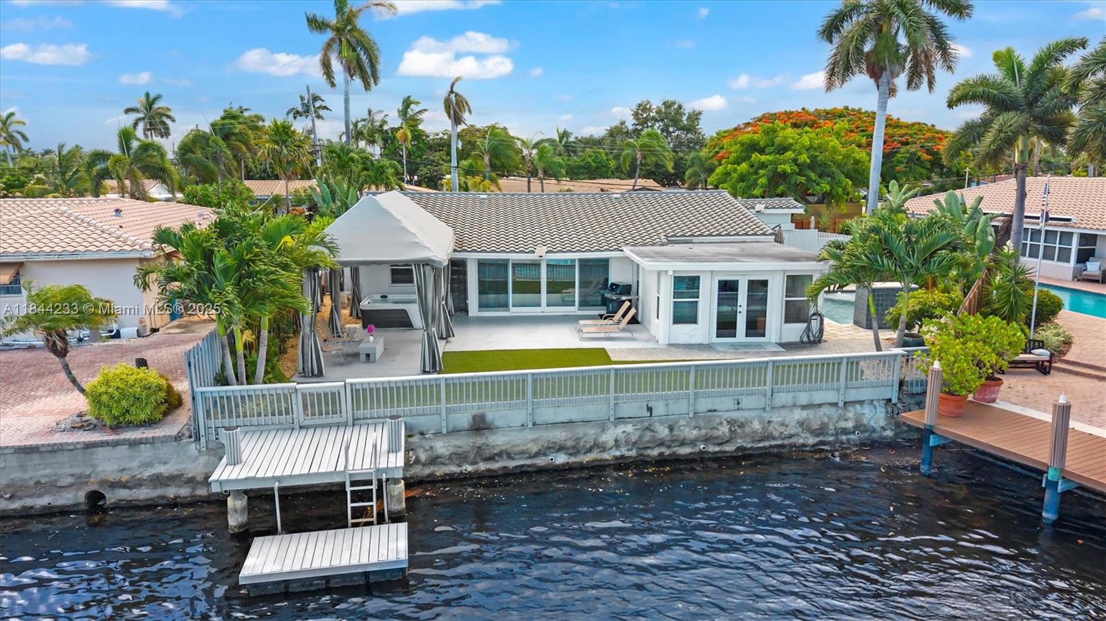 DRASTICALLY REDUCED - PRICED TO SELL - Possible Owner Financing Waterfront Pool Home with spectacular Lake views in desirable Coral Heights 3 bedroom 2 Bath Pool Home 2200 sq. ft. including 2 car garage. Fenced property, Heated Salt Water Pool with waterfall, gas pool heater, Dock, covered Tiki Hut with new hot tub with solar lights. Open dining and living room w/ built-ins overlooking the lake–kitchen w/gas stove, kitchen bar counter, Stainless Steel appliances, Spacious Primary Bedroom with sitting room with water views, large closets, 2 more bedrooms, impact windows, gas water heater, laundry room w washer/dryer, lots of cabinets, tile and wood flooring throughout, 2 car garage with tile floors, workshop, driveway, and Barrel tile roof. Near Shopping, Beach, Transportation and Airport.