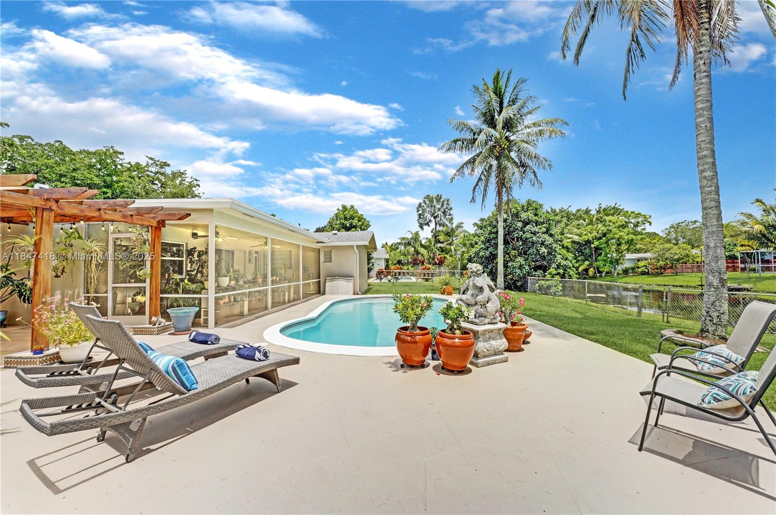 Welcome to 7550 NW 12th Street, a beautifully updated home nestled in the heart of Plantation. Set on a spacious waterfront lot, this residence offers the perfect blend of comfort, style and functionality. Enjoy peace of mind with a new roof (2023), replaced attic insulation, remodeled bathrooms (2019), a modern kitchen with quartz countertops, and a large laundry room for added convenience. As you step outside, the true magic of this property unfolds and provides the serenity and space you've always envisioned while the newly resurfaced pool (2025) invites you to lounge & unwind. Enjoy a covered patio perfect for BBQ, fully fenced yard and charming pergola. Whether you're entertaining or relaxing, this home offers the perfect blend of charm, privacy, and functionality in a prime location.