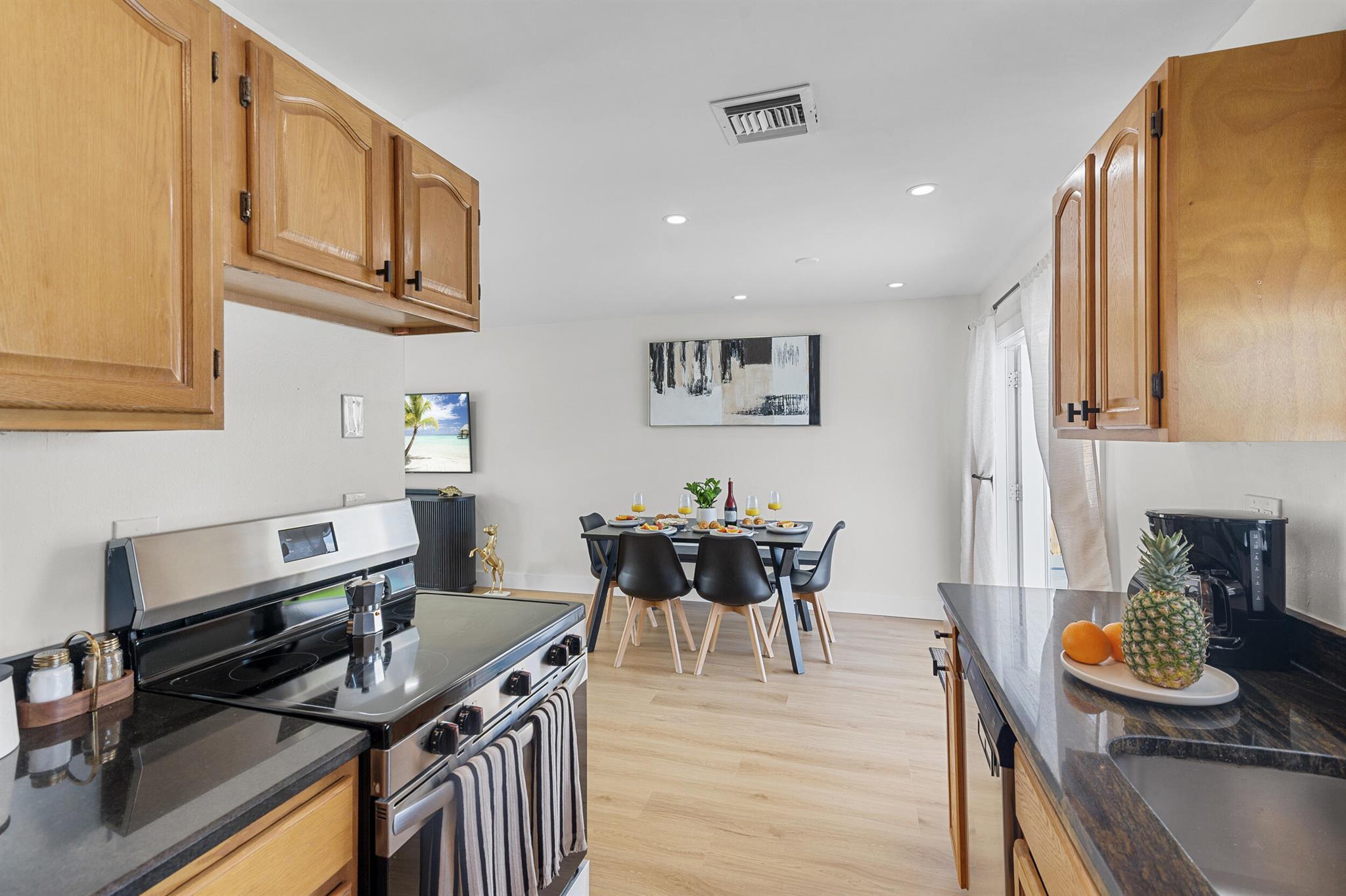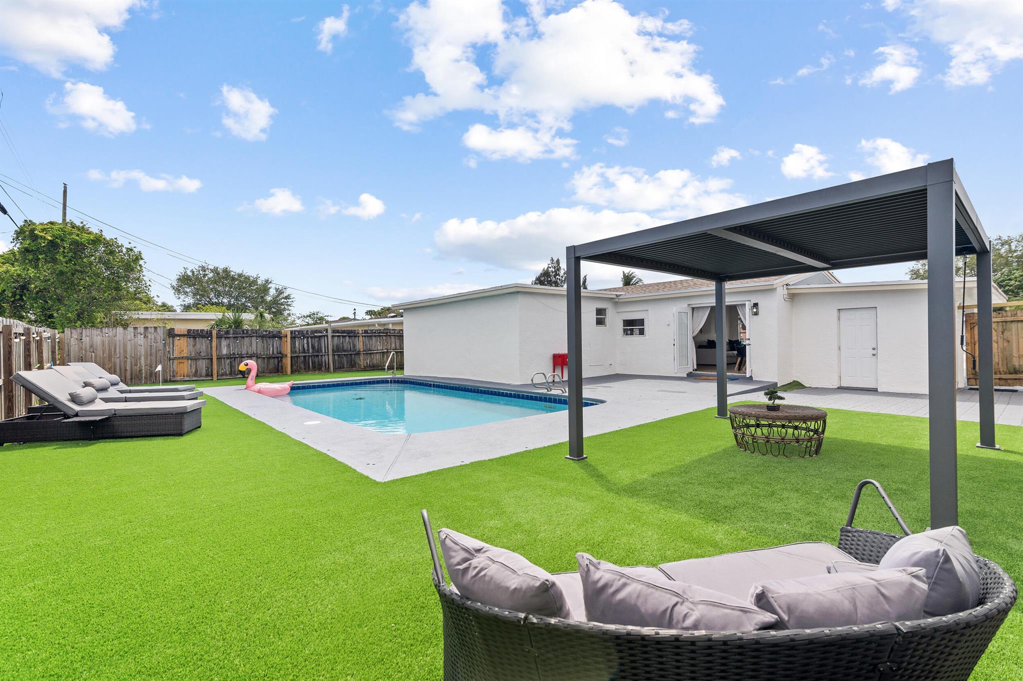 Incredible POOL home nestled on large CORNER lot in NON-HOA Community!! Endless possibilities await from this beautifully renovated 3 bedroom, 2 bath pool home, NEW ROOF (2024) in the heart of West Palm Beach! Owner has updated this single story residence with new designer paint, luxury vinyl flooring throughout (no carpet!), LED lighting and completely furnished like a model! Updated kitchen with granite counter tops and stainless steel appliances. HUGE primary suite with connected sitting area/office or den/media room. BOTH bathrooms updated with custom vanities - master boasts mosaic tile floor and large shower; guest bath offers LED mirror and combo tub/shower. RELAX in your private backyard oasis! Take advantage of the Florida Sunshine as you lounge around your large open pool,