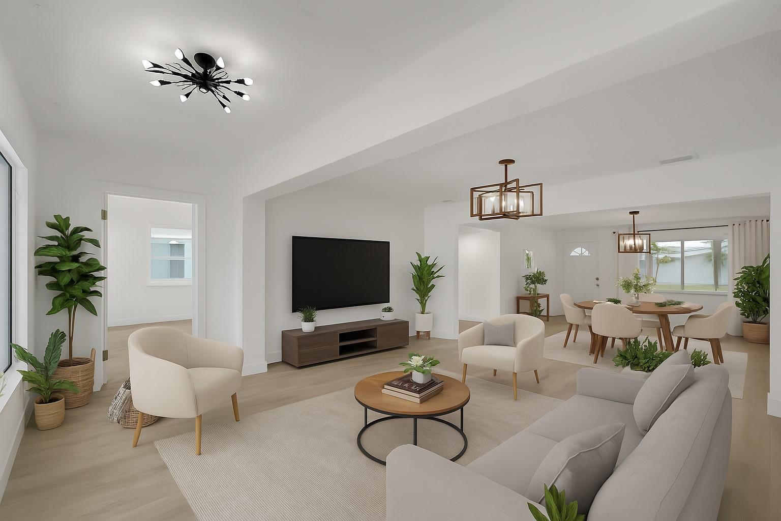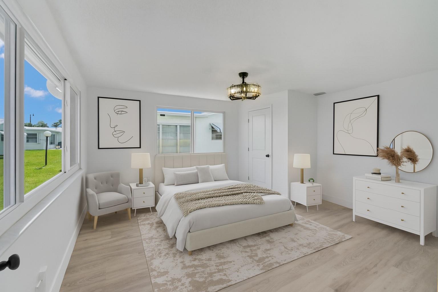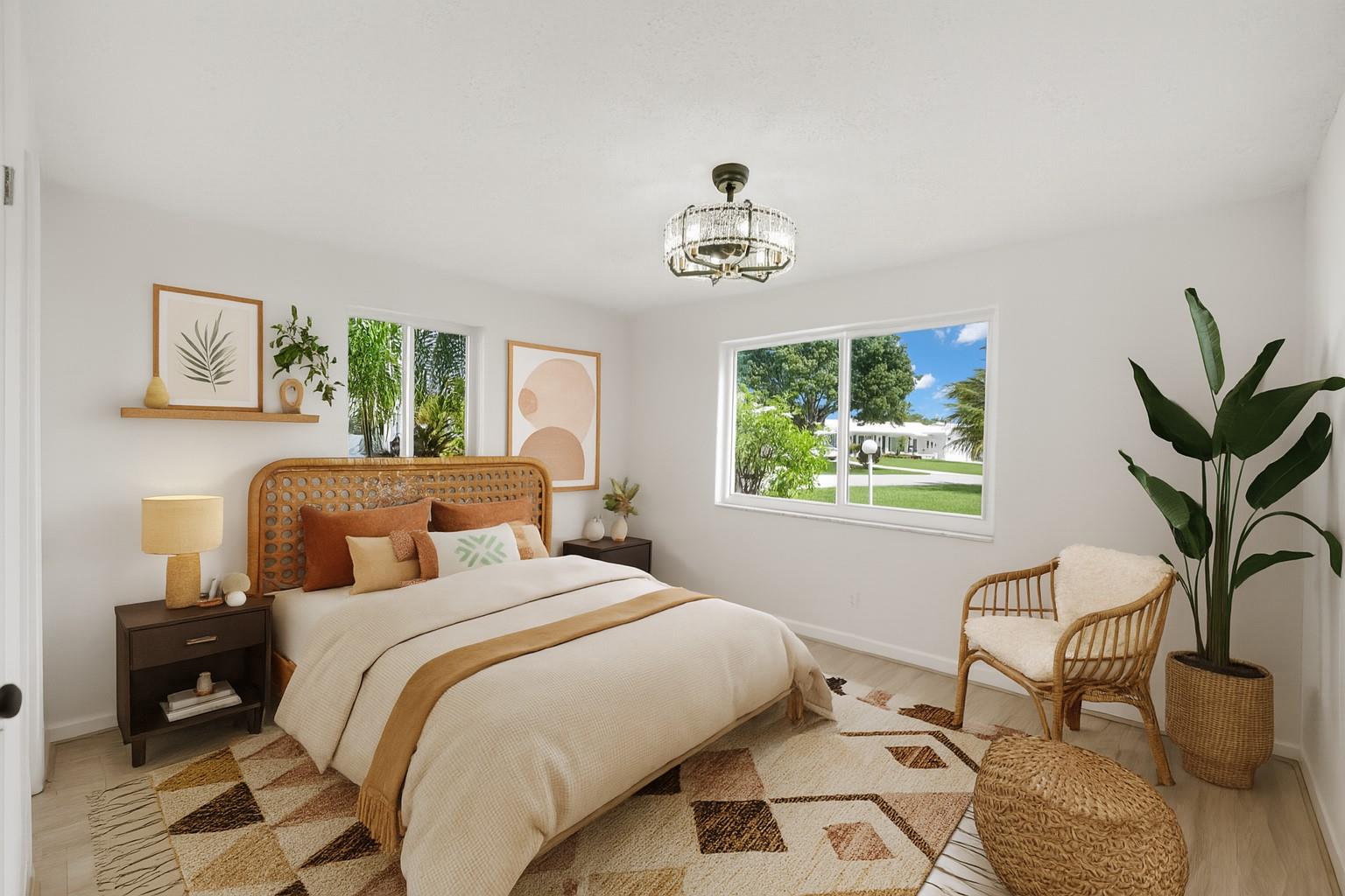 Fully renovated THREE BEDROOM, 2 bath, 1 car garage single family home JUST OVER 3 MILES TO THE BEACH in sought after 55+ Leisureville community! Open split bedroom floor plan layout includes brand new flooring throughout, fresh paint & beautifully updated kitchen with quartz countertops, new SS appliances, new cabinets & new A/C. Large 3rd bedroom added while keeping a huge living space that greets you upon entry flowing through to the rear windows viewing the expansive oversized corner lot. Both bathrooms elegantly renovated with attention to detail. Impact windows! LOW HOA! Resort-style living with amenities including 2 clubhouses, pools, shuffleboard, shuttle service, lawn/landscape service and access to a 9 hole golf course, exterior painting every 6 yrs & roofs every 3 yrs.