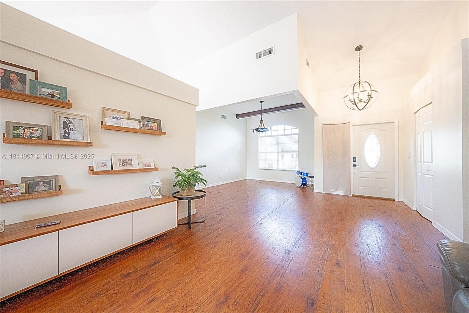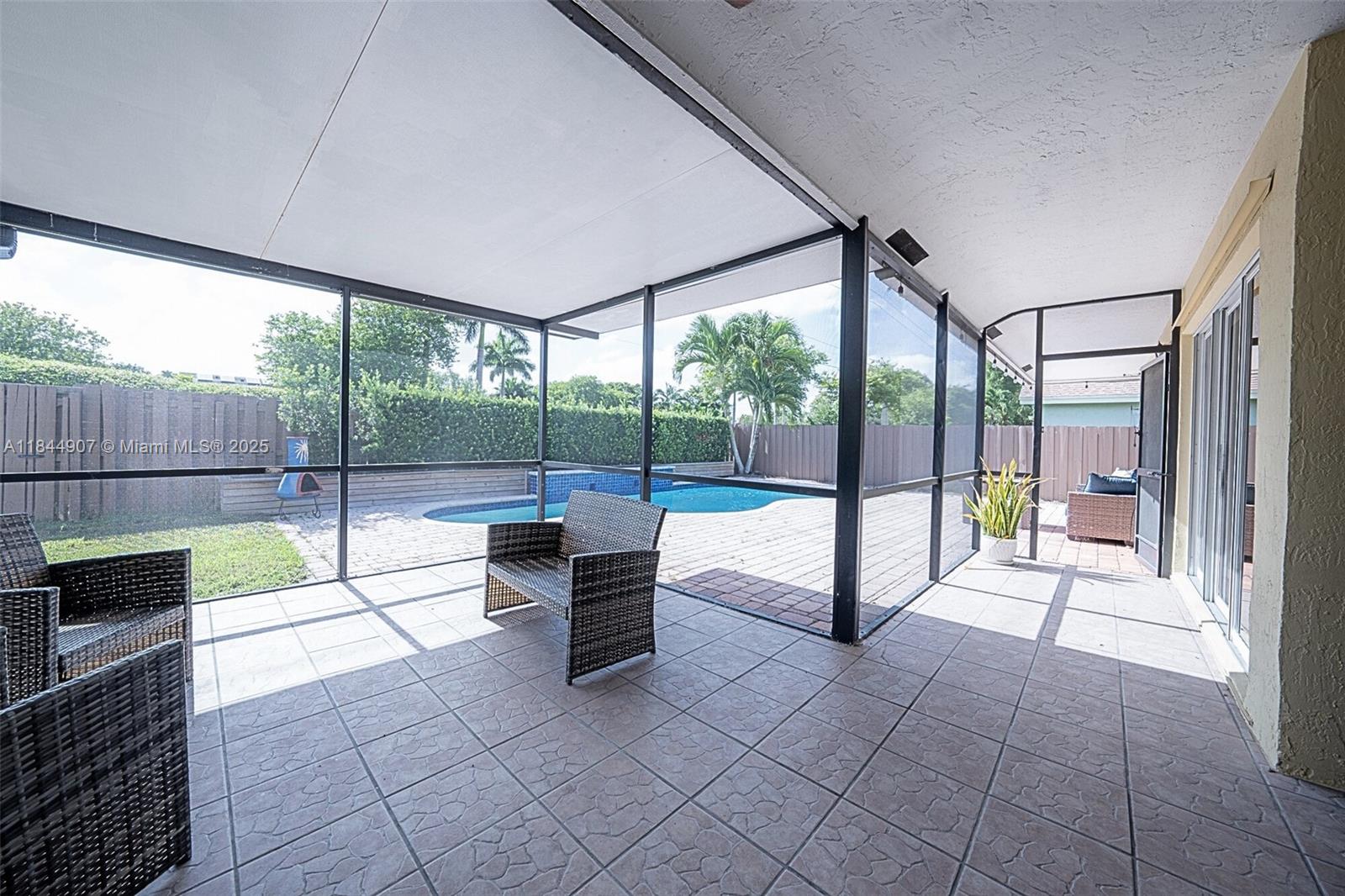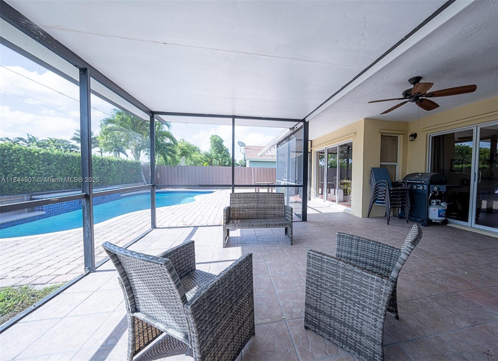 Large, 4/2 pool home on a 8,250 sq ft lot in top-rated school zone. Best price per sq. foot! Vaulted ceilings, all bedrooms located together on one side of the home. Dual zone ACs, large formal living room and formal dining room area. Kitchen is open to family room and dinette area. Two sets of sliding doors lead to covered terrace and screened pool. Master suite features spacious bathroom with separate tub and shower, extra closet, and cabana access. All bedrooms and kitchen and bath are tiled. Double garage has central air, beautiful epoxy floors, thermal barrier padding on its impact electric garage door, side entrance, and closet for AC and timed water heater. No rear neighbor. No HOA approval. Flood Zone X. Includes 1-year American Home Shield Warranty.