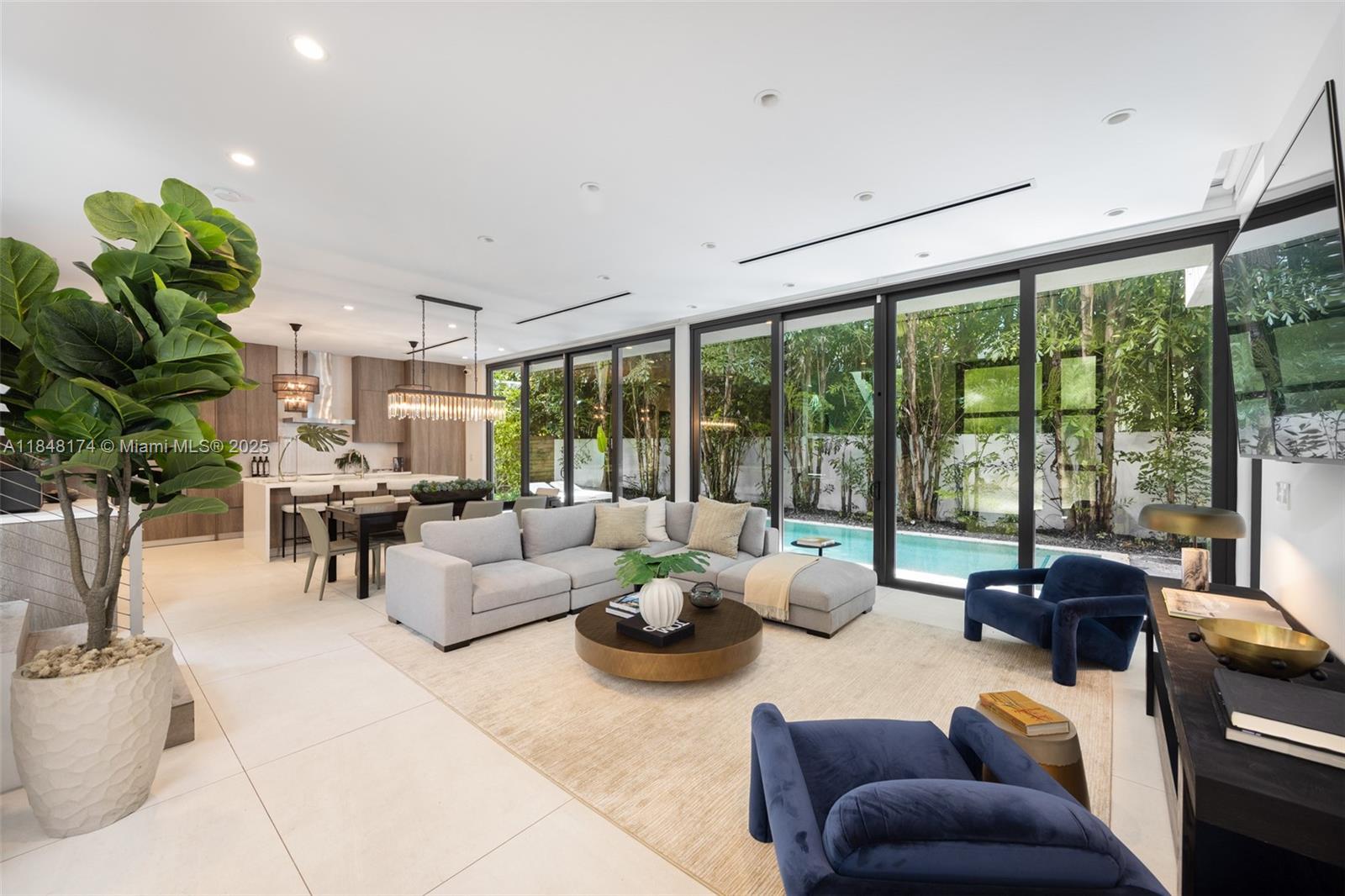 Spectacular, modern-style residence with a tropical vibe. Located on a quiet, tree-canopied street in South Coconut Grove. Captivating living spaces - created with walls of glass, high ceilings and abundant natural light- fully embrace the indoor/outdoor lifestyle. Stunning, European-style kitchen features cooking island, walk-in pantry & top-of-the line appliances. An ideal floorplan layout offers a ground-level guest suite, a 2nd level den/family room + 3 additional bedrooms including the primary suite that features a room-size walk-in closet, a spa-like bathroom & a balcony overlooking the tranquil pool & lush garden. Walk or bike to the historic Grove village’s galleries, boutiques, cafes and bayfront parks & marinas. Just minutes to downtown, MIA & the Beaches.