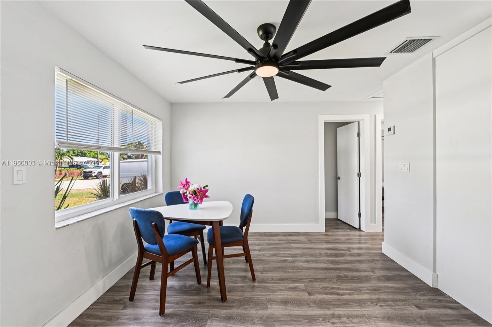 This home blends modern style with everyday comfort. Featuring a new 2023 roof, tankless water heater, impact windows and hurricane-rated doors for peace of mind. Modern laminated wood flooring and baseboards, complemented by a 2020 AC system. Enjoy the updated kitchen with gleaming quartz countertops and sleek stainless steel appliances. Both bathrooms offer refined finishes & fixtures. Den/office room with closet acts as an additional room for more space. Outside, the large yard has space for a boat or RV, a driveway for multiple cars. Abundant natural light, enhanced by recessed lighting creating a clean, open feel. Located just 2 minutes from the beach, shopping, dining, and major routes, this home offers a perfect balance of style and location. No HOA!