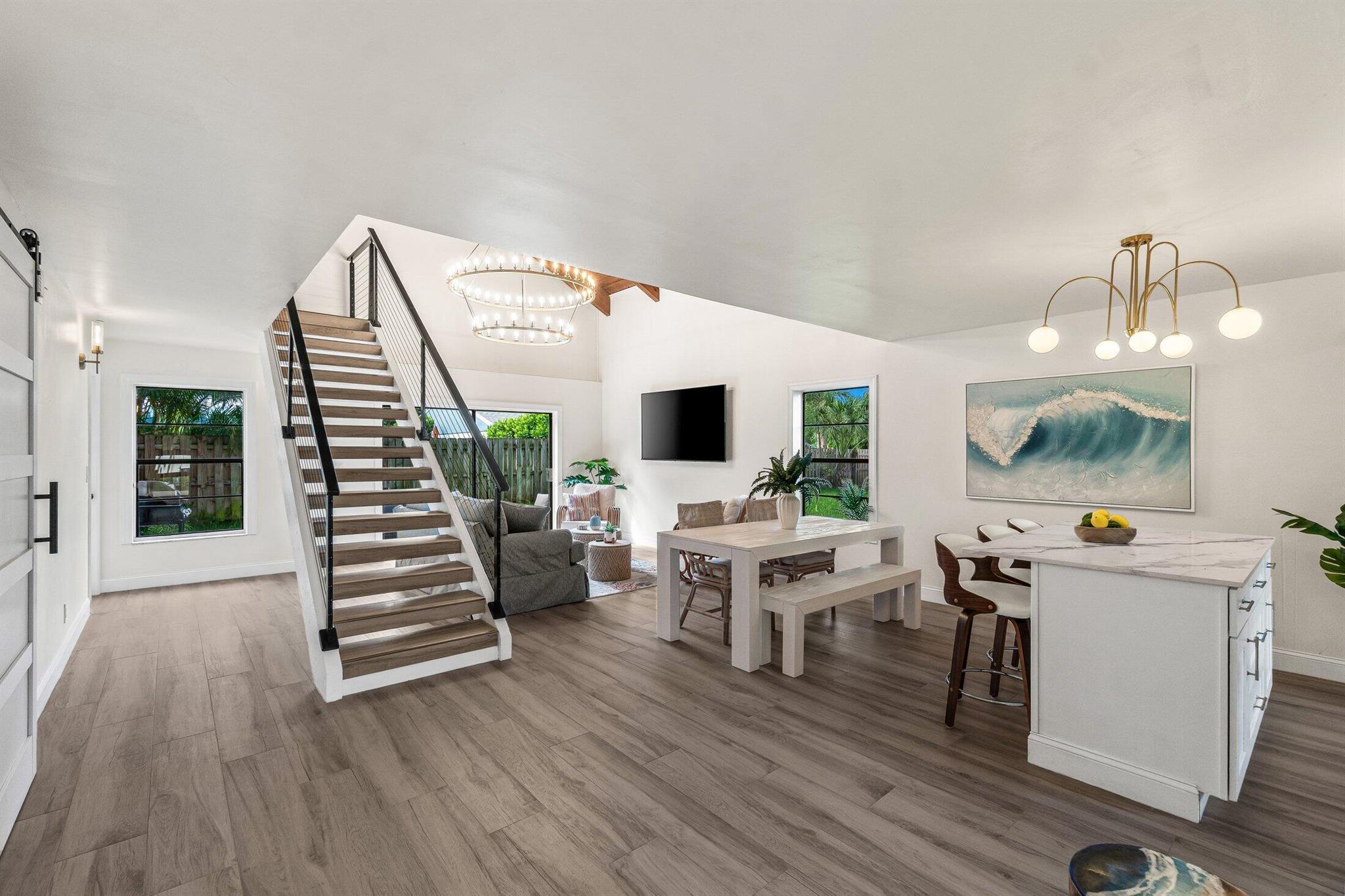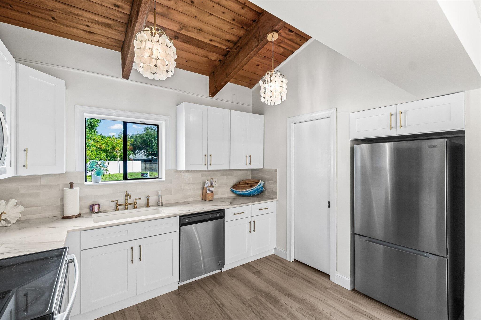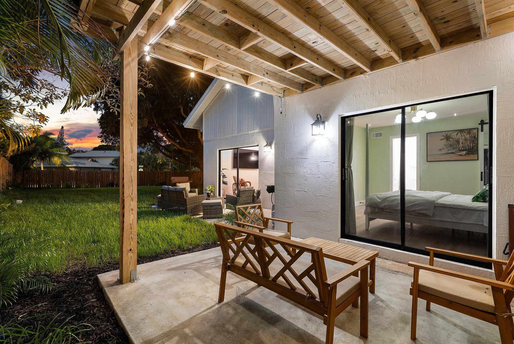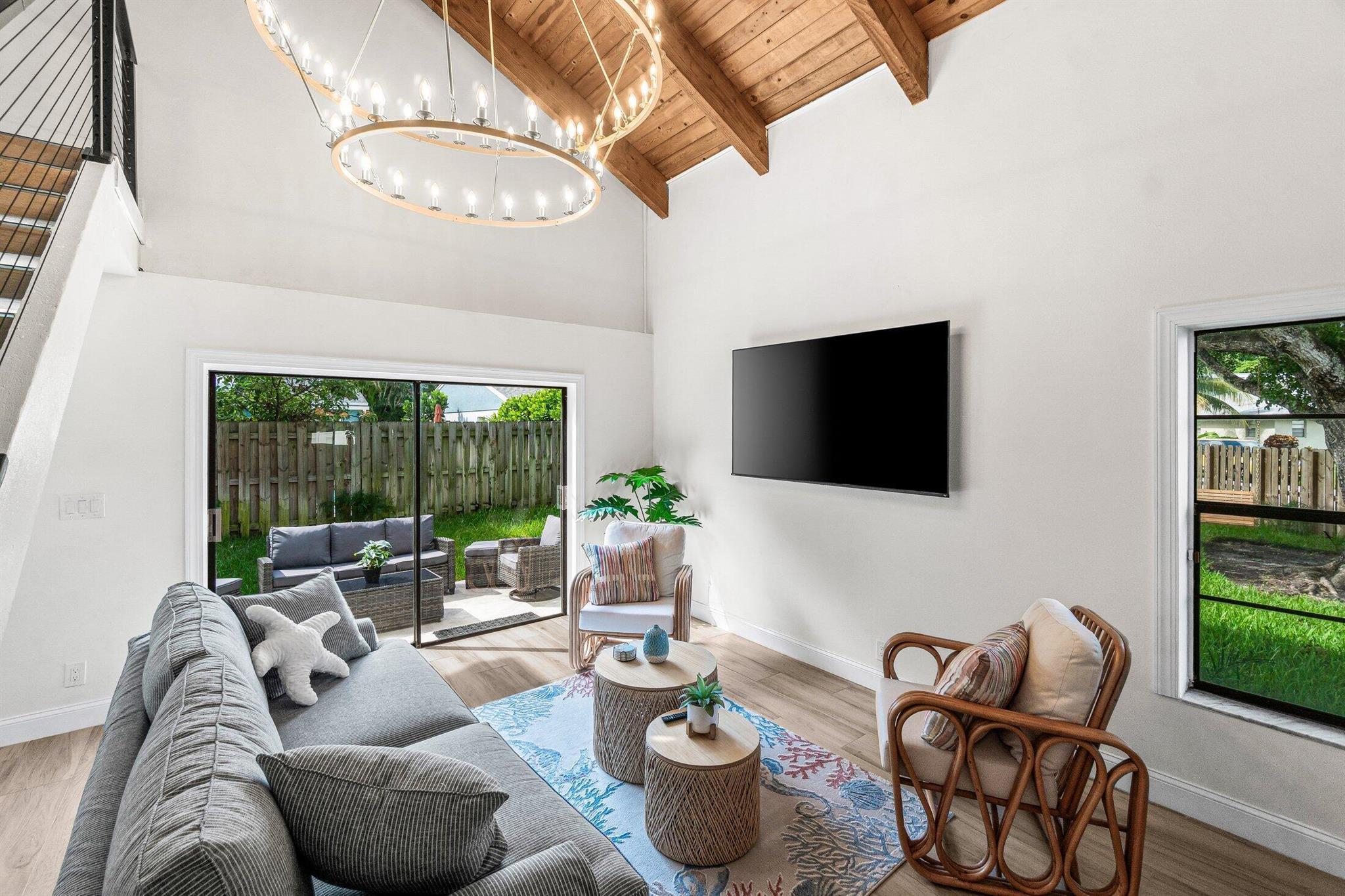 Rare opportunity to own this modern turnkey home with warm coastal vibes on a huge oversized lot near pristine Beaches of Delray Beach. Just a quick ride to downtown this exceptional home comes professionally furnished and decorated along with four beach cruisers! Reconfigured open-kitchen, high-vaulted ceilings, cedar-wood beams, stainless-steel appliances, modern vanities, quartz counters, porcelain-tile floors wall-to-wall, and hurricane garage door are just some of the features this home offers. Master bedroom downstairs with patio. Huge backyard completely fenced-in with gate! Room for pool! Elongated driveway has room for multiple cars. Completely repainted interior and exterior. This gem is perfect for a vacation home, permanent home, long or short term rental. No HOA!