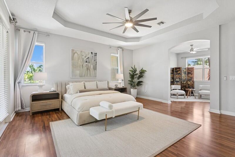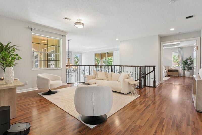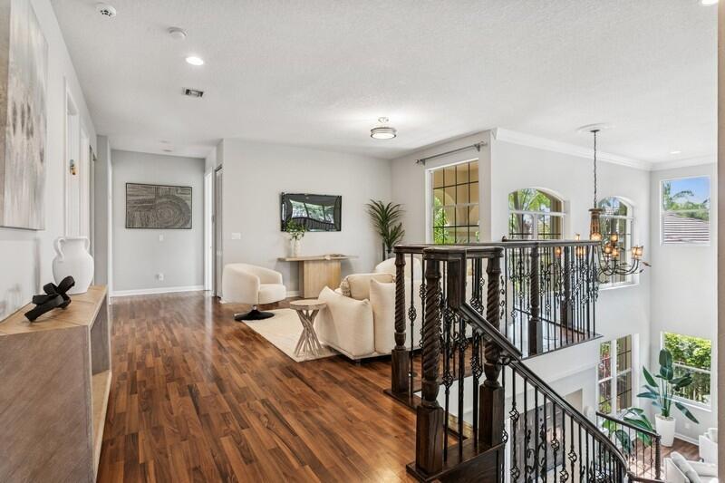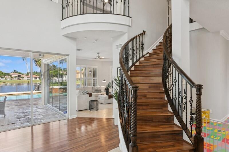 Tucked away on a quiet cul-de-sac within the coveted Grande Estates section of Journey's End, this stunning residence sits on one of the most desirable lakefront lots in the community. Featuring an extended driveway, lush landscaping, and timeless architectural appeal, this 5-bedroom, 3.1-bath home offers 3,623 sq ft of refined living space and an elevated lifestyle both indoors and out.Step inside to soaring ceilings and an elegantly appointed living room highlighted by beautiful rod-iron winding staircase, a decorative brick accent wall setting the tone for warmth, style, and sophistication. At the heart of the home is a fully renovated gourmet kitchen featuring quartz countertops, stainless steel appliances, induction cooktop, coffee bar, pantry, and casual dining area.