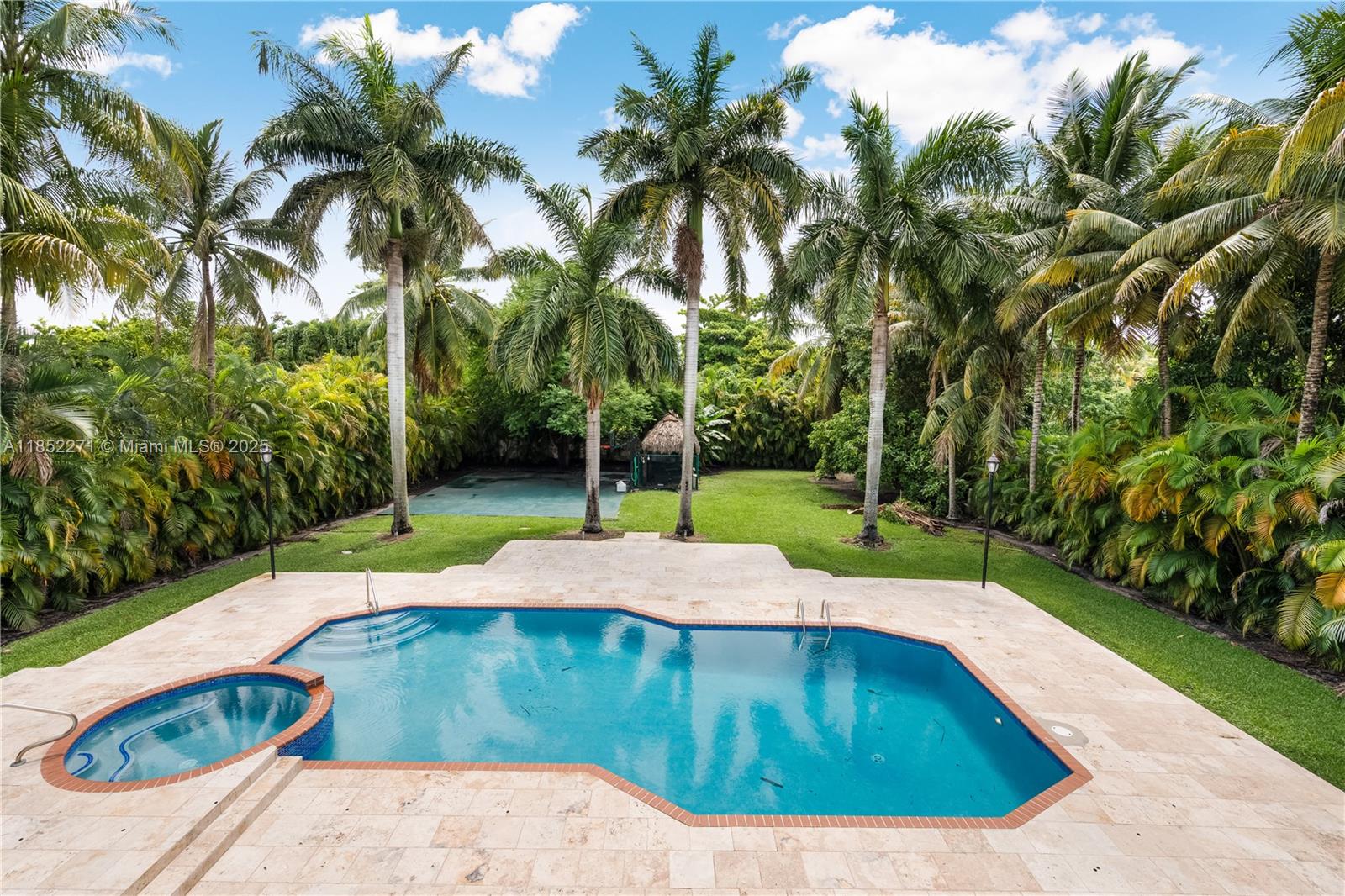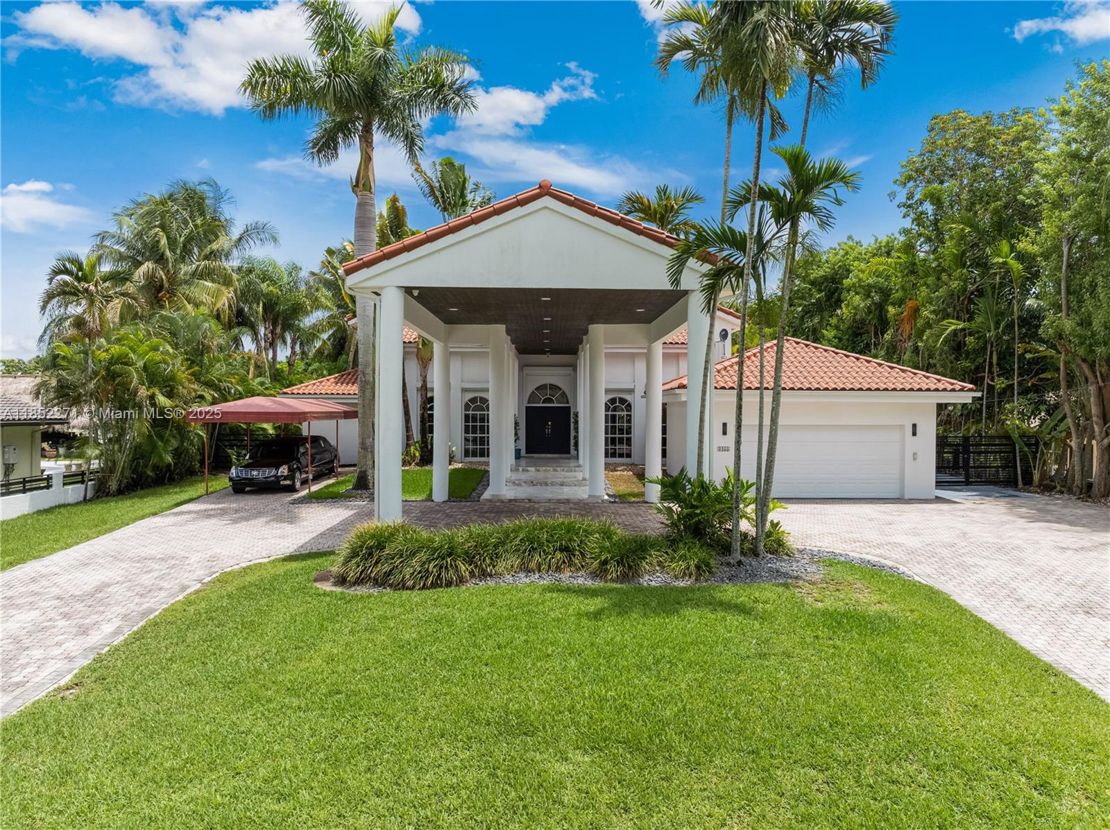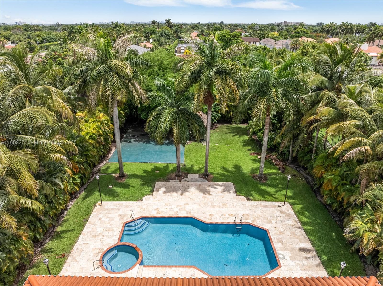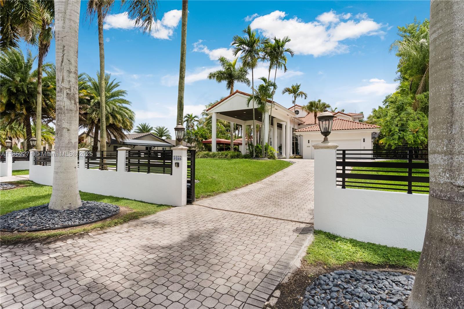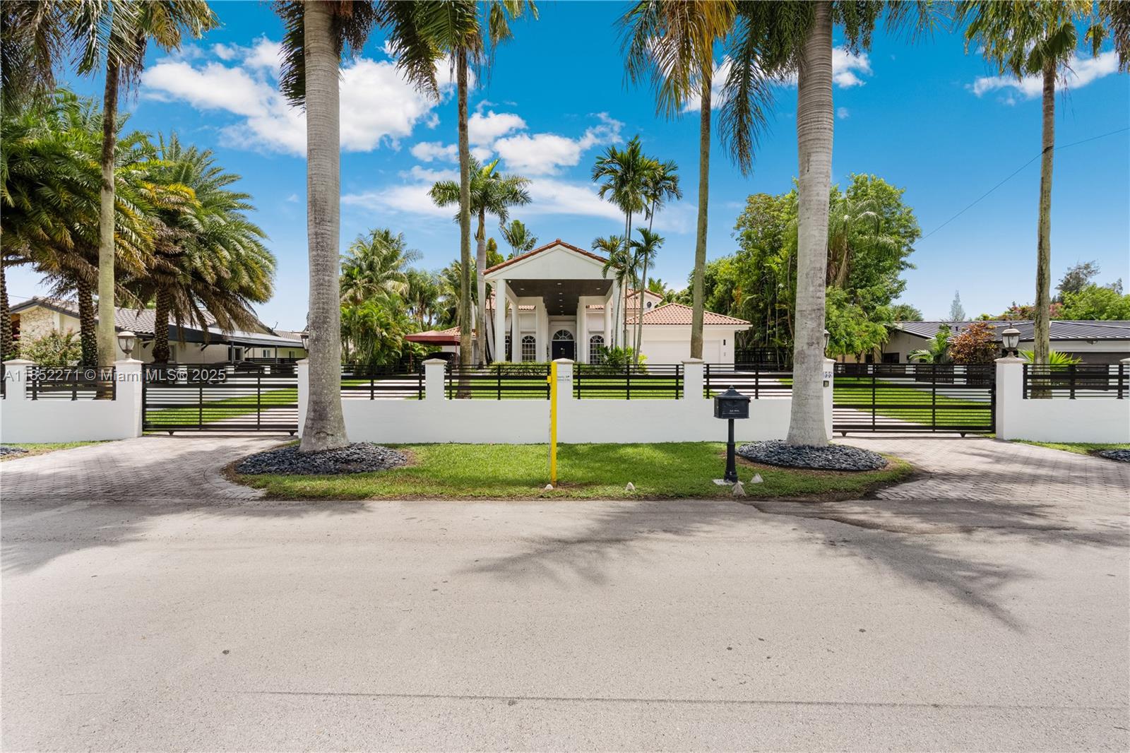 This unique residence is set behind private gates on a spacious 30,492 s/f lot, featuring a stunning circular driveway that leads to a porte-cochere entrance and a 2-car garage. Built on an elevated site, the home offers 6,723 total s/f with 5 bedrooms, 5 bathrooms, and a separate office. Upstairs, you’ll find a Jack & Jill layout and two master bedrooms—both with access to a large shared balcony, perfect for enjoying morning coffee or evening sunsets. Recent updates include a renovated kitchen, new fencing, sprinkler system, and recent tenting. The pool has been newly resurfaced with fresh plaster and includes a jacuzzi for added relaxation. Interior features include elegant Carrera marble floors, grand entrance columns, and a electric generator. Located near top-rated A+ schools.