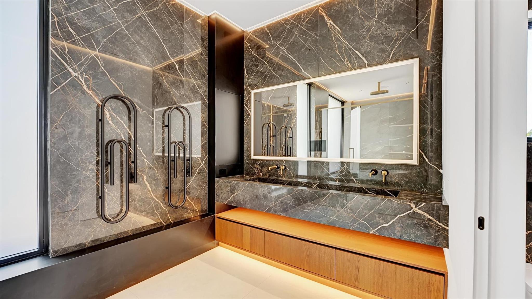 It was all a dream! Brand new construction with every bell and whistle you can dream of. Step through the pivot front door to a jaw dropping floating staircase, earthy tones, good energy, clean lines, this waterfront 5 bed, 5.5 bath is a true showstopper. The custom kitchen has Wolf & Jenn Air appliances, Taj Marble counters, wine and liquor cabinets! The kitchen opens to the living room with Italian oak paneled walls, a fireplace with expansive 33’ of floor to ceiling glass with a view of the pool and canal. The primary suite has custom closets and a bath like you have never seen before, floating cabinets, towel warmers and even an Apple TV in the mirror. Mosaic tile infinity pool, turf yard, glass panels the list goes on. The house is 100% smart with IPADS in each room.