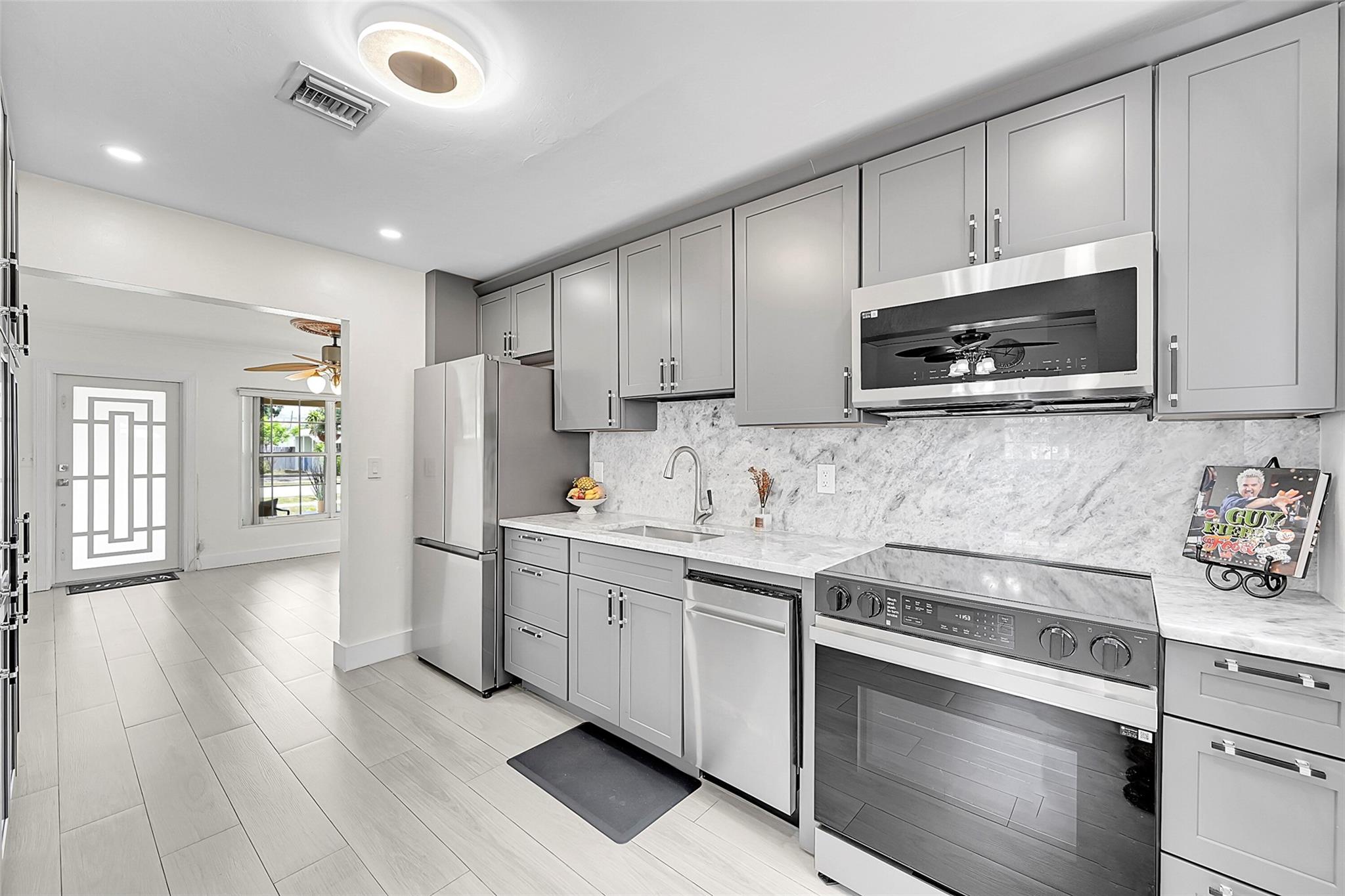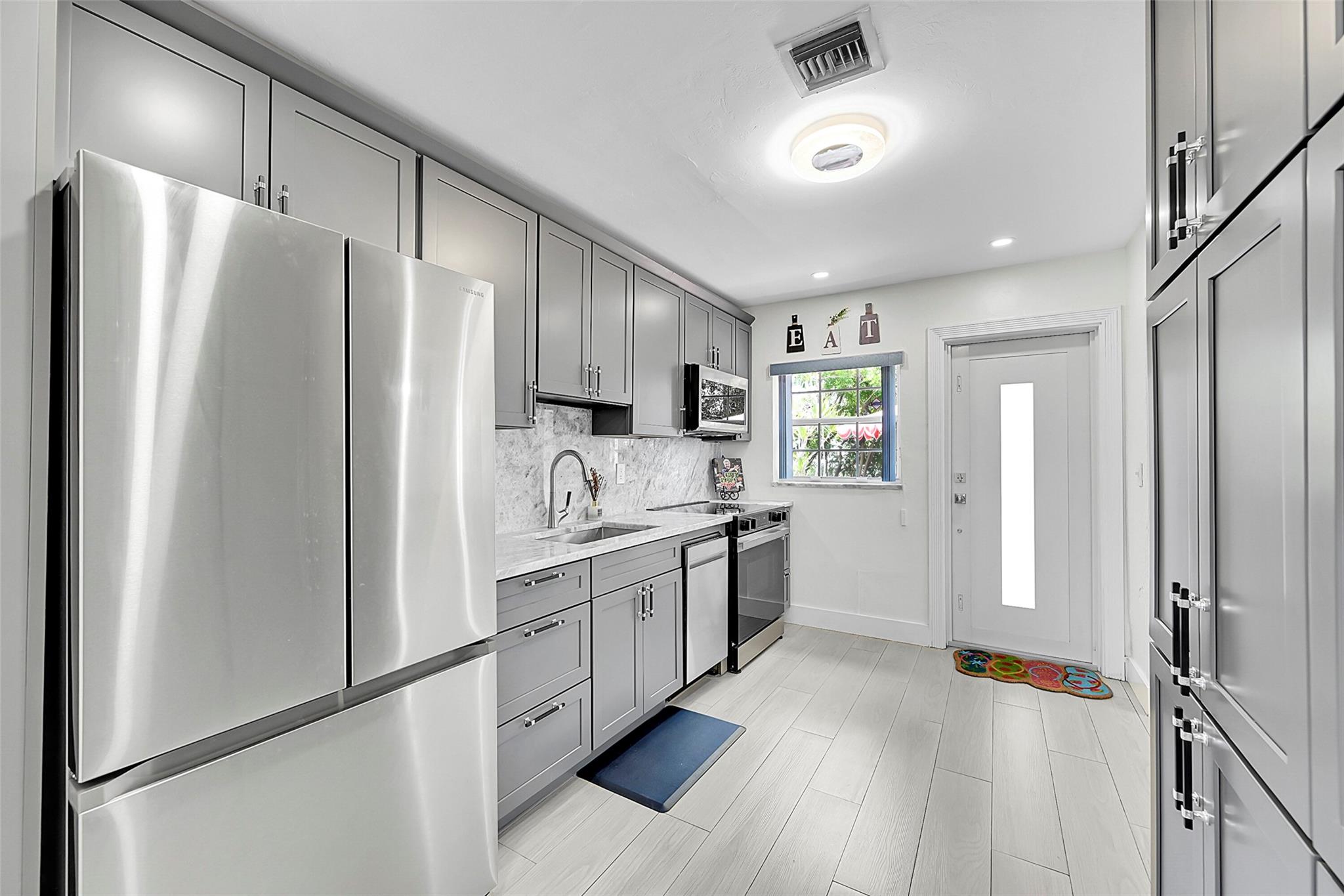 Completely renovated move in ready Oakland Park property in a great location. Nicely landscaped and freshly painted 2BR/1BA with carport and plenty of extra storage. New wood-look porcelain tile in living, dining, and kitchen, and porcelain tile in bedrooms. Kitchen is fully renovated with dark grey soft-close cabinets, new stainless appliances, and Cristallo Blue quartzite counters and backsplash. Floor-to-ceiling stacked cabinetry. Large fenced backyard perfect for a pool. Close to the beaches, downtown, restaurants, gyms, train stations, and I-95.