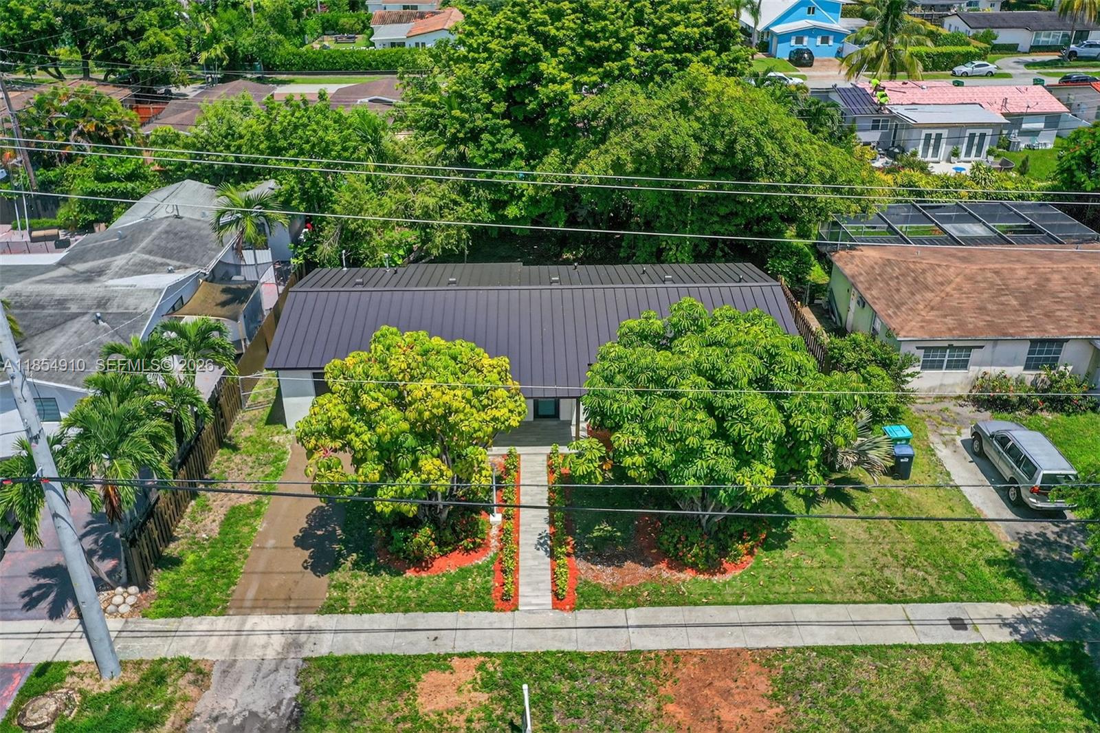 This stunning home is truly turnkey. Beautiful kitchen and bathrooms. Kitchen highlights built-in wine cooler, spacious pantry, accent wall with open shelves, custom made kitchen cabinets, quartz counter tops and stainless-steel appliances. Bathrooms nicely decorated with contemporary cabinets and hardware. Uniform slate grey tile throughout the house. Convenient split bedroom layout. Separate laundry room. New Metal Roof 2025. All impact windows and doors. The spacious backyard has plenty of room for a pool and lounge furniture. Fenced in backyard. Bigger than tax roll. Great neighborhood with nearby excellent schools, restaurants and entertainment. Must See!