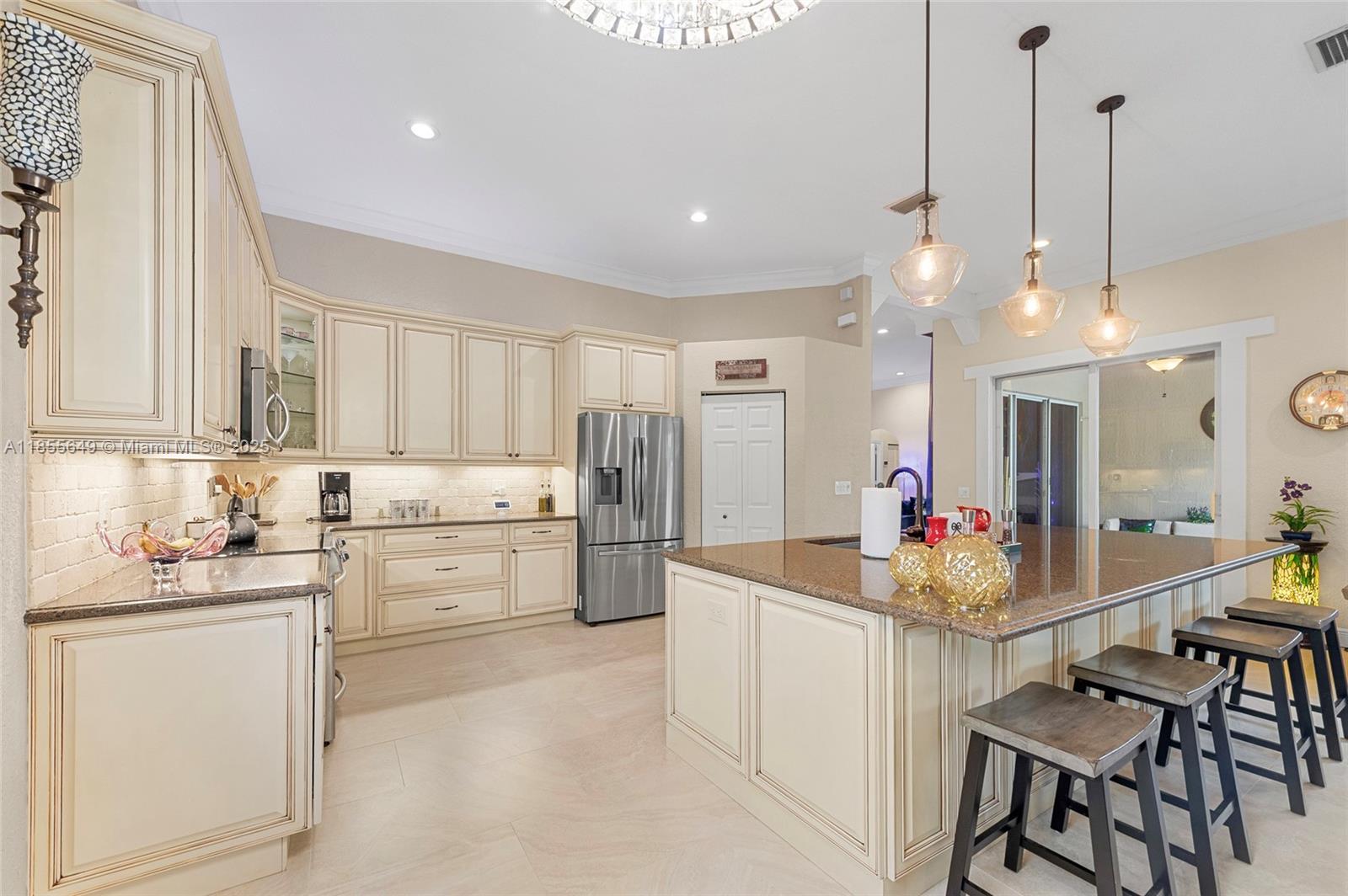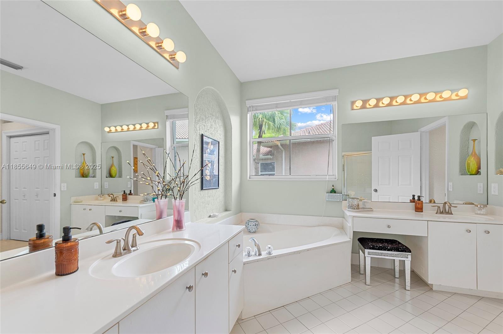Renovated one-story in gated Savanna at Weston. 4 bedrooms, 2.5 baths, 2-car garage. Private pool with paver patio, covered sitting area, and a ficus-hedged, fully fenced yard. The kitchen was remodeled with a large island, granite counters, a pantry, and stainless steel appliances. Oversized diagonal stone tile flows through all living areas and bedrooms. Volume ceilings, foyer entry, French doors, crown molding, custom lighting, and an indoor laundry room. Spacious primary with walk-in closets, Roman tub, dual sinks, and separate shower. Full accordion shutter protection. Stroll over to Savanna’s community center with a heated lap pool and waterslide, and the clubhouse with a restaurant, tennis, pickleball, and more.