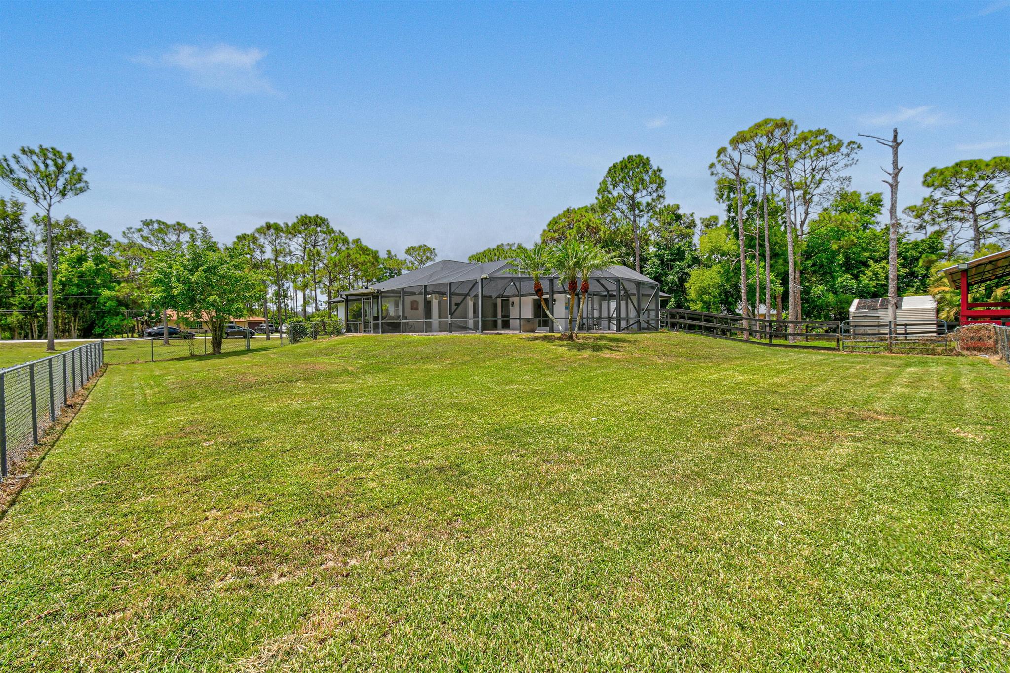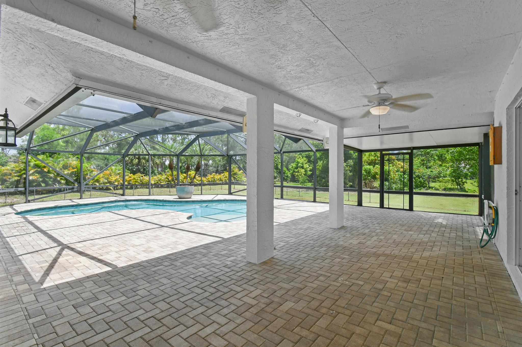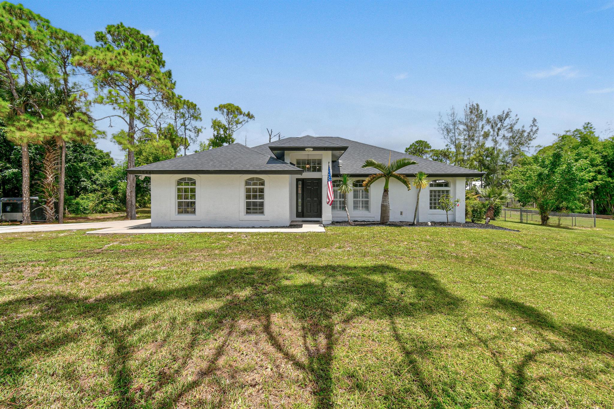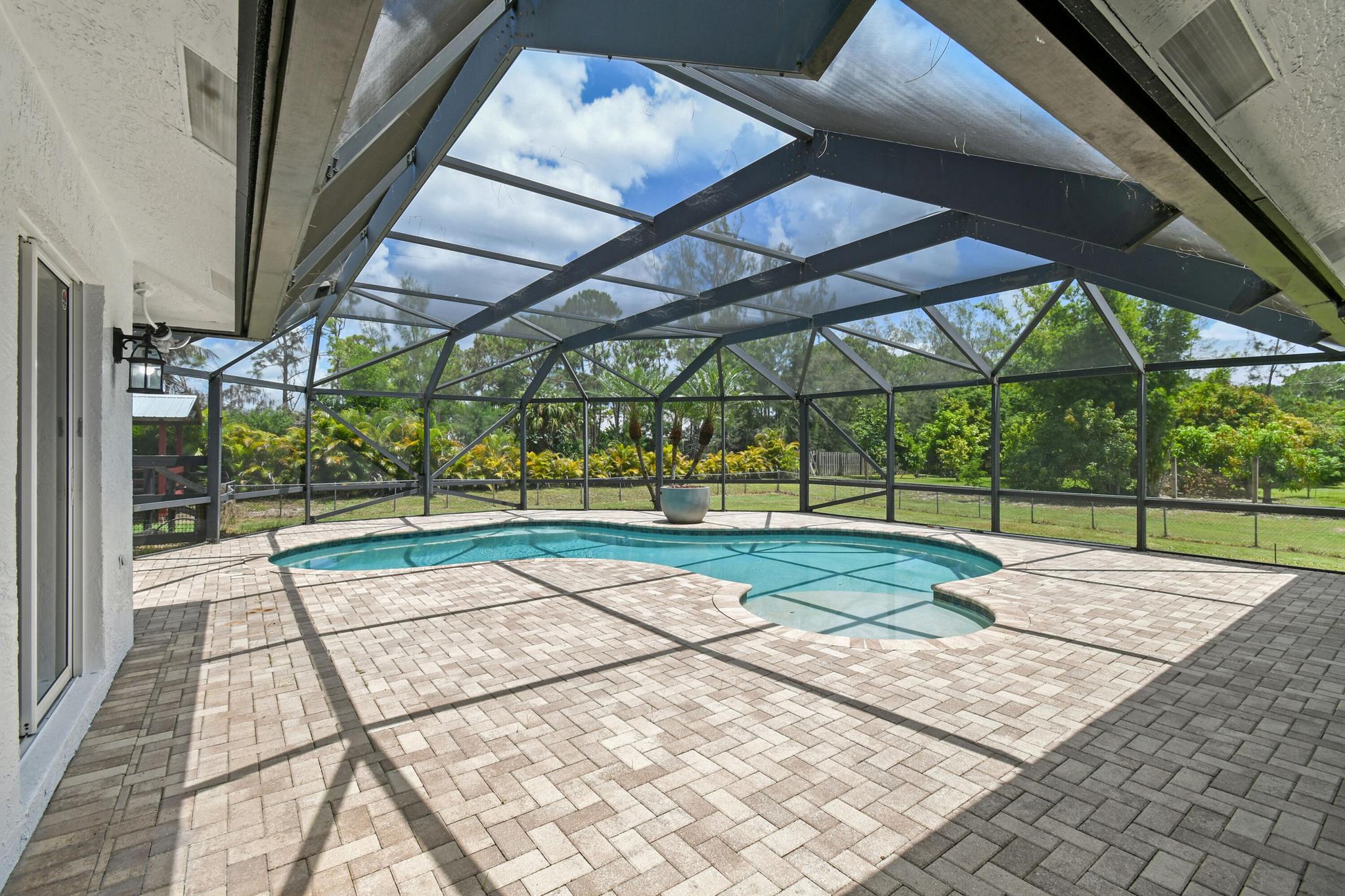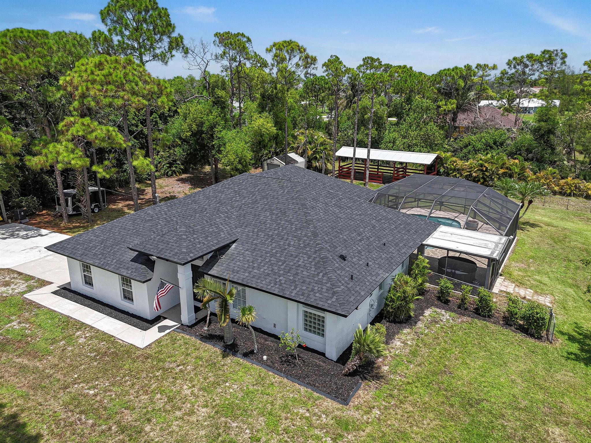 1.29 acres of upgraded Acreage living -- turnkey, private, and equestrian-ready. This CBS 4-bedroom pool home offers a rare combination of land, lifestyle, and location in one of the most desirable pockets of The Acreage. With a brand-new roof, new HVAC system, updated water system, and a refreshed black-and-white exterior, the property delivers immediate peace of mind and long-term value.Inside, vaulted ceilings and wide, connected living spaces create an airy, open feel. The 2020 family room flows into a screened-in pool area with over 1,600 sq ft of covered outdoor living -- perfect for entertaining or everyday relaxation. The pool enclosure features solar-ready heating, a cabana bath, and a lifetime structural warranty. The split-bedroom layout provides privacy, while the