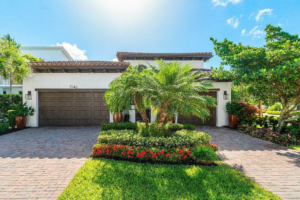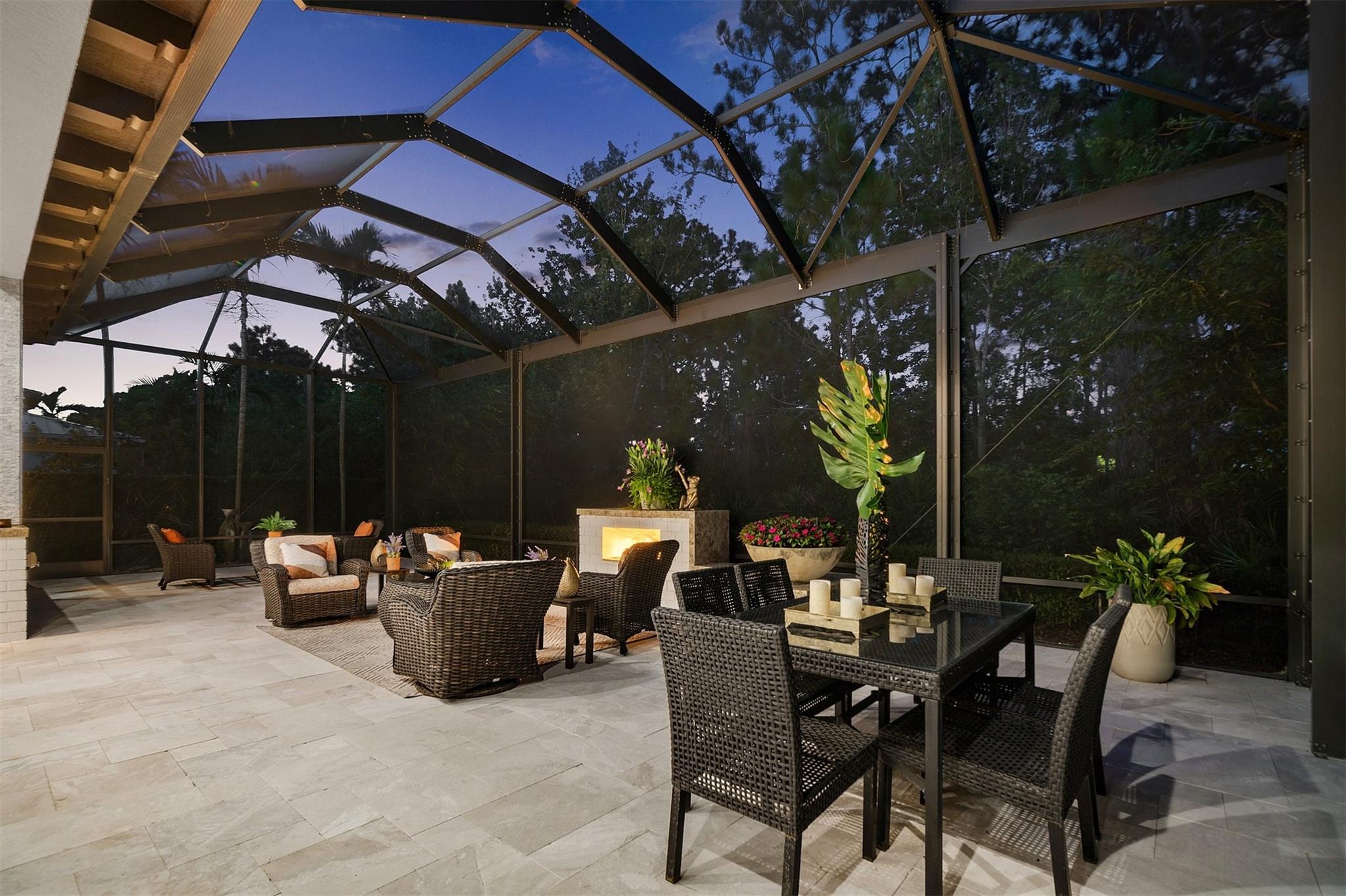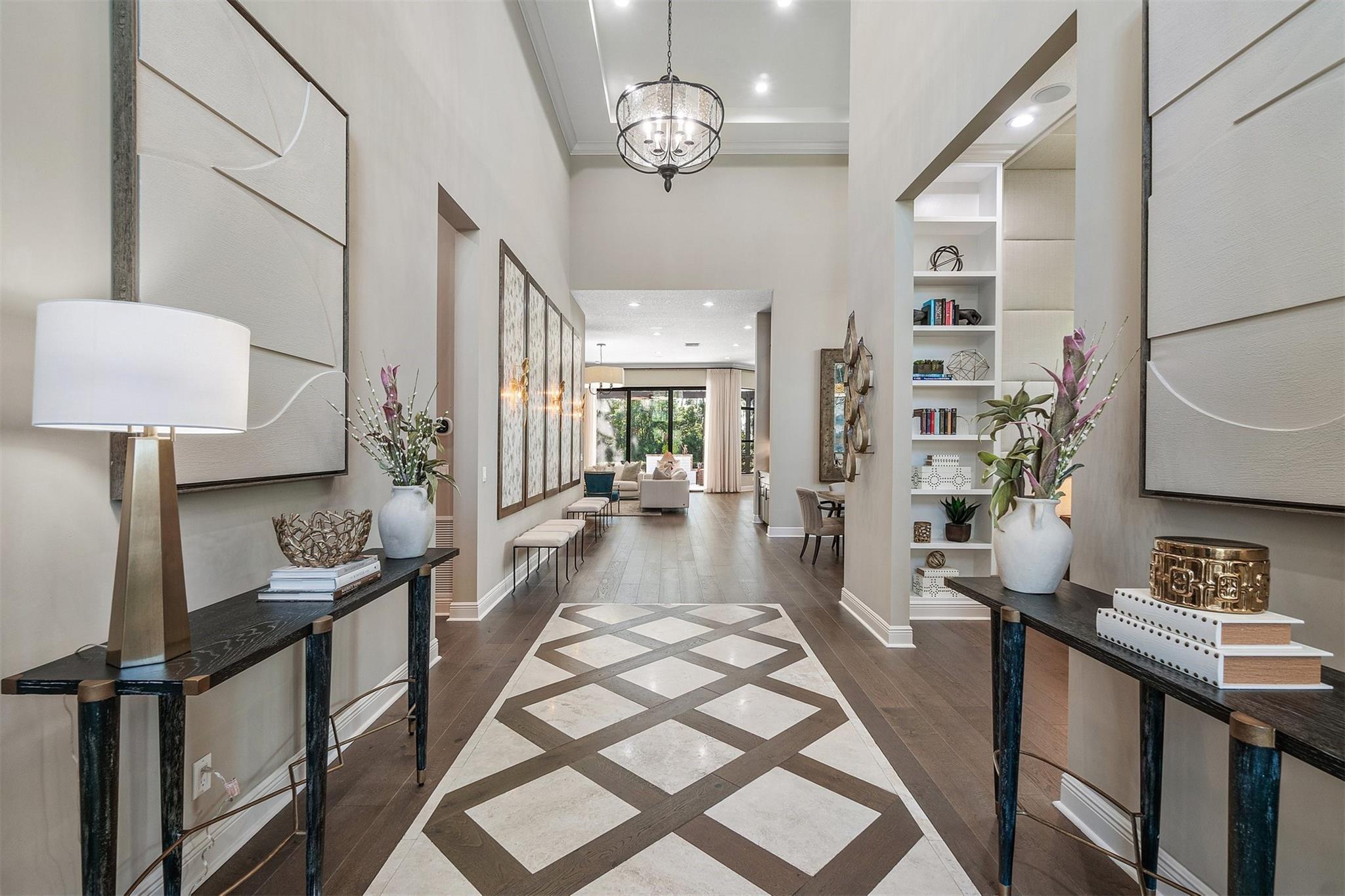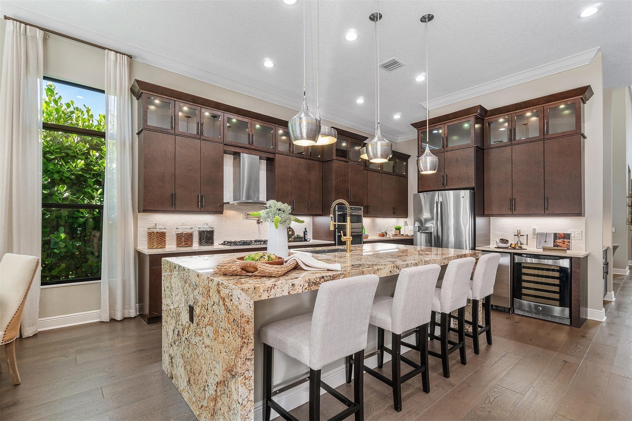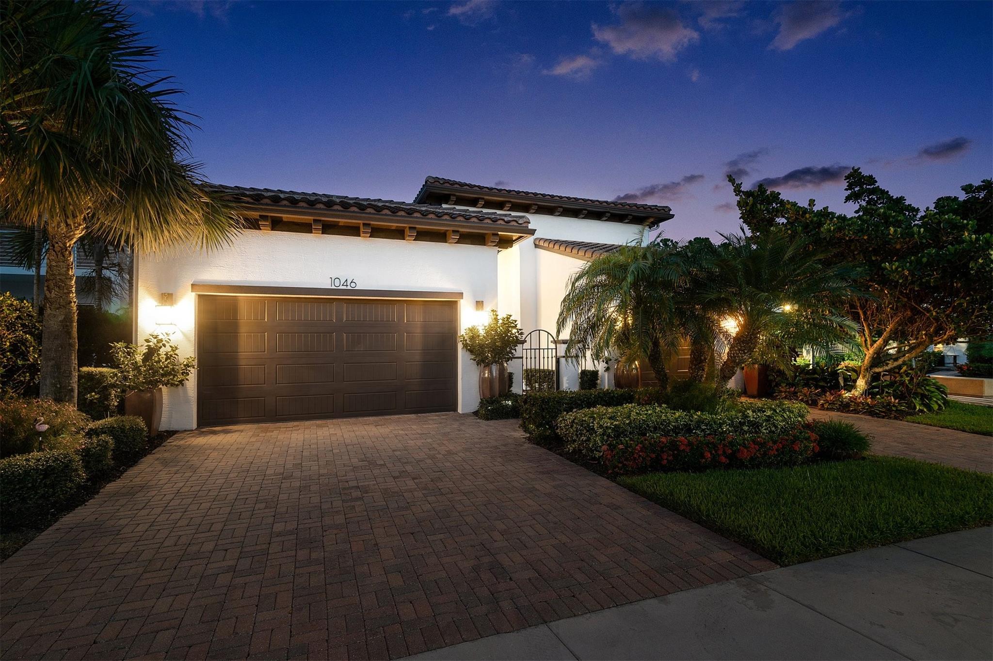 Offered Fully furnished and accessorized. Welcome to 1046 Faulkner Terrace - where designer upgrades, high end furnishings create a unique and elevated Florida lifestyle This former builder’s model stuns at every turn with over 2,800 sq ft of expertly curated interiors on a private preserve and corner lot. From the travertine-inlaid foyer with a beamed 19.5-foot ceiling, no detail was overlooked. The gourmet kitchen features a dramatic waterfall island, double-stacked KitchenCraft cabinetry with glass uppers and puck lighting, GE Profile appliances, and a pot filler over the 30" gas cooktop.