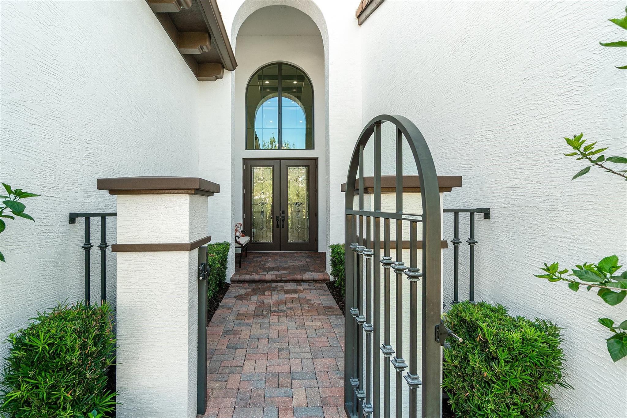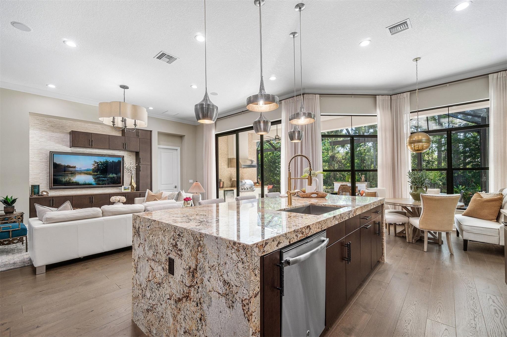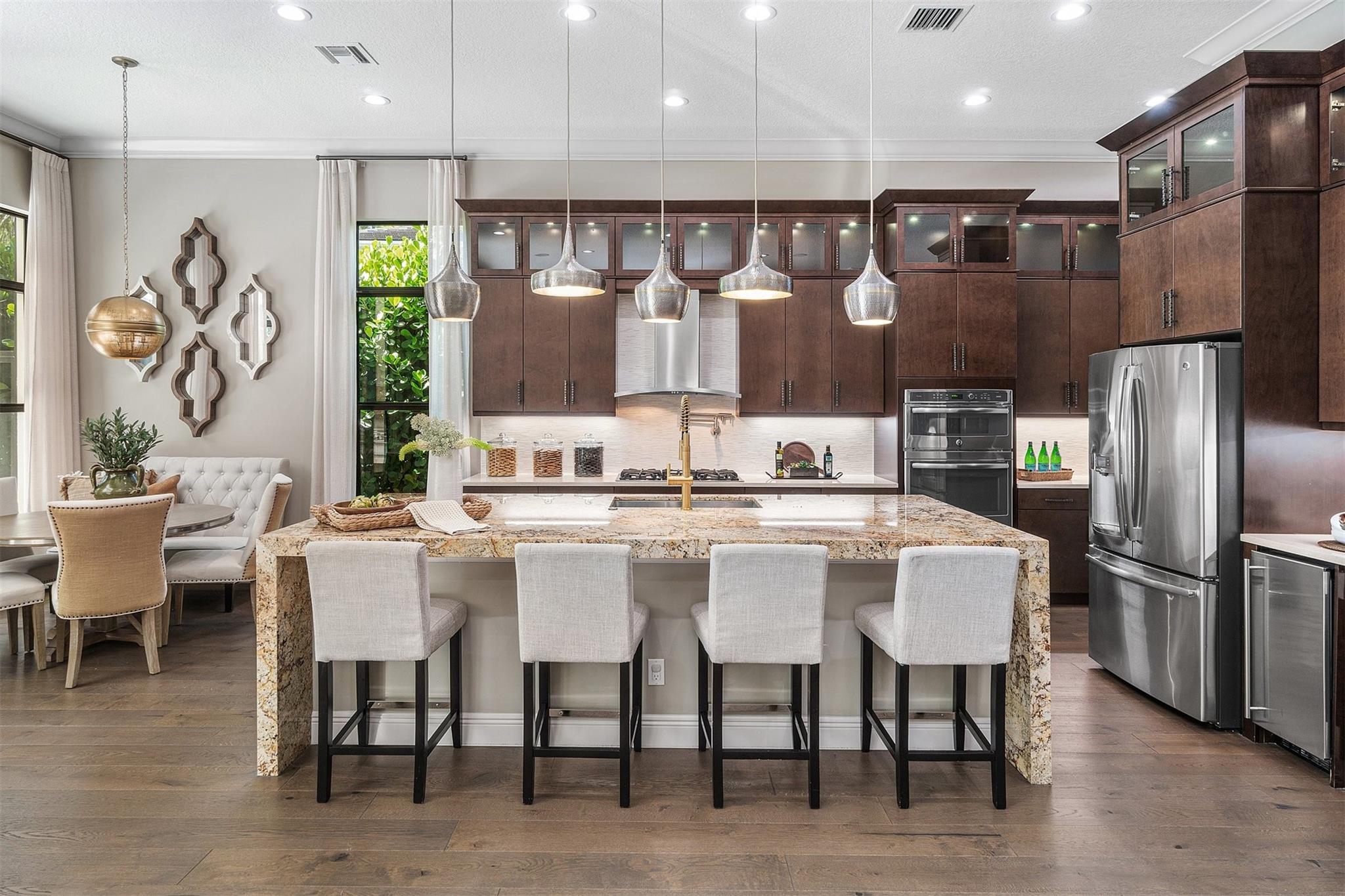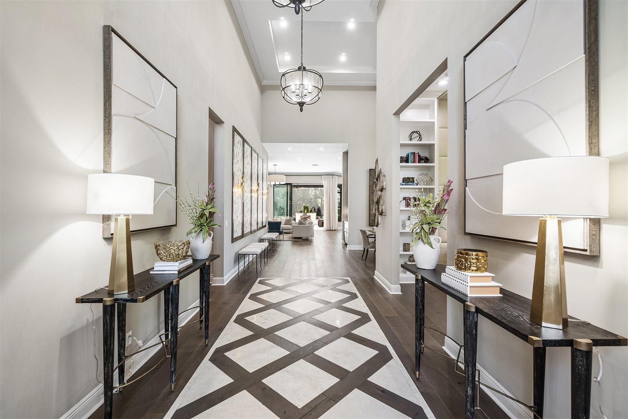 Offered Fully furnished and accessorized. Welcome to 1046 Faulkner Terrace - where designer upgrades, high end furnishings create a unique and elevated Florida lifestyle This former builder’s model stuns at every turn with over 2,800 sq ft of expertly curated interiors on a private preserve and corner lot. From the travertine-inlaid foyer with a beamed 19.5-foot ceiling, no detail was overlooked. The gourmet kitchen features a dramatic waterfall island, double-stacked KitchenCraft cabinetry with glass uppers and puck lighting, GE Profile appliances, and a pot filler over the 30" gas cooktop.