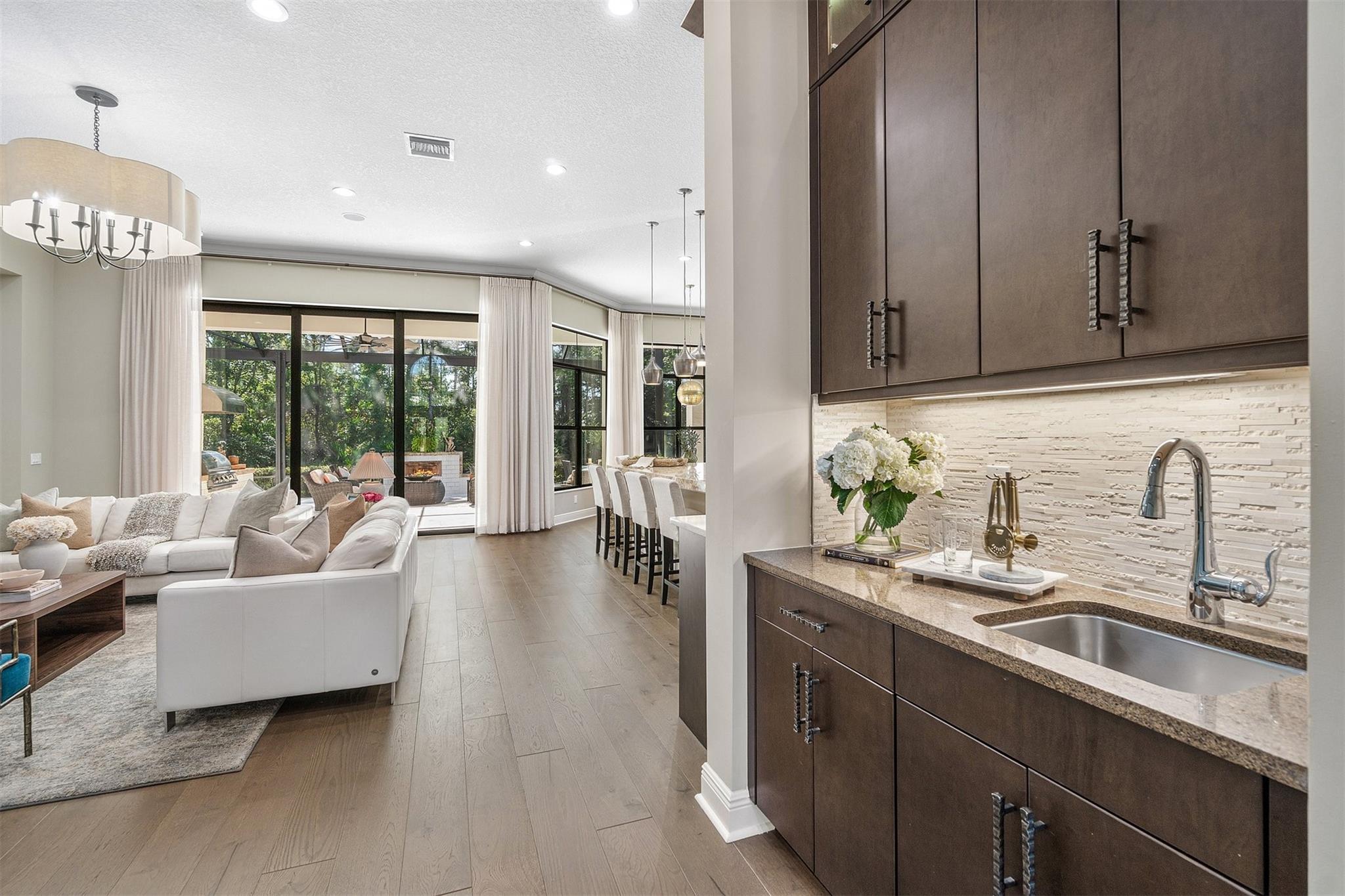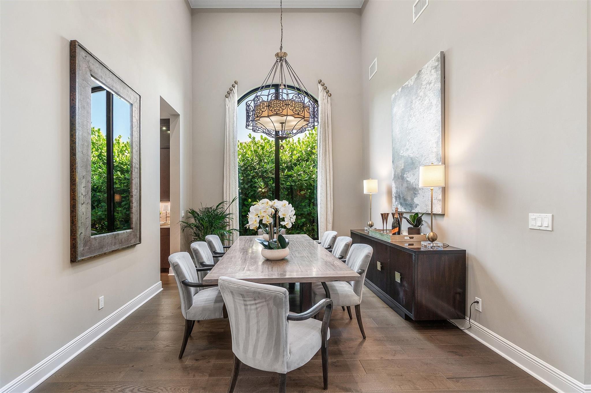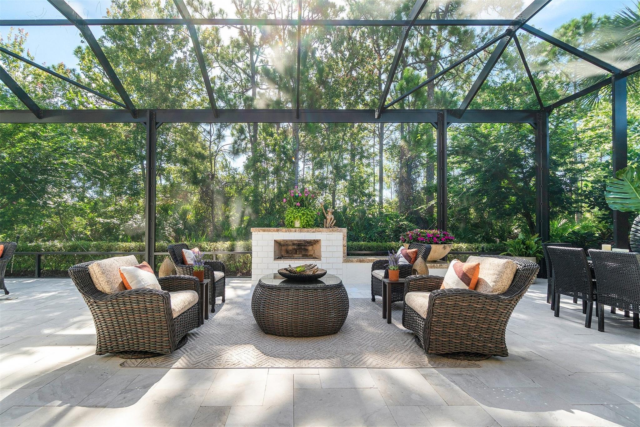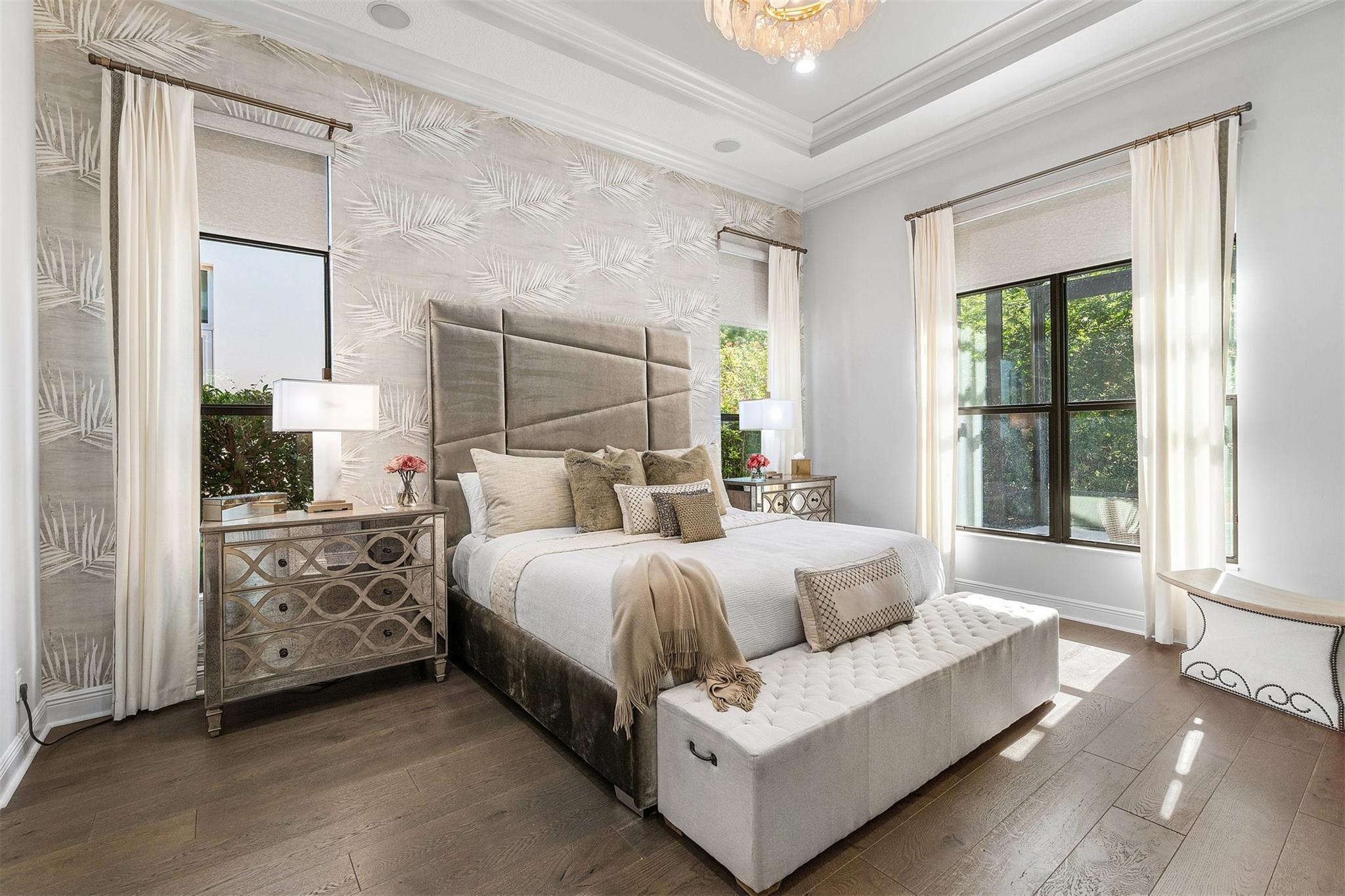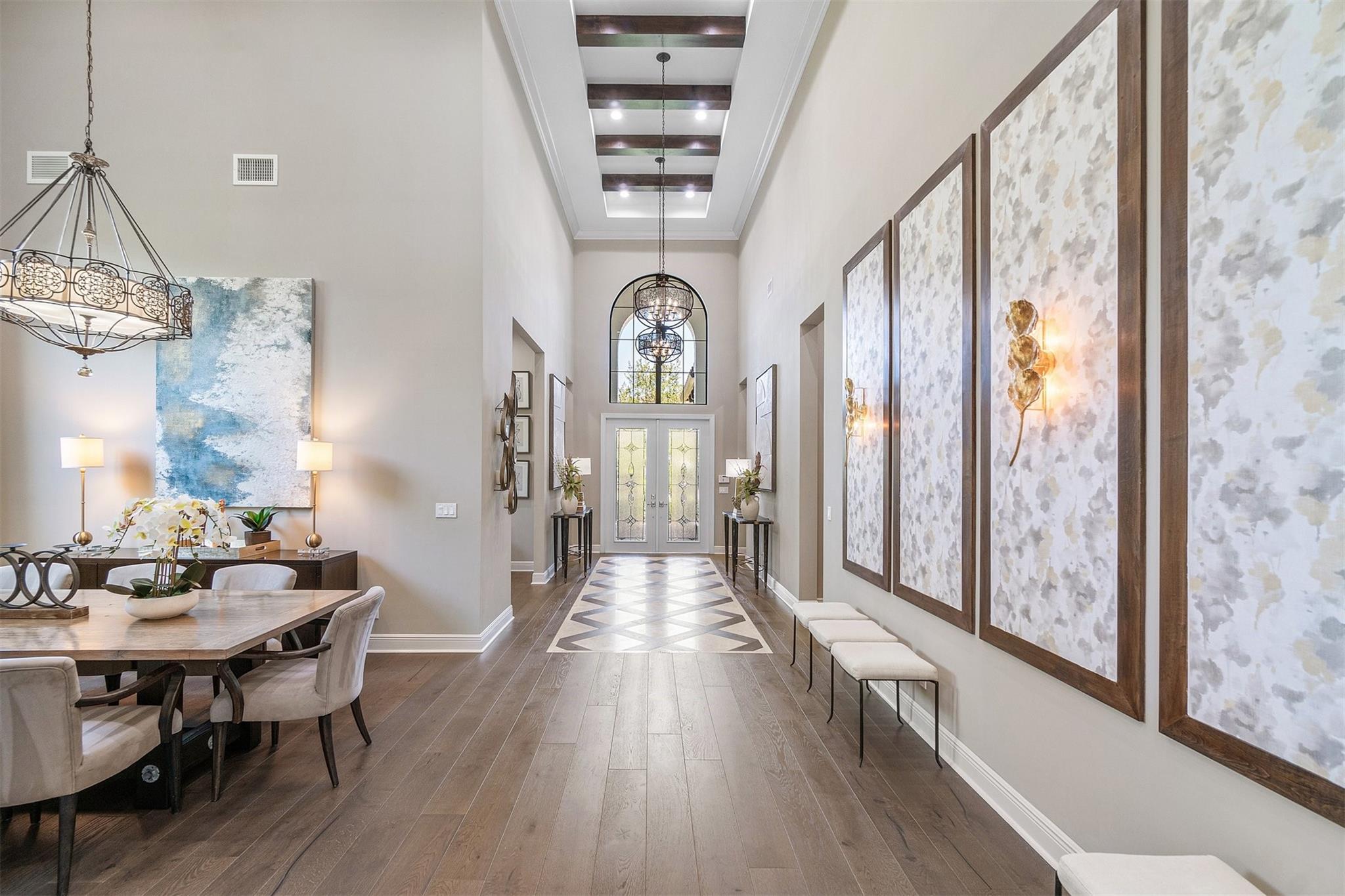 Offered Fully furnished and accessorized. Welcome to 1046 Faulkner Terrace - where designer upgrades, high end furnishings create a unique and elevated Florida lifestyle This former builder’s model stuns at every turn with over 2,800 sq ft of expertly curated interiors on a private preserve and corner lot. From the travertine-inlaid foyer with a beamed 19.5-foot ceiling, no detail was overlooked. The gourmet kitchen features a dramatic waterfall island, double-stacked KitchenCraft cabinetry with glass uppers and puck lighting, GE Profile appliances, and a pot filler over the 30" gas cooktop.