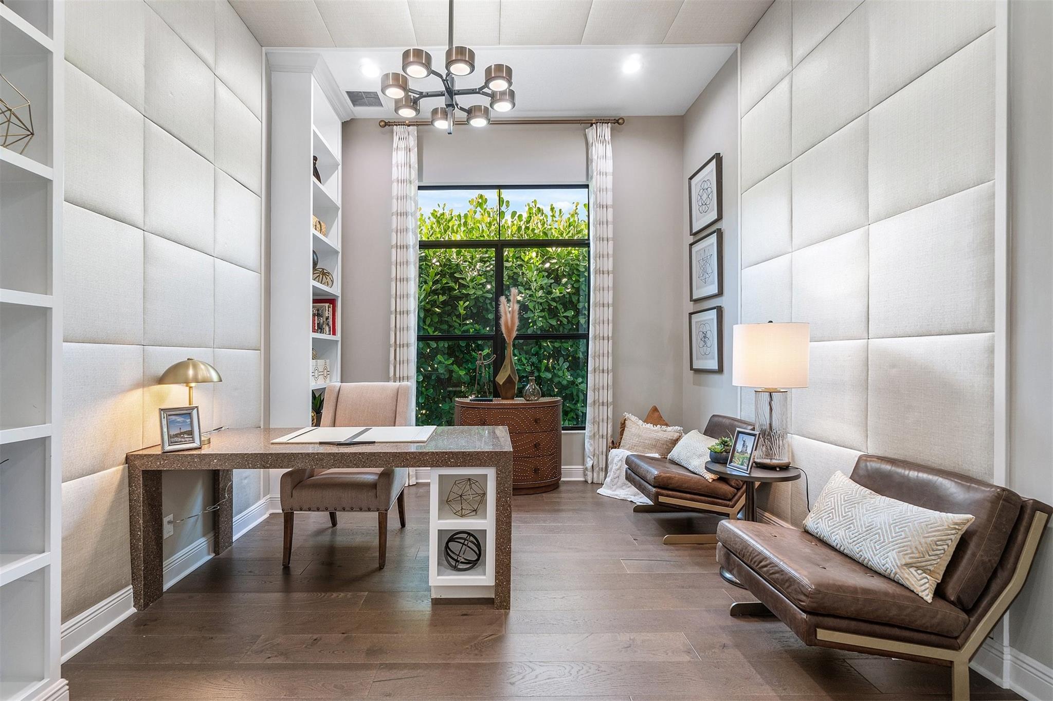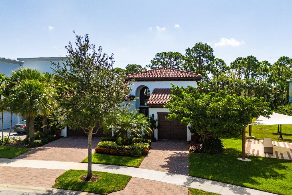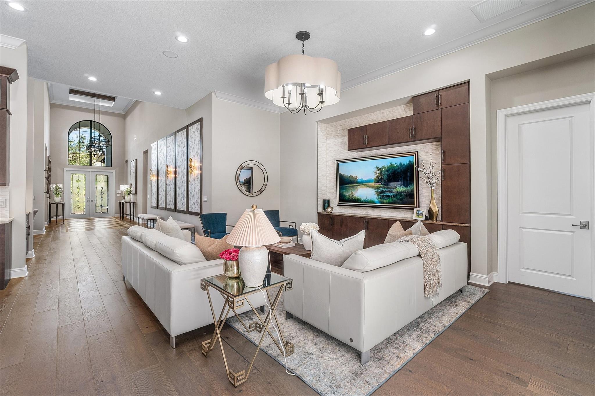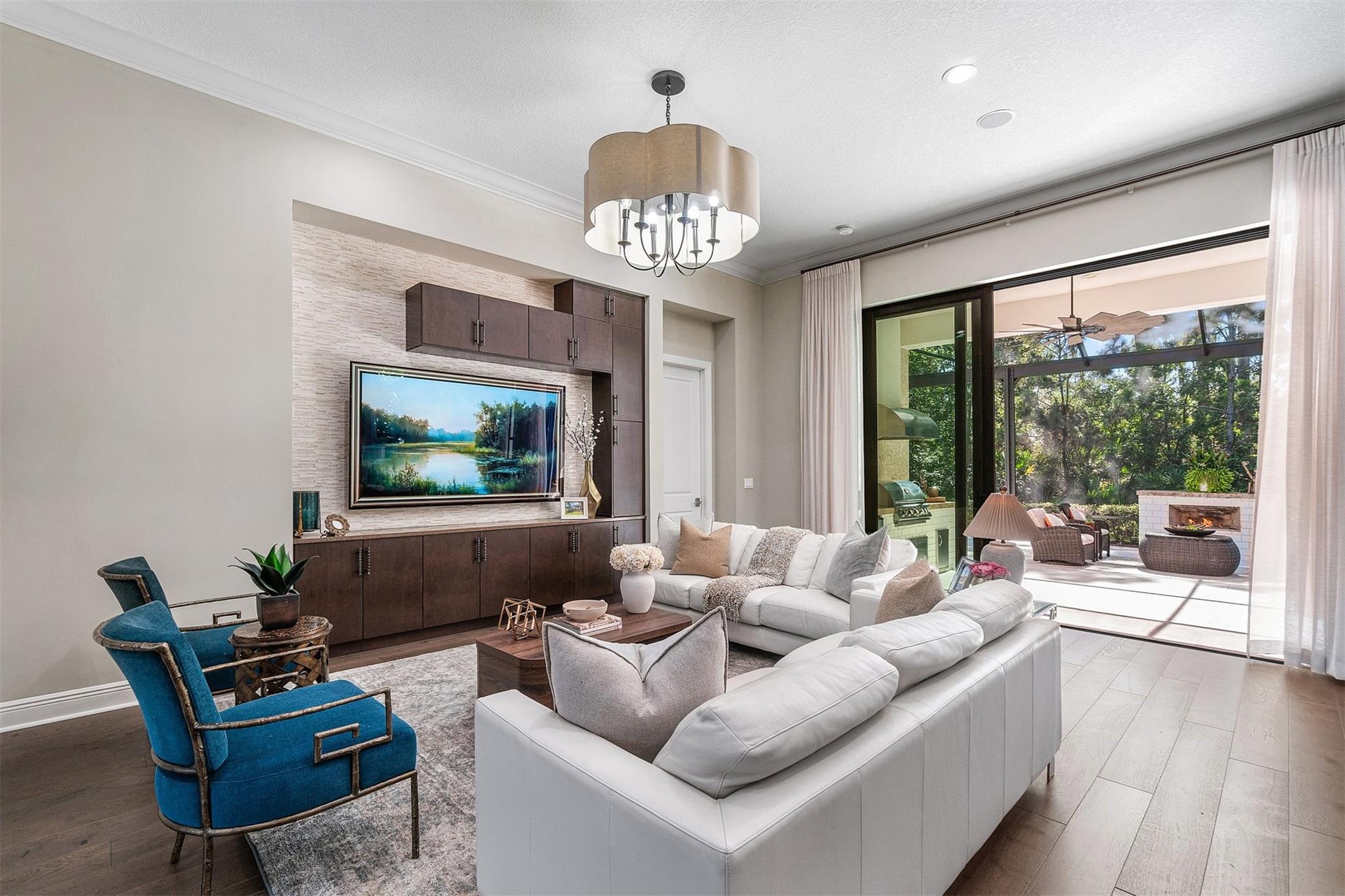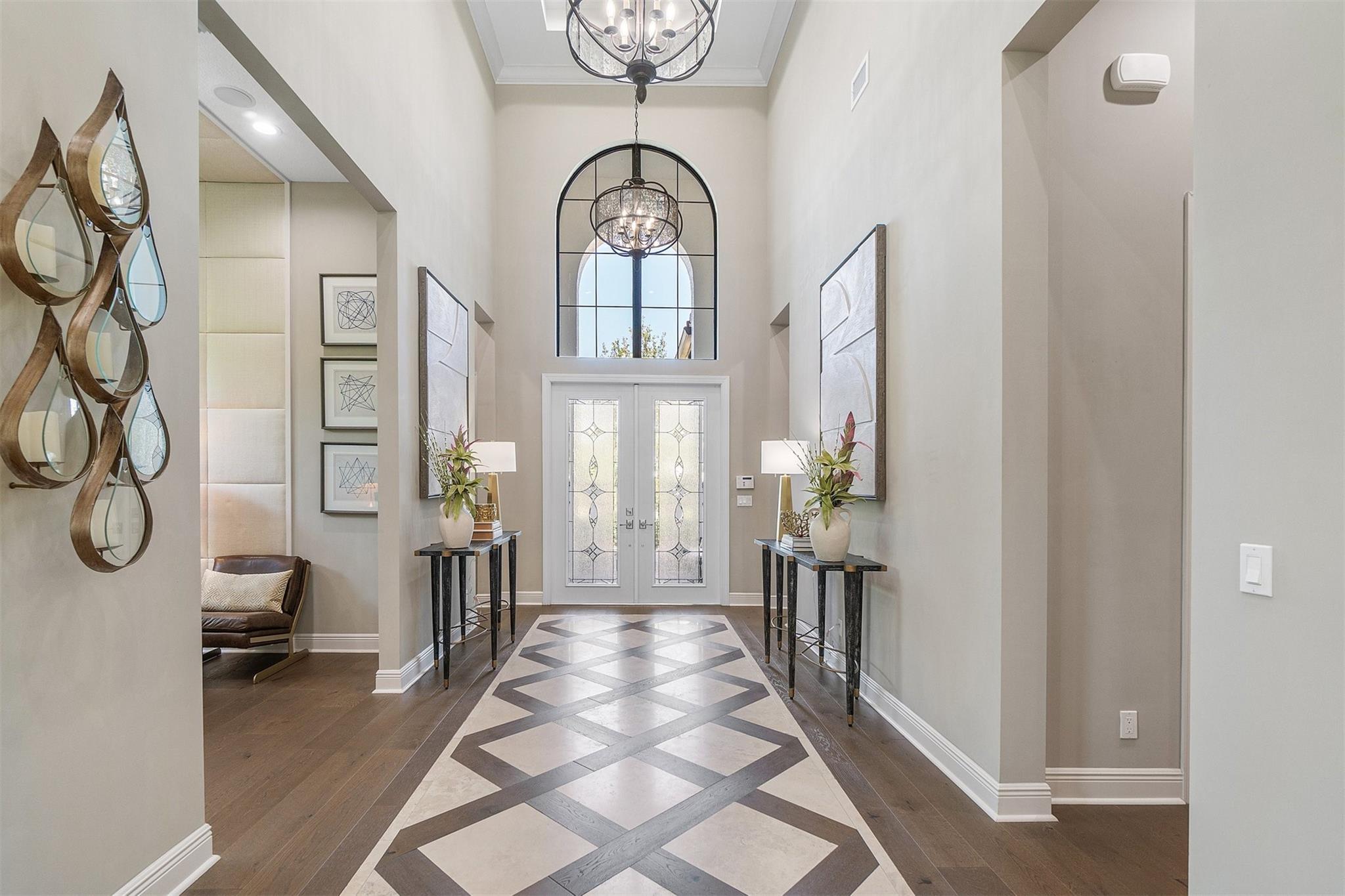 Offered Fully furnished and accessorized. Welcome to 1046 Faulkner Terrace - where designer upgrades, high end furnishings create a unique and elevated Florida lifestyle This former builder’s model stuns at every turn with over 2,800 sq ft of expertly curated interiors on a private preserve and corner lot. From the travertine-inlaid foyer with a beamed 19.5-foot ceiling, no detail was overlooked. The gourmet kitchen features a dramatic waterfall island, double-stacked KitchenCraft cabinetry with glass uppers and puck lighting, GE Profile appliances, and a pot filler over the 30" gas cooktop.