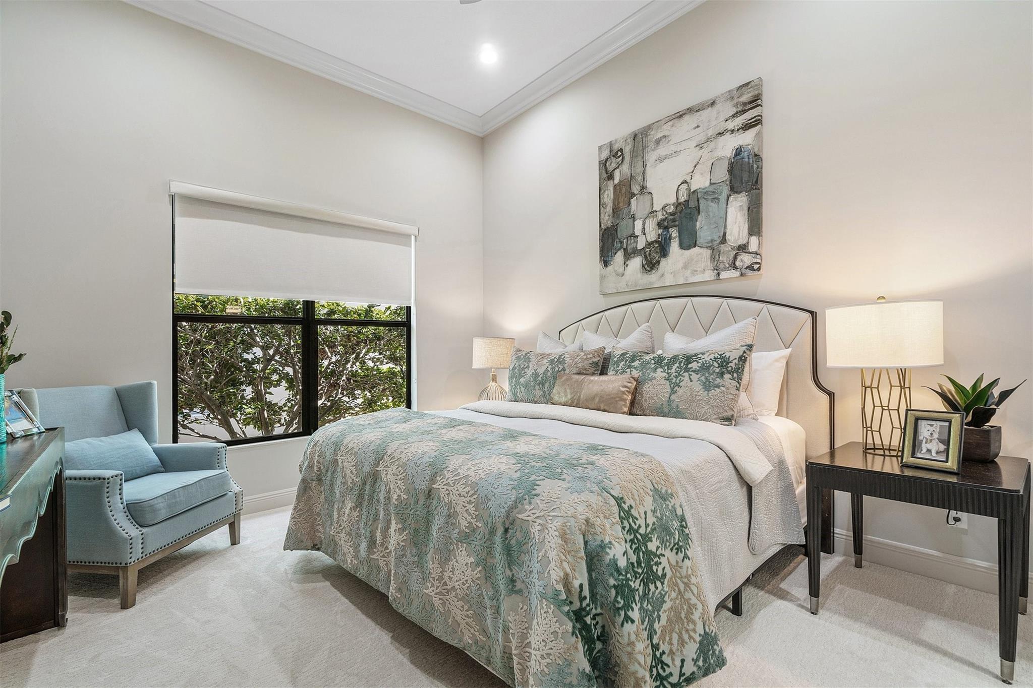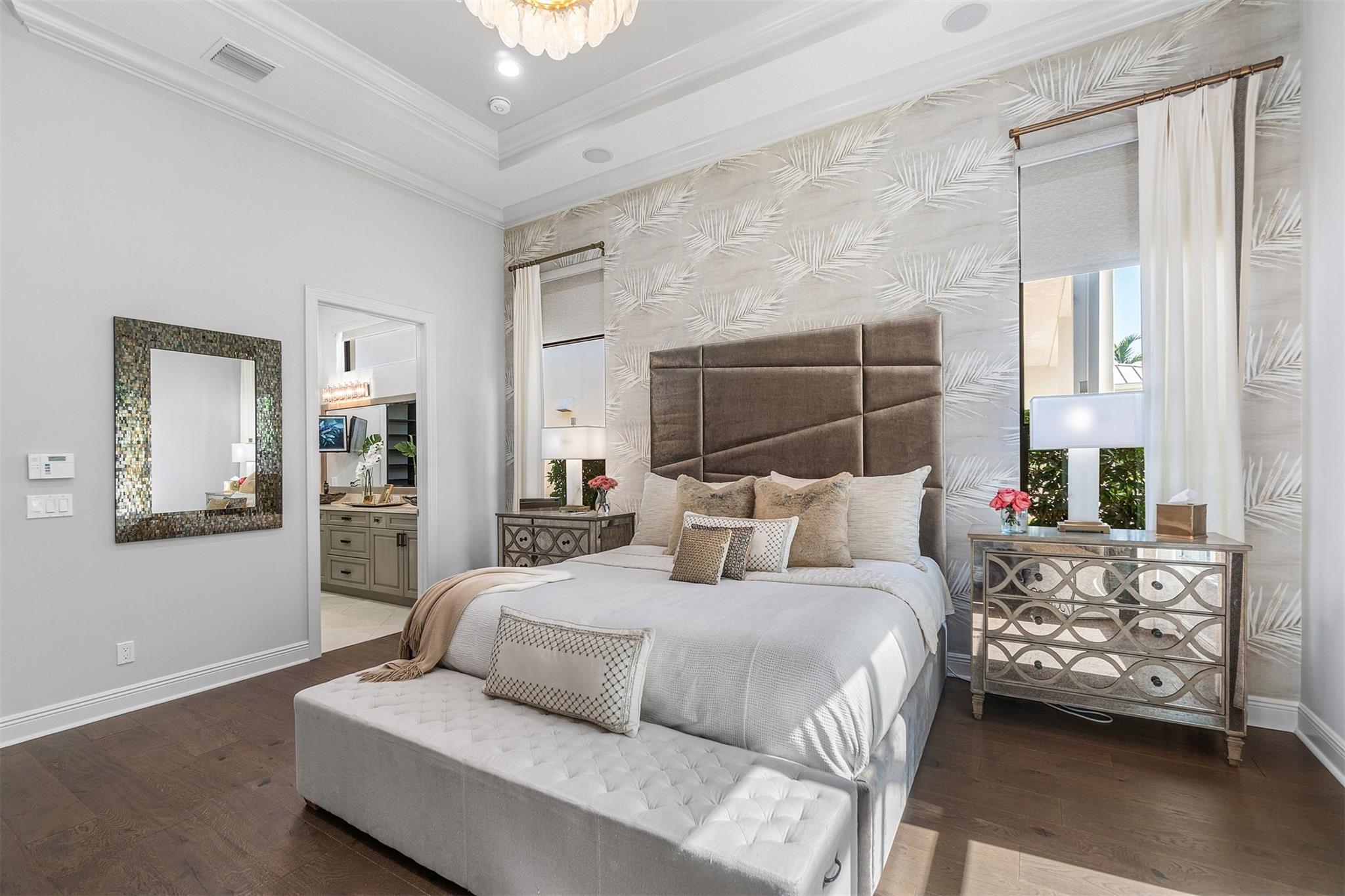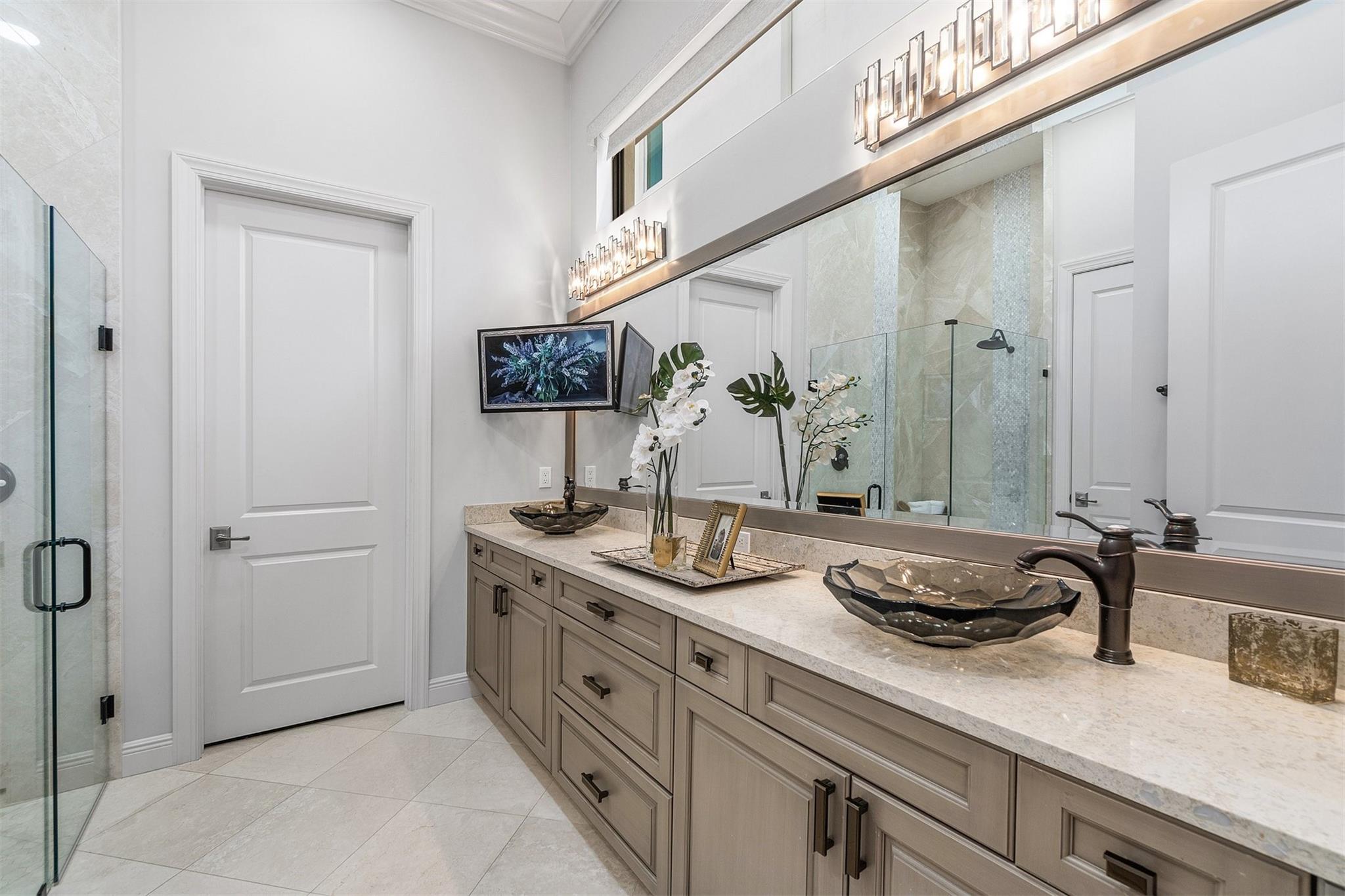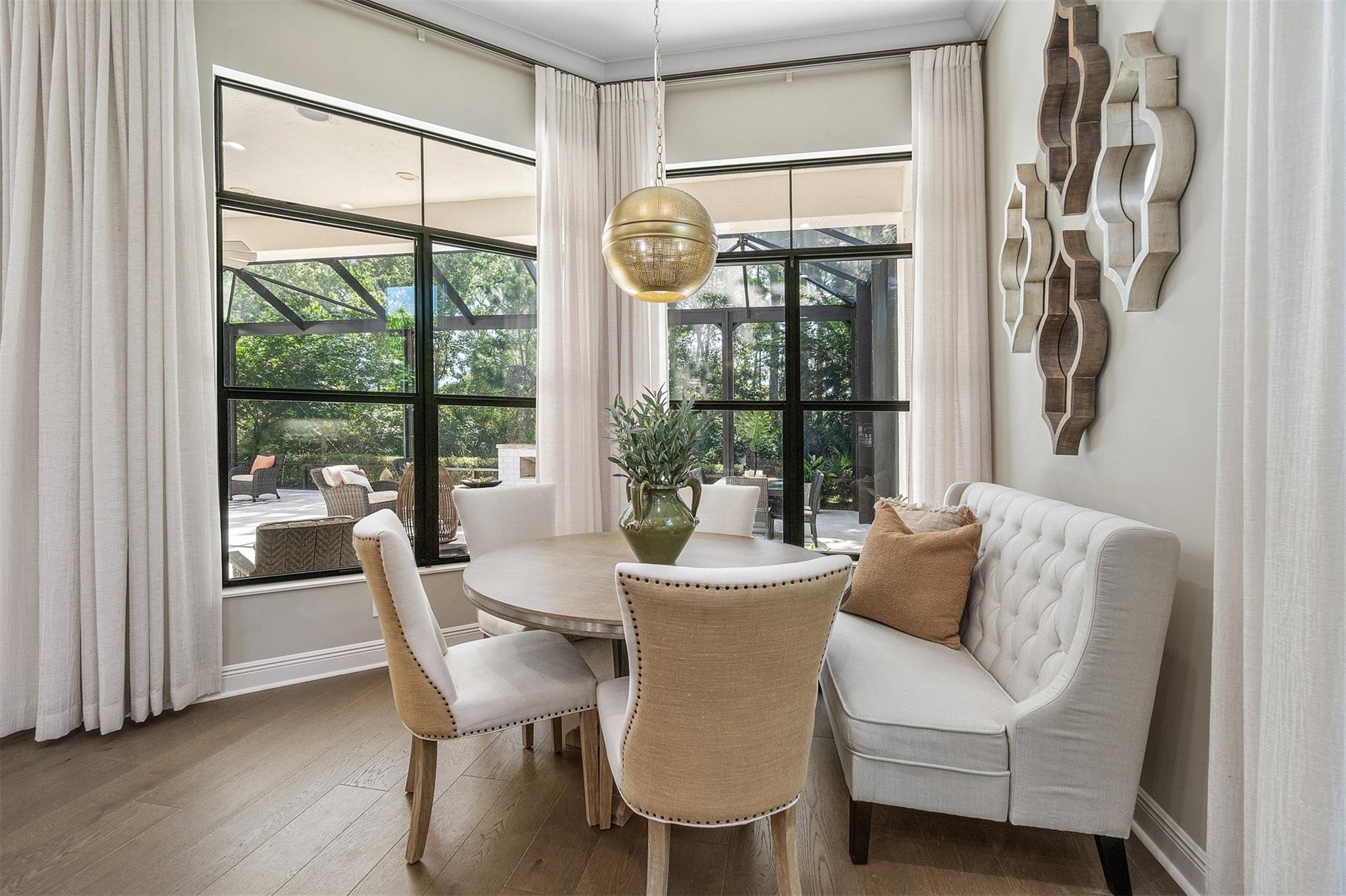 Offered Fully furnished and accessorized. Welcome to 1046 Faulkner Terrace - where designer upgrades, high end furnishings create a unique and elevated Florida lifestyle This former builder’s model stuns at every turn with over 2,800 sq ft of expertly curated interiors on a private preserve and corner lot. From the travertine-inlaid foyer with a beamed 19.5-foot ceiling, no detail was overlooked. The gourmet kitchen features a dramatic waterfall island, double-stacked KitchenCraft cabinetry with glass uppers and puck lighting, GE Profile appliances, and a pot filler over the 30" gas cooktop.