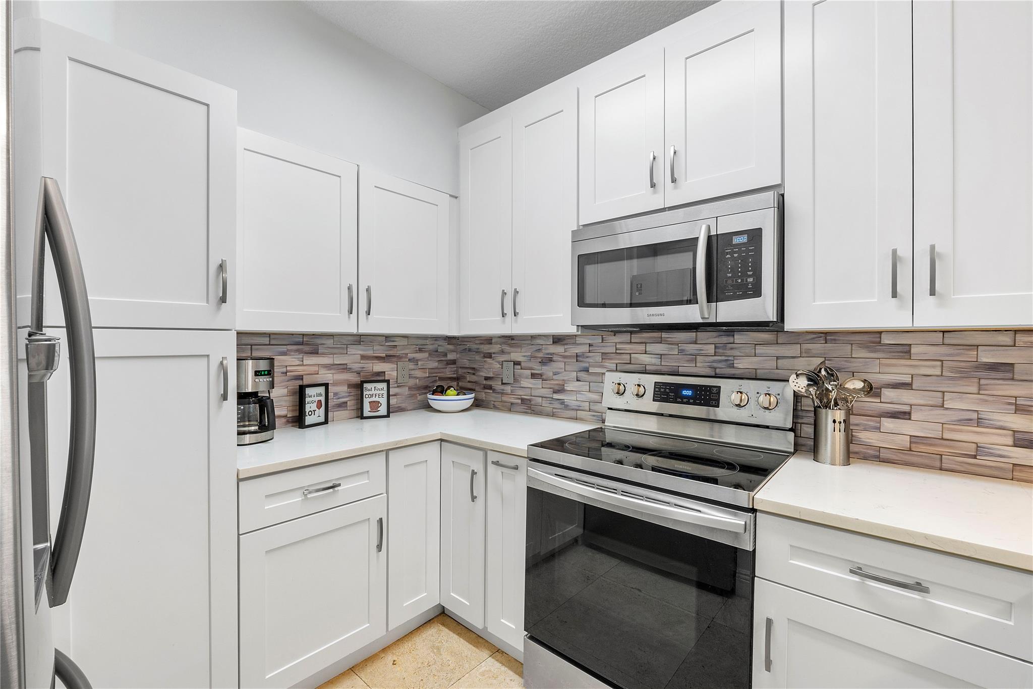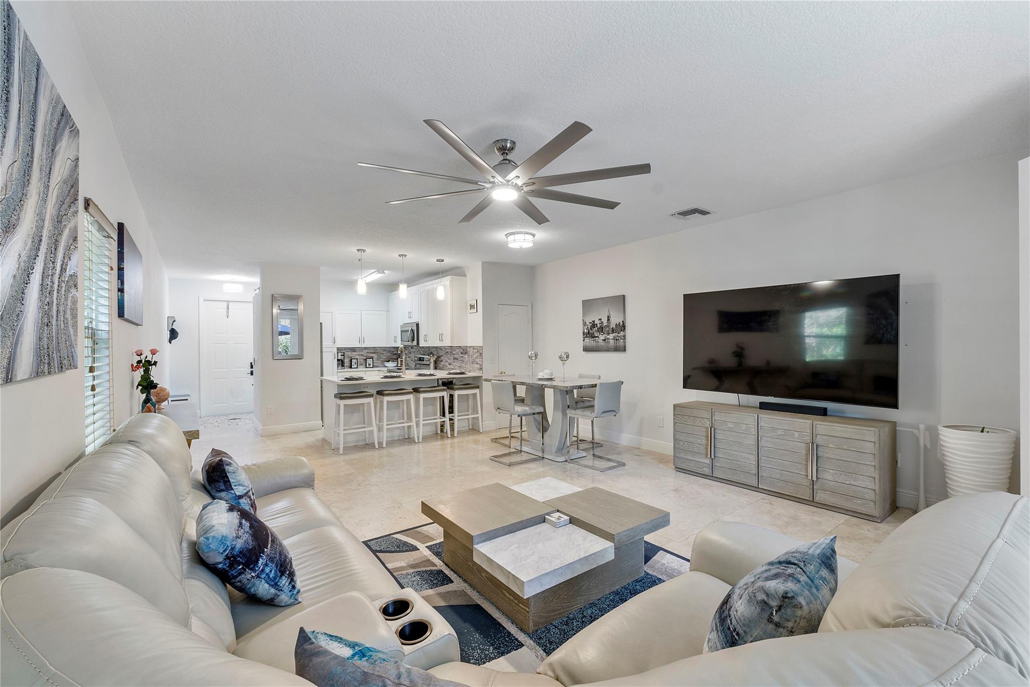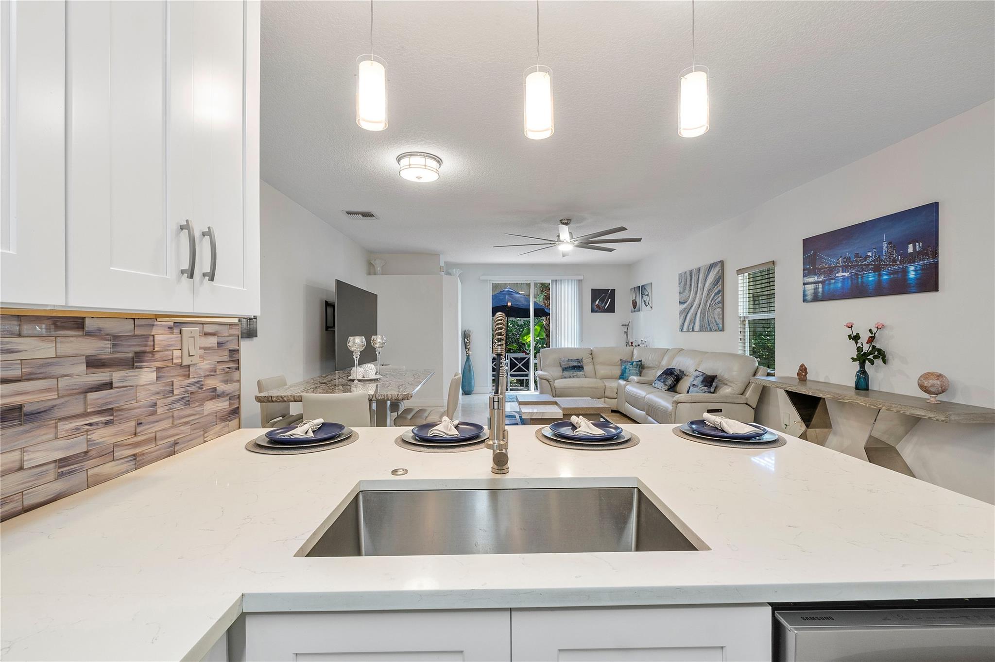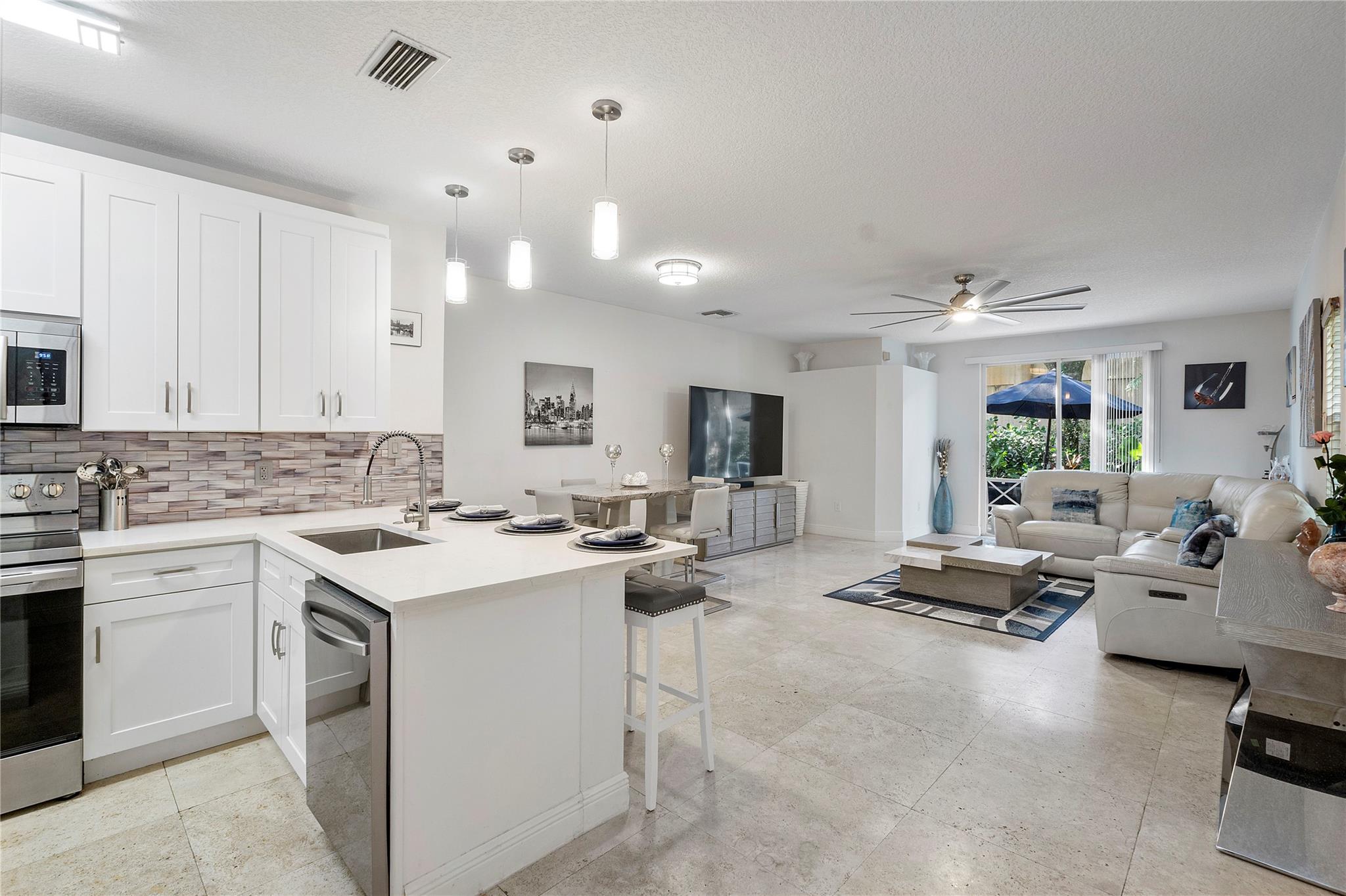 Bright and Spacious corner townhome with extra windows for natural light! This 3 bedroom, 2.5 bathroom gem in the gated community of Victoria Isles features a new roof, new custom kitchen with quartz countertops, new smudge-free stainless appliances, bar counter seating & built-in wine cooler, new water heater, new water resistant laminate flooring upstairs, marble downstairs, new washer & dryer, new lighting & ceiling fans, newer AC, recently updated master shower and more! Open living area looks out to the back patio and overlooks a nature preserve. No rear neighbors. 2 parking spaces at front door! Bonus exterior storage room. 100% storm shutters. Low HOA Fee covers gate & app, security, alarm, exterior & paint, landscaping, pool, clubhouse. Close to Promenade, highways and more!