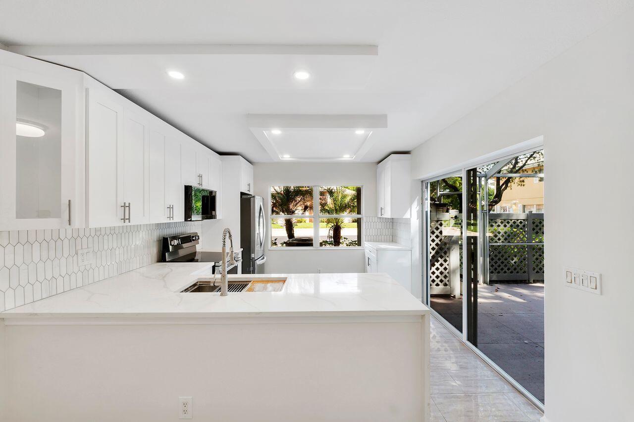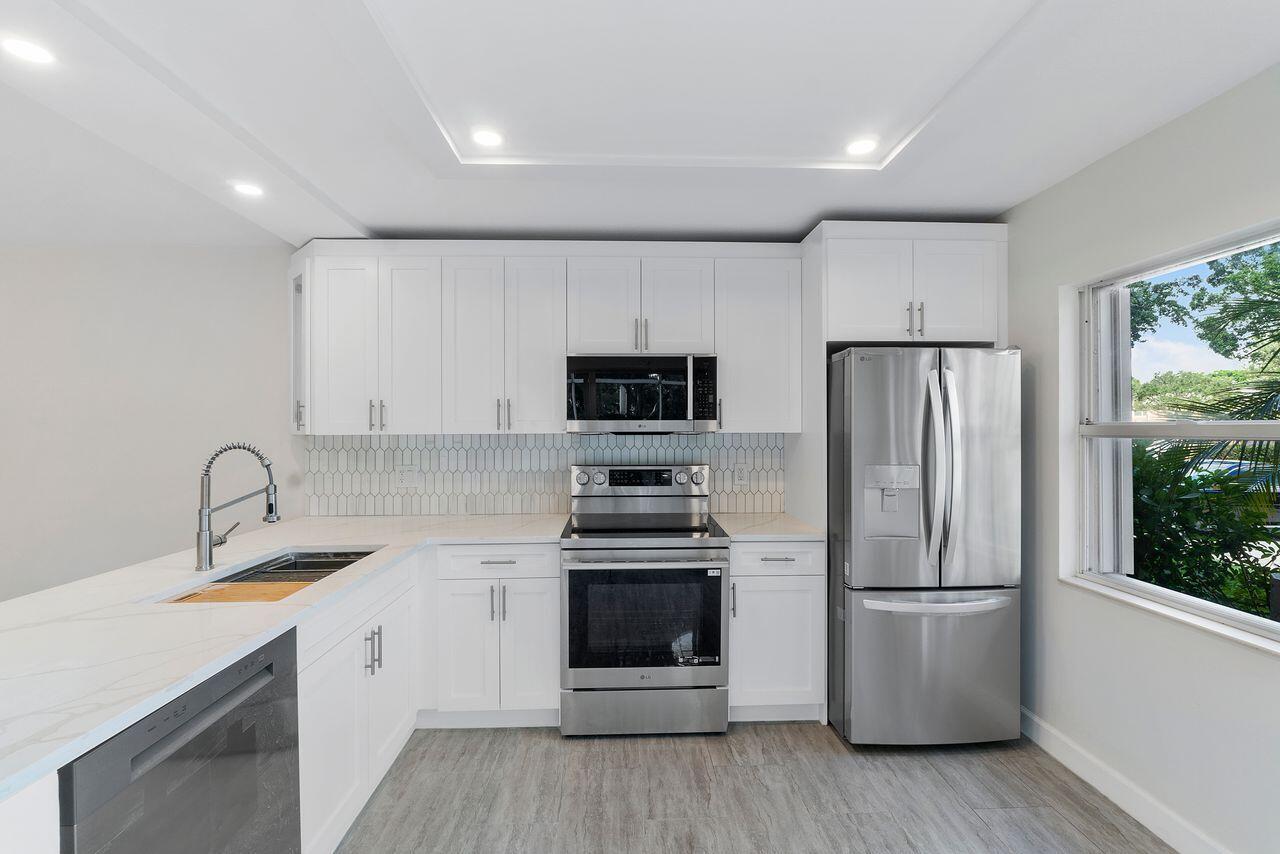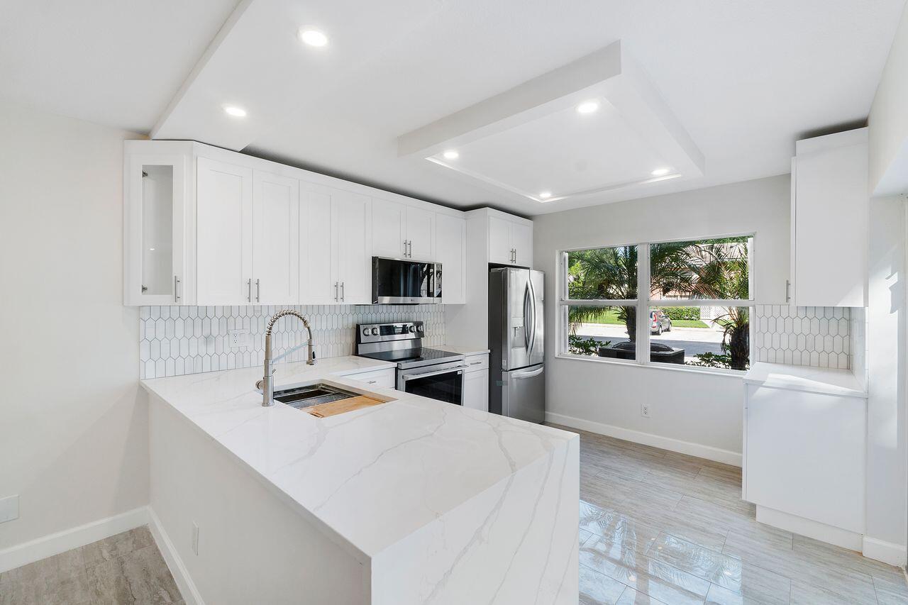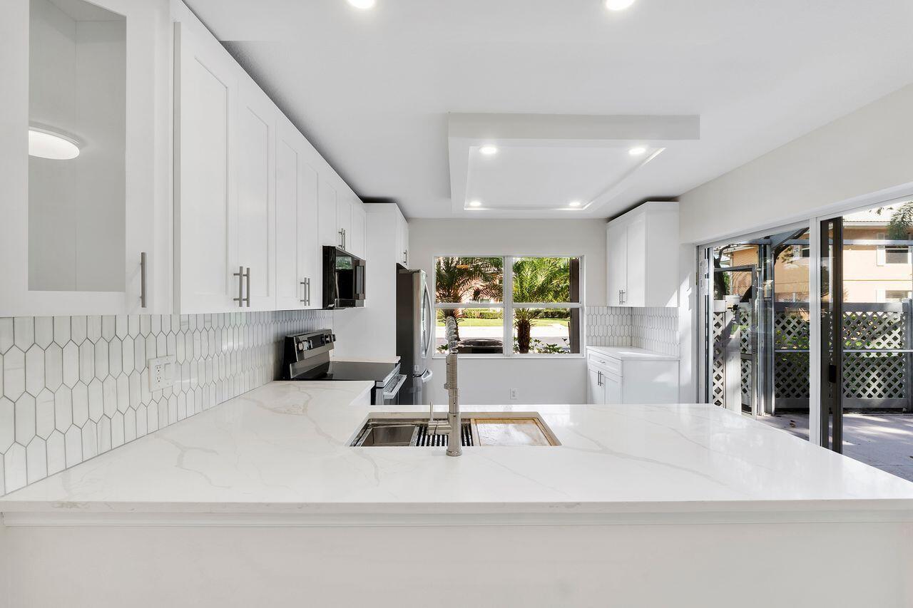 SELLERS ACCEPTING BACK UP OFFERS, This beautiful townhome with a newly renovated kitchen has white wood Shaker cabinetry, quartz counters & brand new stainless LG appliances. The first floor features the living, dining area, 1/2 bath & laundry (new washer/dryer). Beautiful neutral tile laid in a staggered pattern is throughout the main level. There's an impact slider off the kitchen & another impact window in the living room. All other windows (w/exception of upstairs BA) have accordian shutters. 2nd floor has neutral laminate flooring, 2 generous sized bedrooms w/ensuite remodeled bathrooms. No popcorn ceilings throughout! 2024 A/C & 2023 water heater. Located in a peaceful setting on a quiet cul-de-sac. Community is close to the Palm Beach Outlet Mall & great restaurants