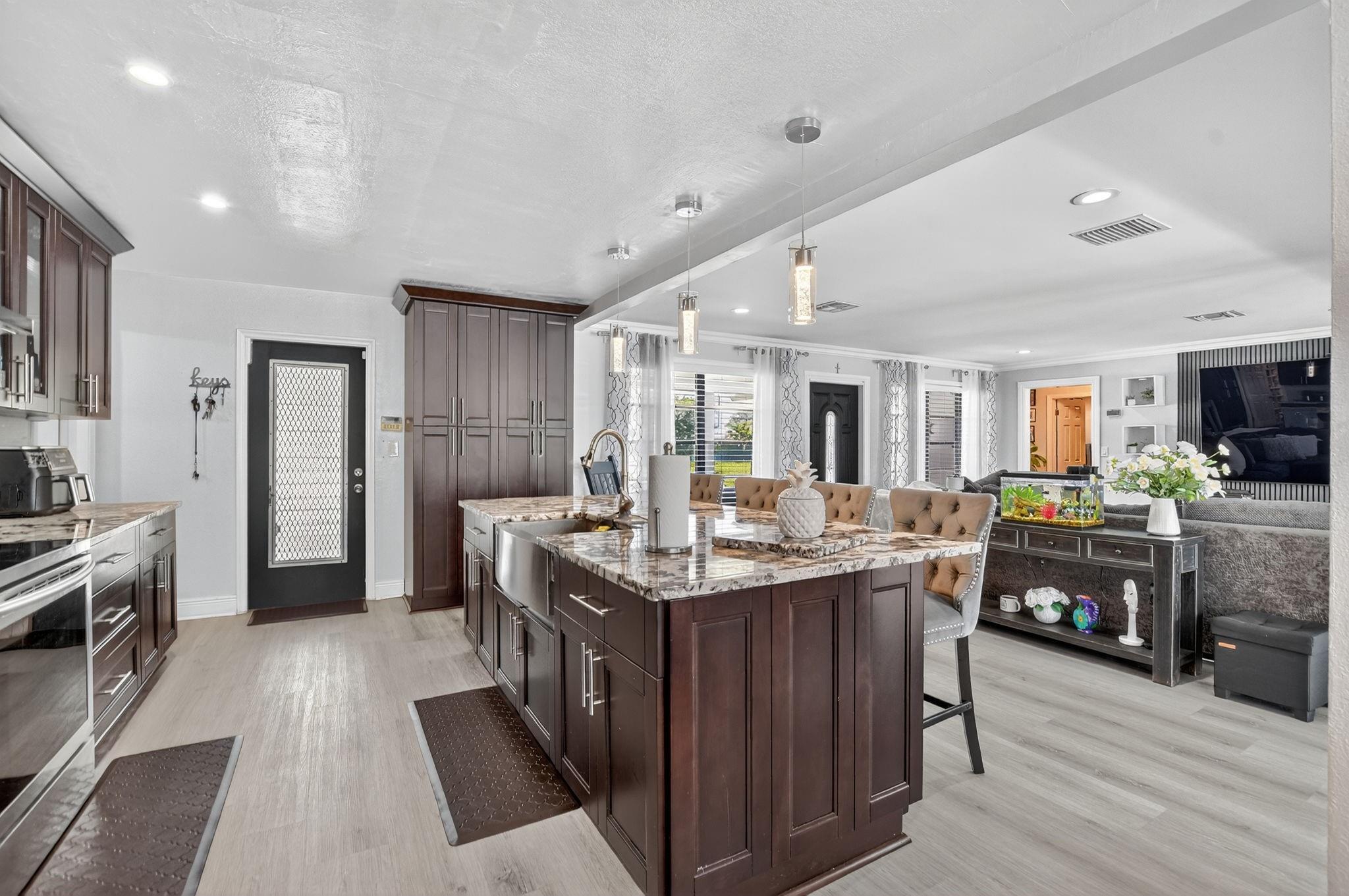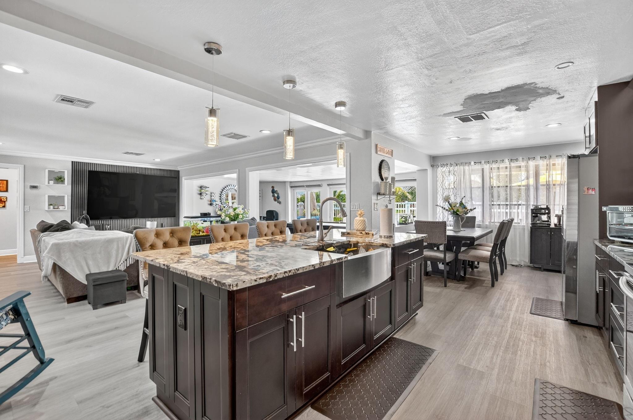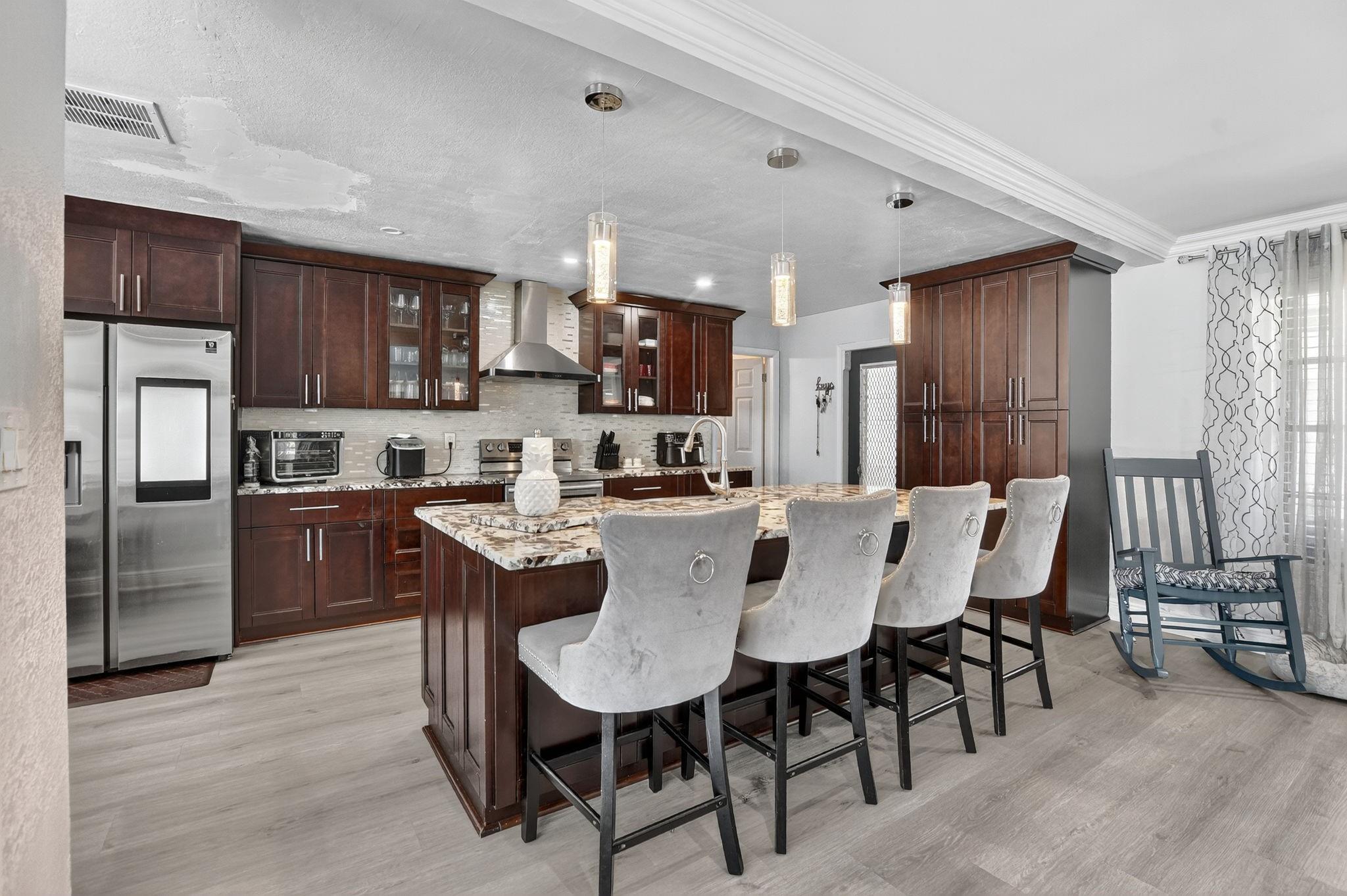 Welcome home to this perfectly situated 3 bedroom, 3 bath lake front, entertainers dream! Located on a secluded cul-de-sac, pie shaped lot with wide sprawling waterfront views. This home is highlighted with a massive open concept kitchen/living room area ideal for hosting guests that seamlessly transitions into an expansive backyard with a private pool, tiki-hut, dock, covered grill area with decking and private bar. The tastefully designed kitchen features granite countertops, all wood cabinets and walk in pantry/utility room. Detached structure and shed offer maximum storage. Large master bedroom with on suite bathroom and split floor plan. Additionally, newer metal roof installed 2021, HVAC 2019, and tankless water heater 2020. Schedule your showing today!