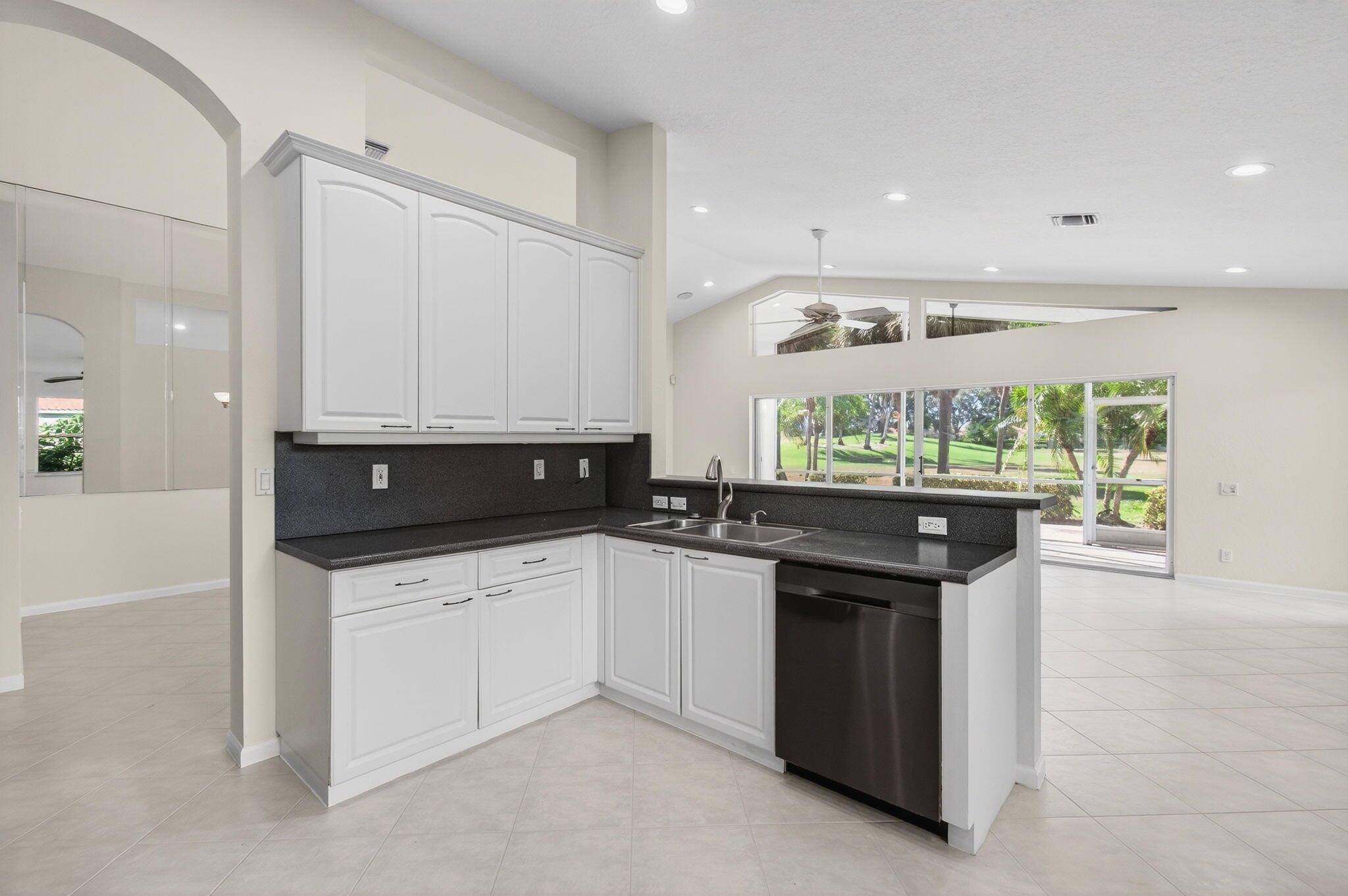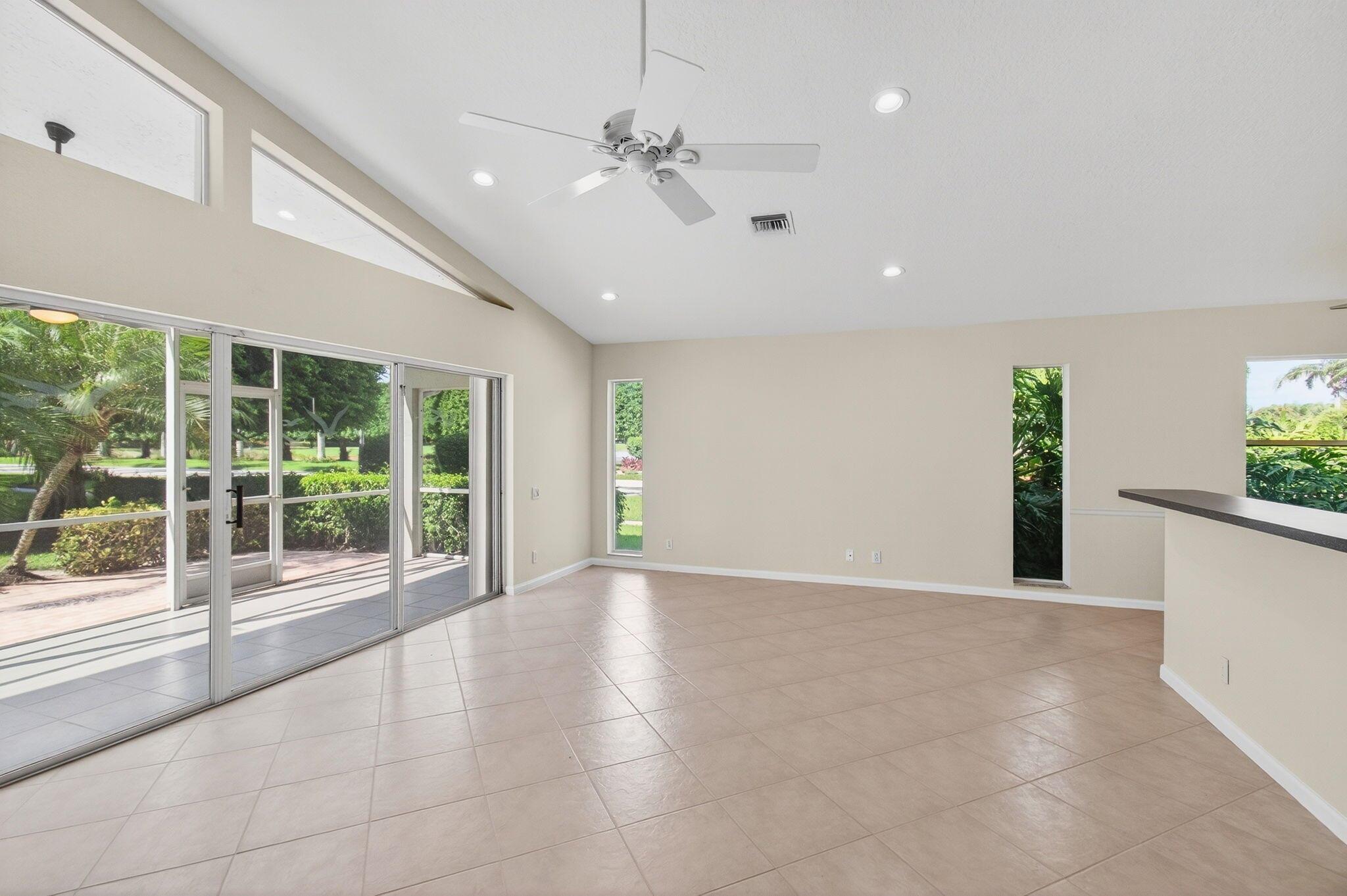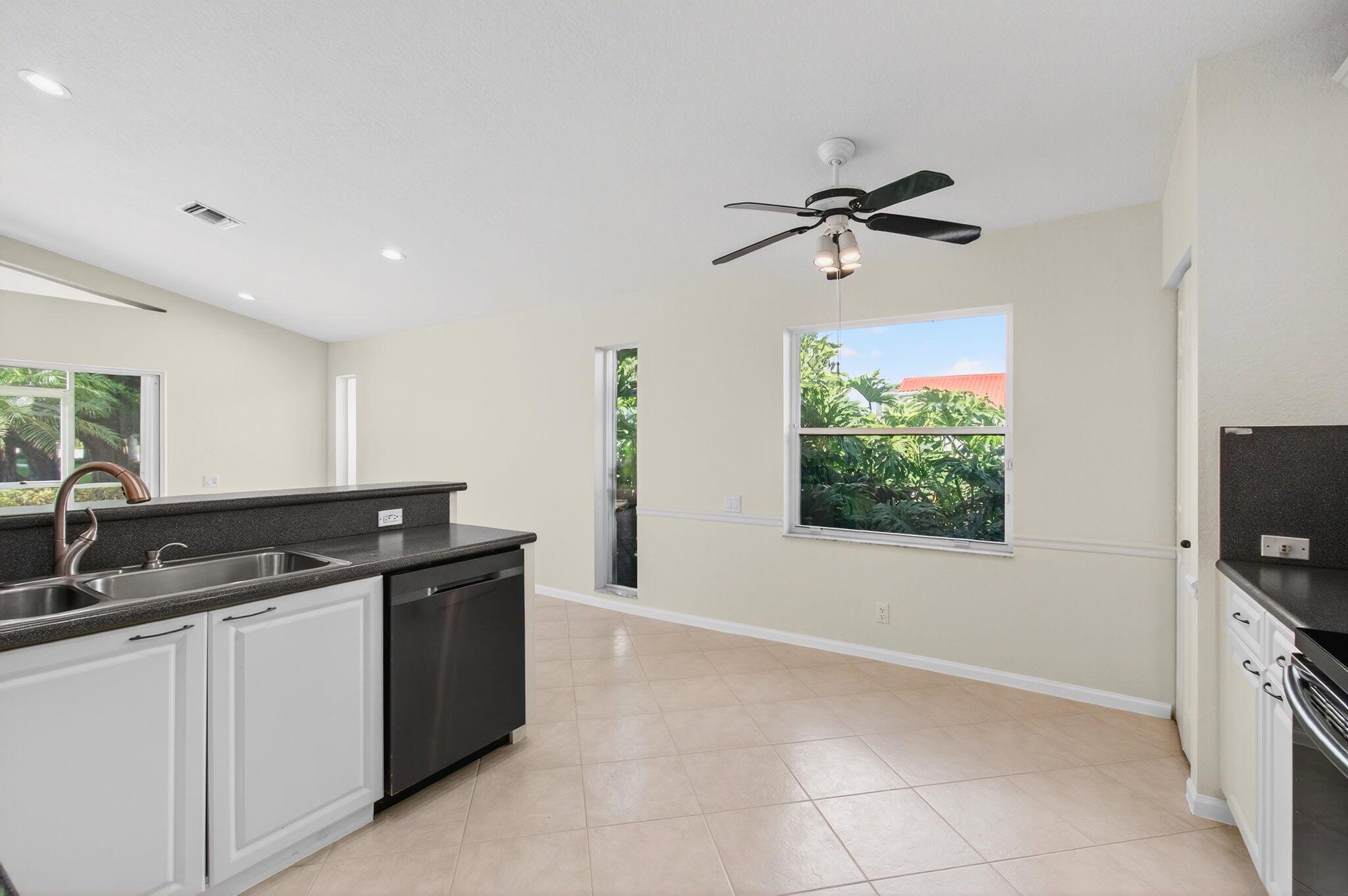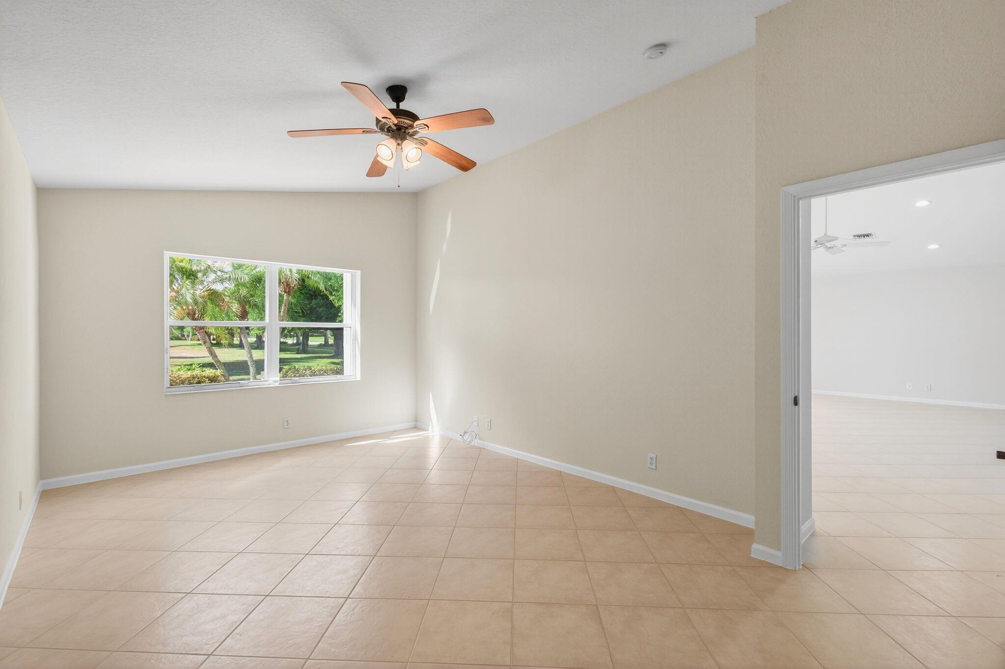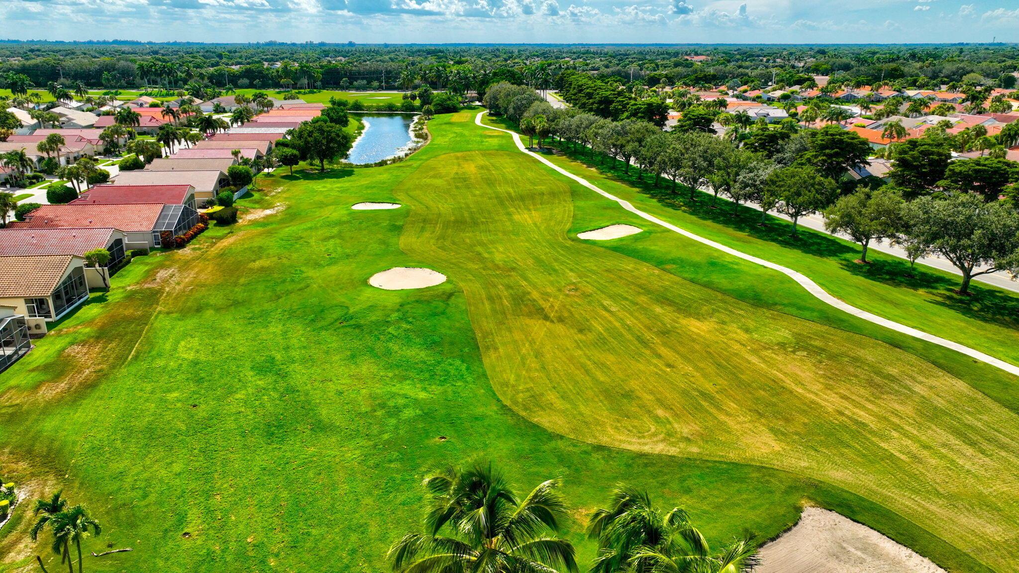 Wake up to gorgeous golf course views in this 2-bedroom plus den Balmoral floor plan home in the desirable Cascades community of Boynton Beach. This corner home offers over 1,800 sq. ft. of open living space with tile flooring throughout and a bright, airy layout that seamlessly connects the living, dining, and kitchen areas.The kitchen features black stainless steel appliances and an eat-in area that overlooks the golf course, making it the perfect spot to enjoy your morning coffee or host casual meals with friends. The split bedroom layout ensures privacy, with the second bedroom and full bath located at the front of the home. The primary suite includes a walk-in closet, double sinks, and a separate tub and shower, creating a serene retreat.