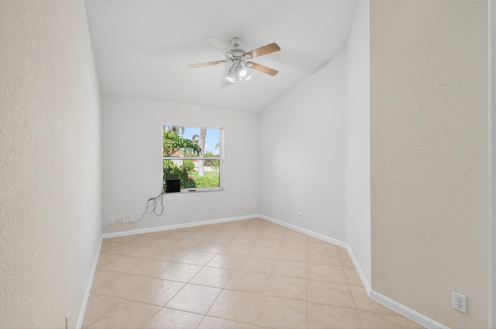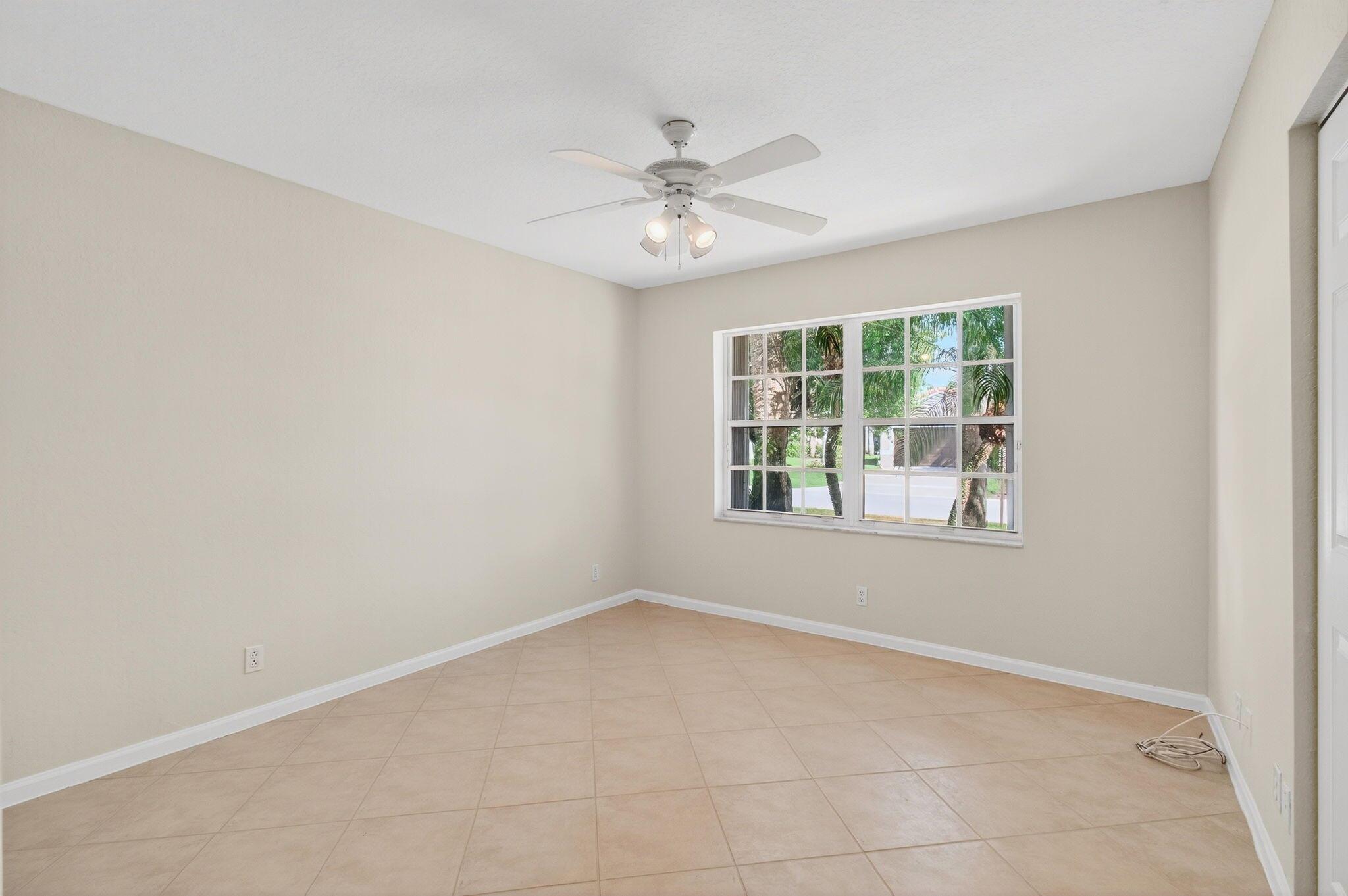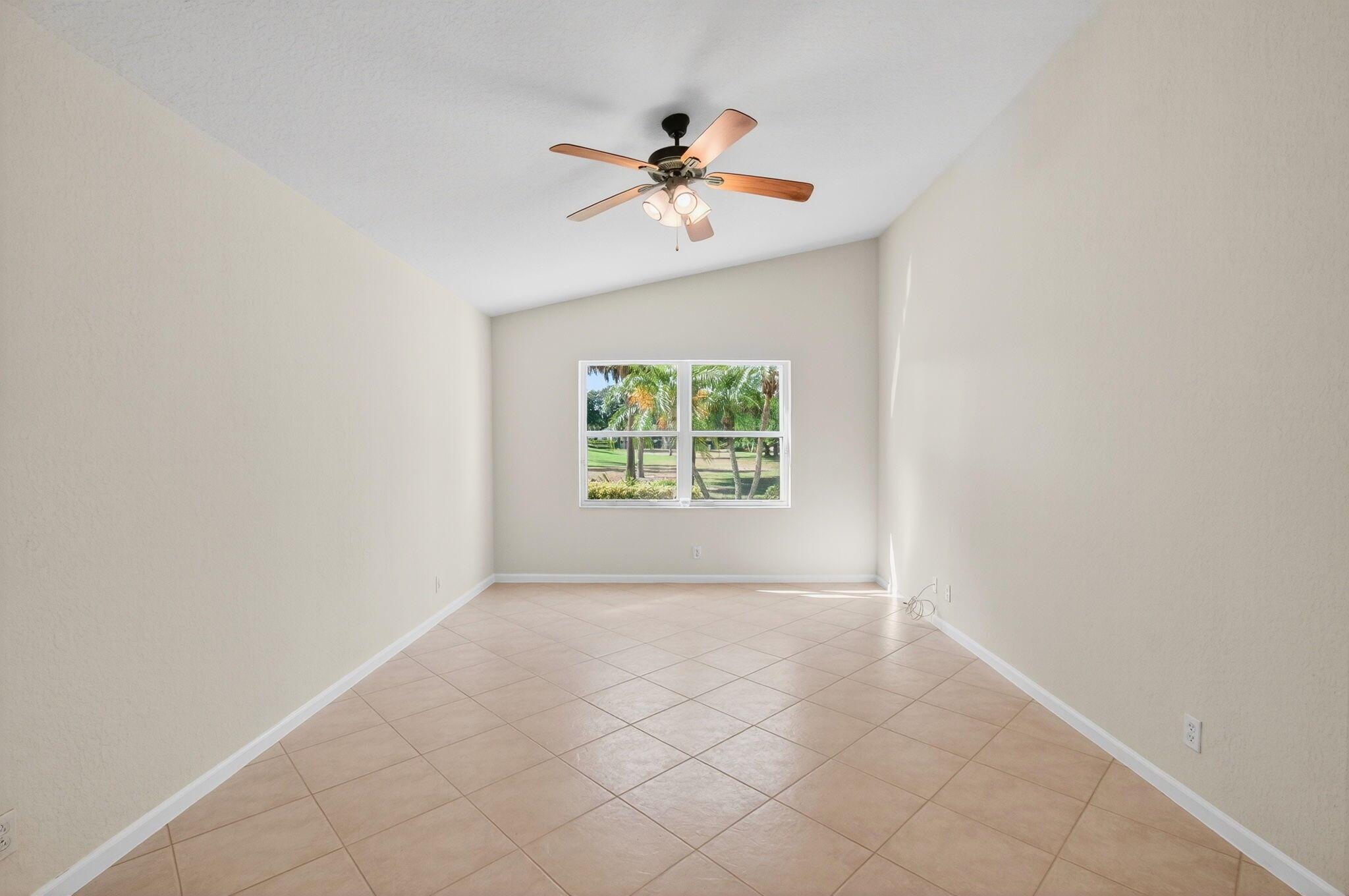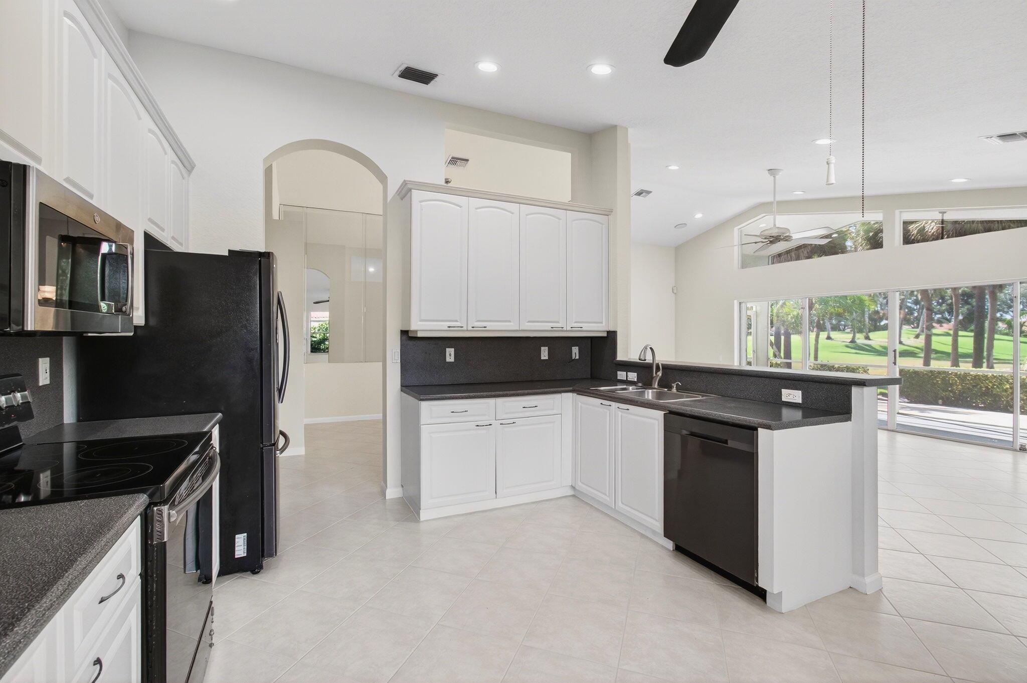 Wake up to gorgeous golf course views in this 2-bedroom plus den Balmoral floor plan home in the desirable Cascades community of Boynton Beach. This corner home offers over 1,800 sq. ft. of open living space with tile flooring throughout and a bright, airy layout that seamlessly connects the living, dining, and kitchen areas.The kitchen features black stainless steel appliances and an eat-in area that overlooks the golf course, making it the perfect spot to enjoy your morning coffee or host casual meals with friends. The split bedroom layout ensures privacy, with the second bedroom and full bath located at the front of the home. The primary suite includes a walk-in closet, double sinks, and a separate tub and shower, creating a serene retreat.