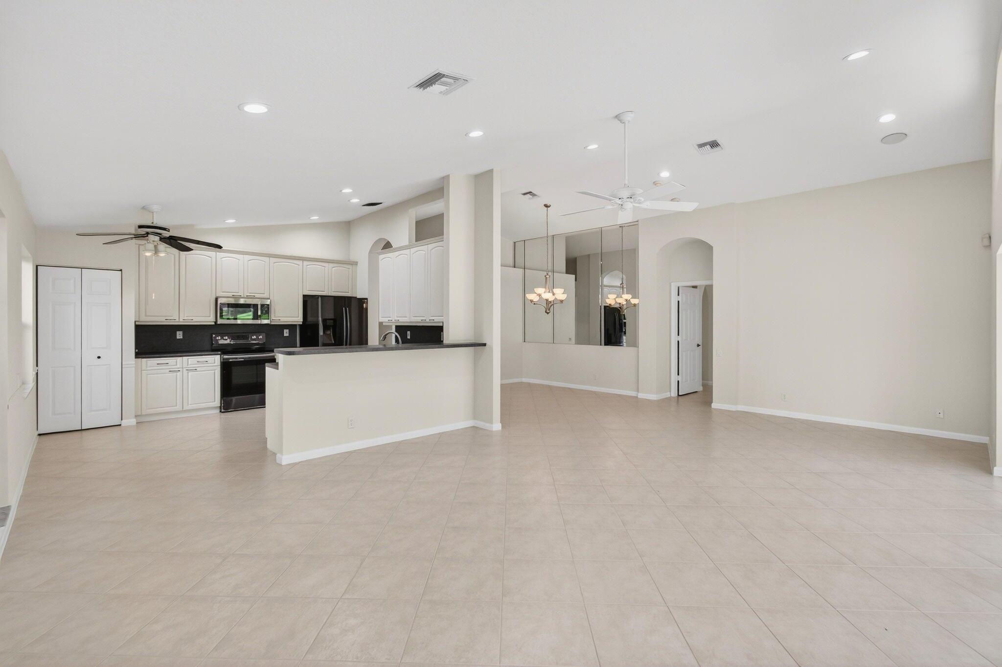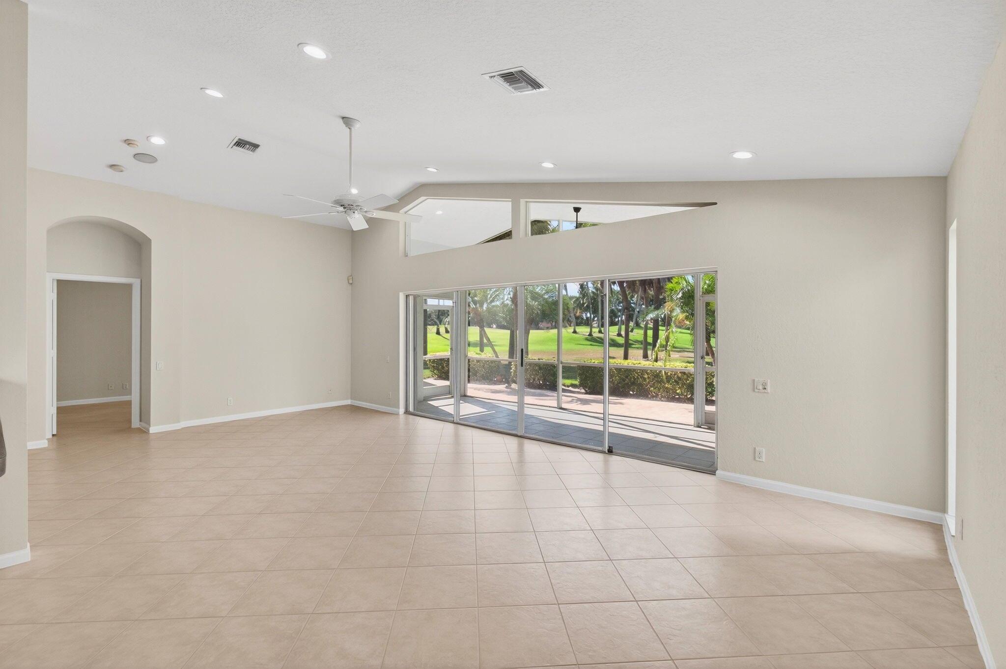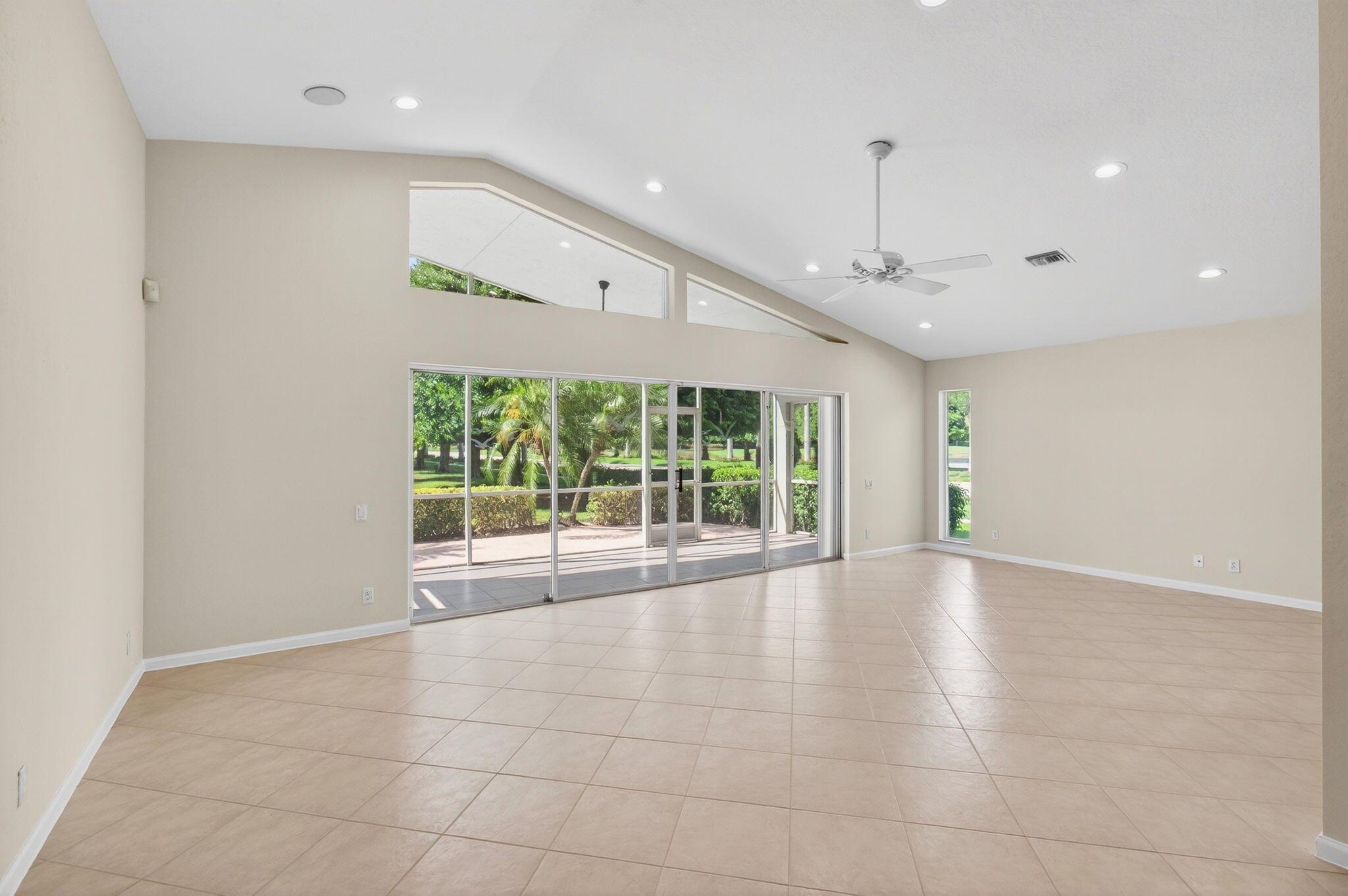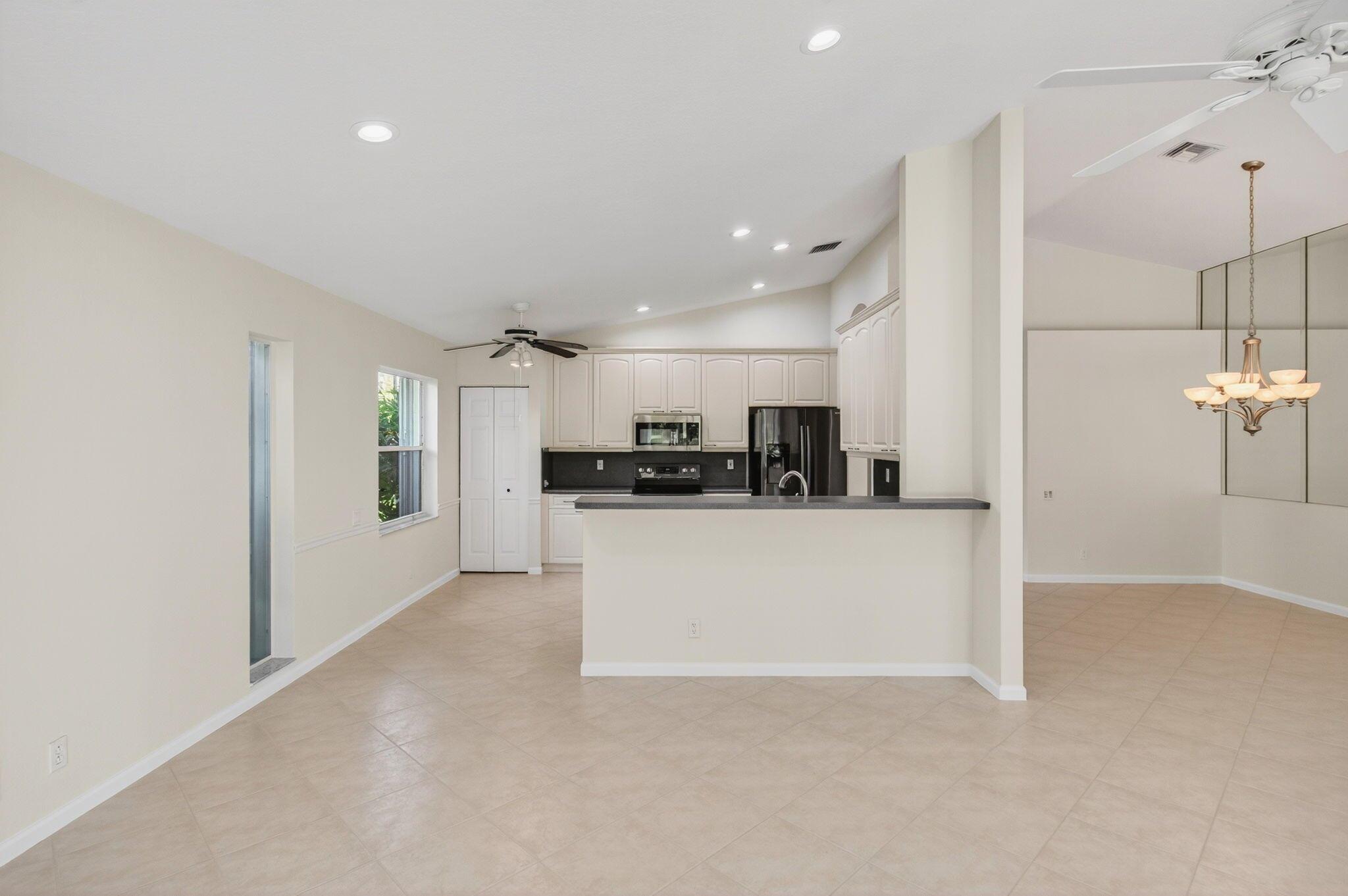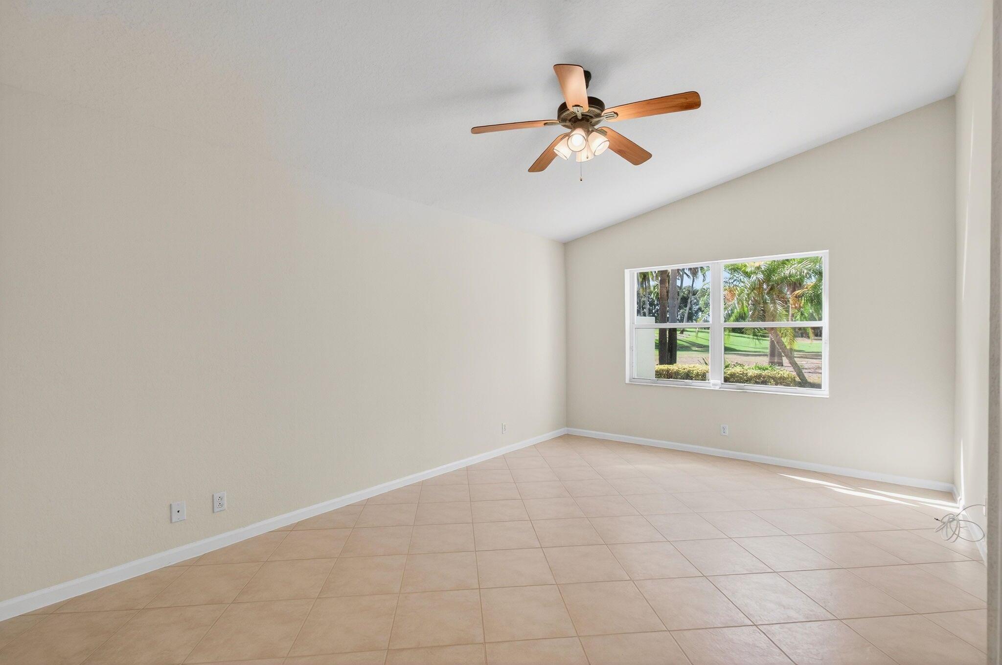 Wake up to gorgeous golf course views in this 2-bedroom plus den Balmoral floor plan home in the desirable Cascades community of Boynton Beach. This corner home offers over 1,800 sq. ft. of open living space with tile flooring throughout and a bright, airy layout that seamlessly connects the living, dining, and kitchen areas.The kitchen features black stainless steel appliances and an eat-in area that overlooks the golf course, making it the perfect spot to enjoy your morning coffee or host casual meals with friends. The split bedroom layout ensures privacy, with the second bedroom and full bath located at the front of the home. The primary suite includes a walk-in closet, double sinks, and a separate tub and shower, creating a serene retreat.