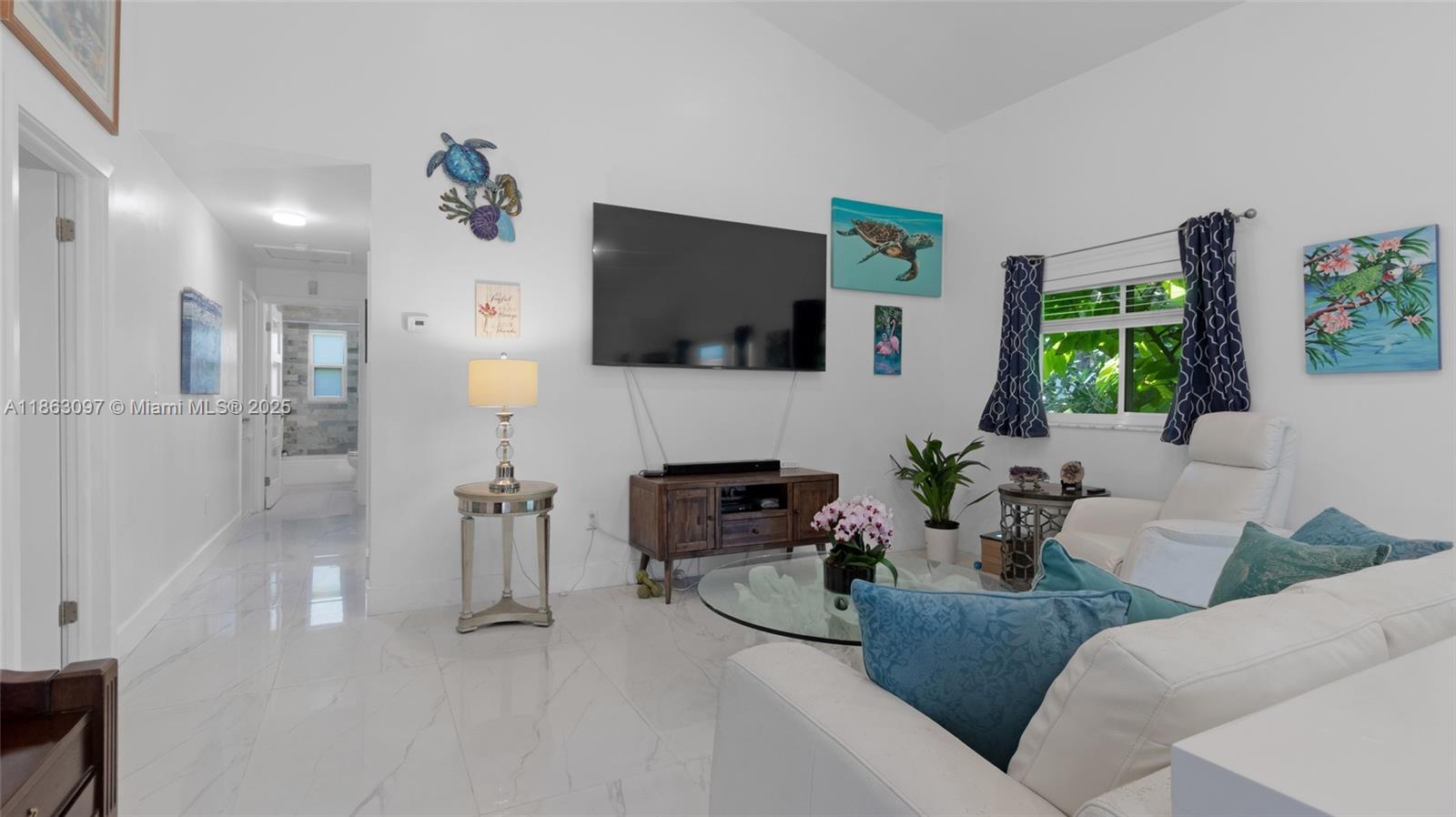 Discover a pleasant and inviting living space that boasts 3 bedrooms and 2 modern bathrooms, a laundry room with 2 closets, and a convenient carport. This home showcases a seamless layout that connects an open living area with a striking vaulted ceiling to a contemporary kitchen, which is highlighted by an island and recessed lighting. The kitchen is outfitted with a dual-fuel range featuring a downdraft vent. As per the seller, all renovations have been completed with permits. Upgrades include: impact windows and doors, a renovated kitchen and bathrooms, plumbing, and electrical work. Property strategically located just one block away from Trader Joe's and within walking distance of the Shops at Merrick Place.