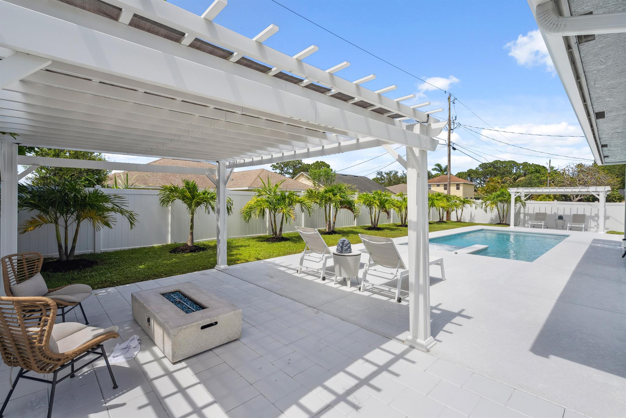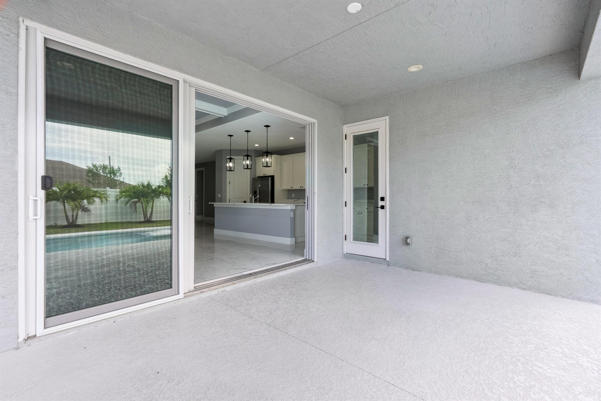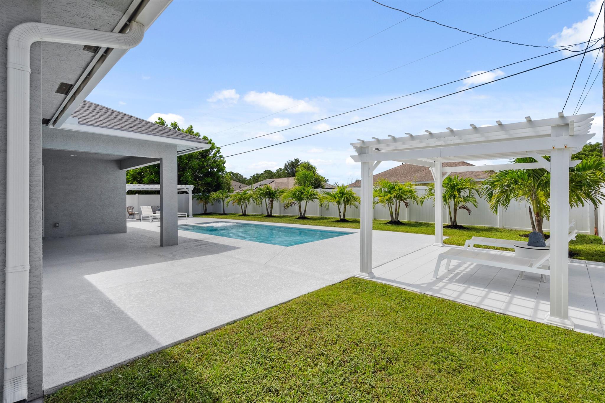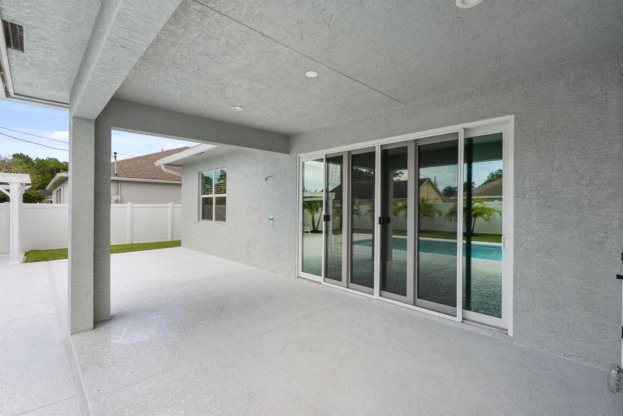 Pool home with a heated infinity spa! Fully fenced in yard for your pups! Only 1.4 miles to Tradition Square without having to pay the HOA or additional taxes to live in Tradition & only 52 minutes to the WPB Airport, making it an easy commute for a potential second home. Walking distance to Starbucks. No HOA, so bring your boat/RV! ALL IMPACT windows & doors built in 2022. Upgraded porcelain tile throughout, zero carpet. Beautiful white shaker kitchen with quartz countertops that overlooks the living room adorned with a coffer ceiling and crown molding. 8ft interior doors. The backyard is perfect to spend all summer! Two featured pergolas, an outdoor shower, extended pool cool decking and covered patio that can be easily screened for indoor/outdoor living.