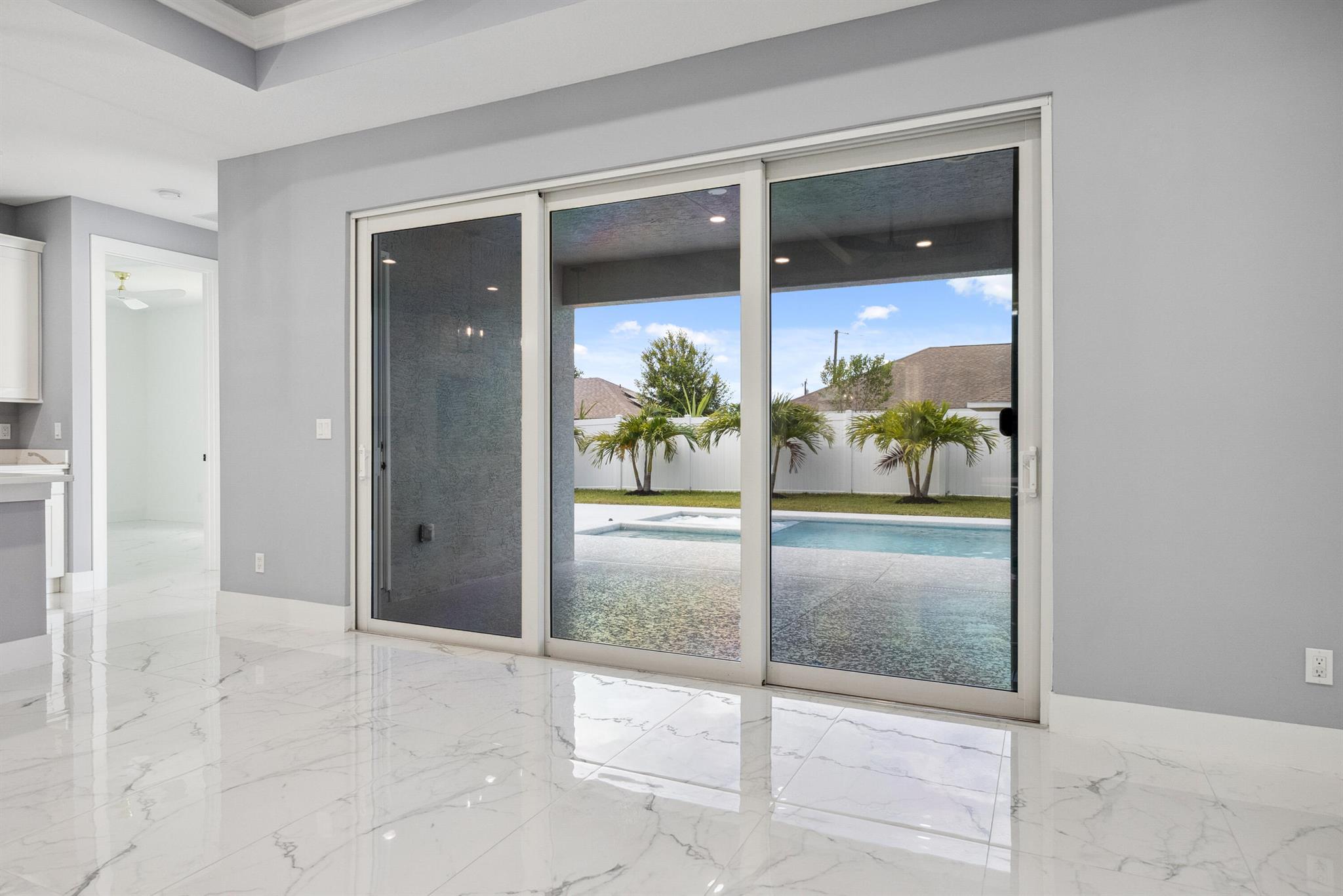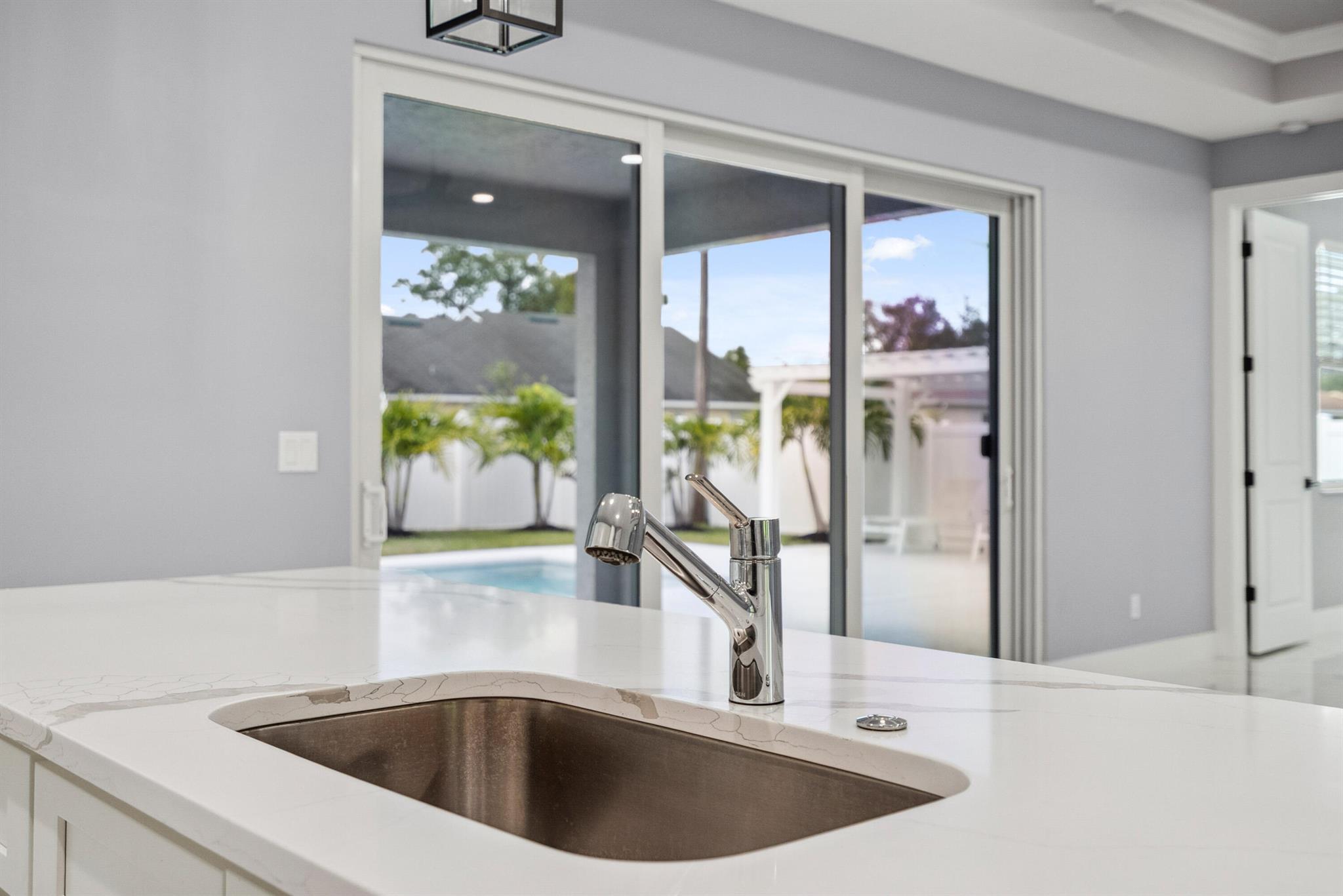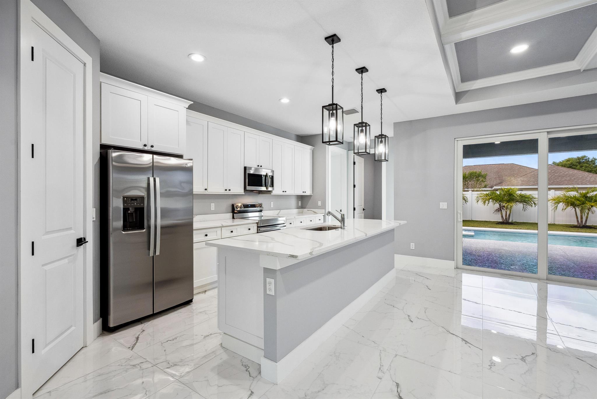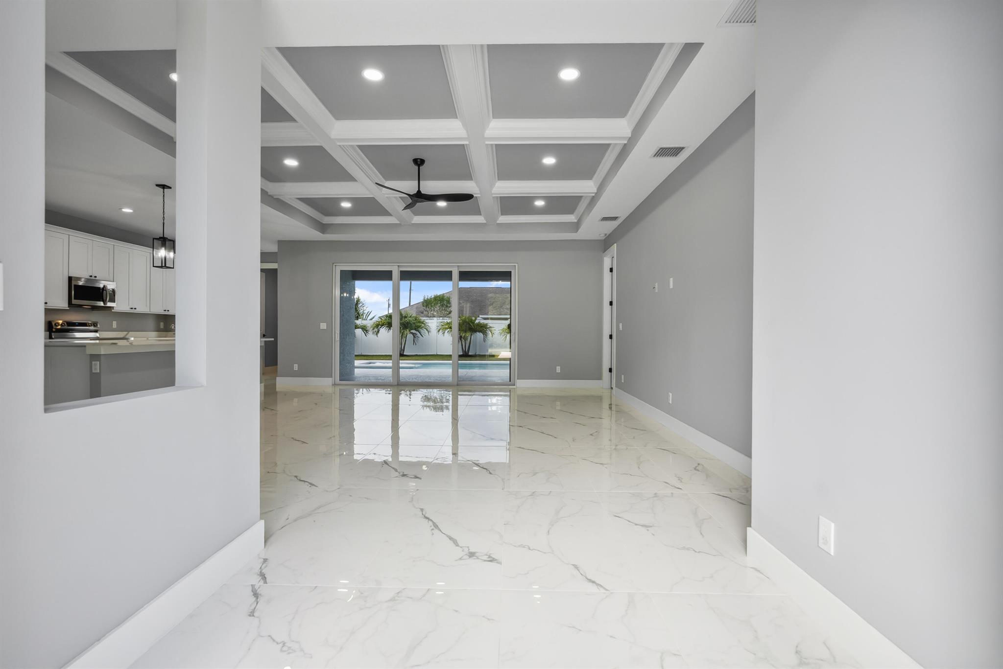 Pool home with a heated infinity spa! Fully fenced in yard for your pups! Only 1.4 miles to Tradition Square without having to pay the HOA or additional taxes to live in Tradition & only 52 minutes to the WPB Airport, making it an easy commute for a potential second home. Walking distance to Starbucks. No HOA, so bring your boat/RV! ALL IMPACT windows & doors built in 2022. Upgraded porcelain tile throughout, zero carpet. Beautiful white shaker kitchen with quartz countertops that overlooks the living room adorned with a coffer ceiling and crown molding. 8ft interior doors. The backyard is perfect to spend all summer! Two featured pergolas, an outdoor shower, extended pool cool decking and covered patio that can be easily screened for indoor/outdoor living.