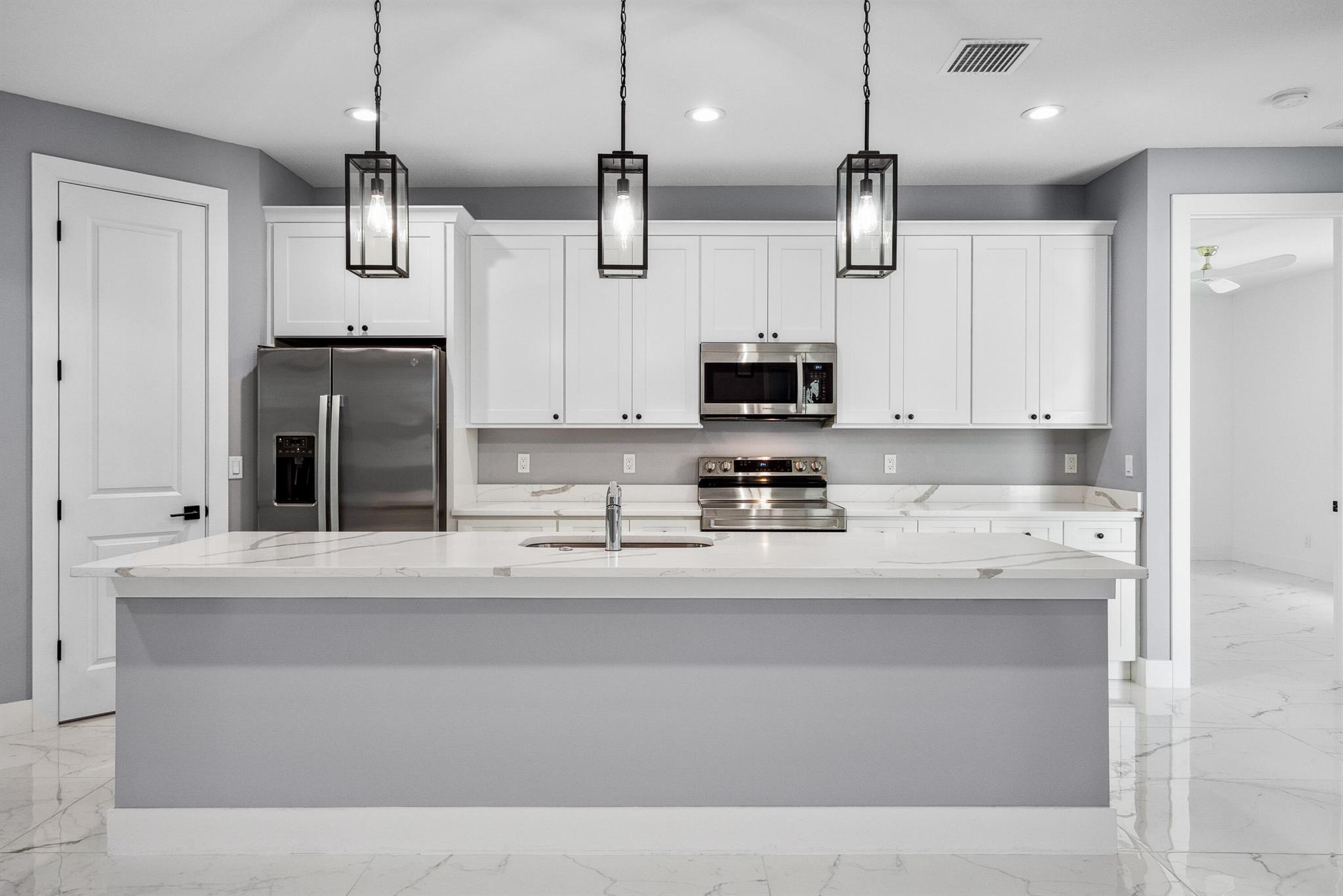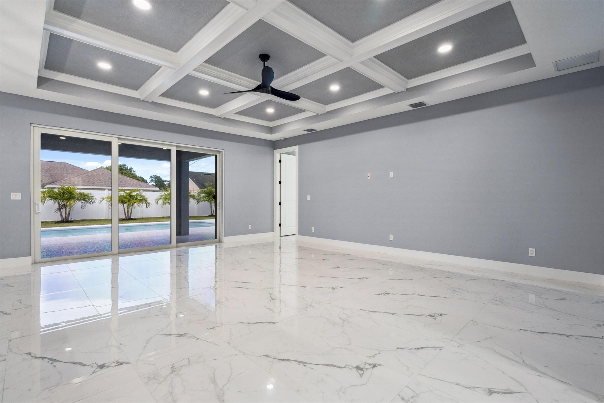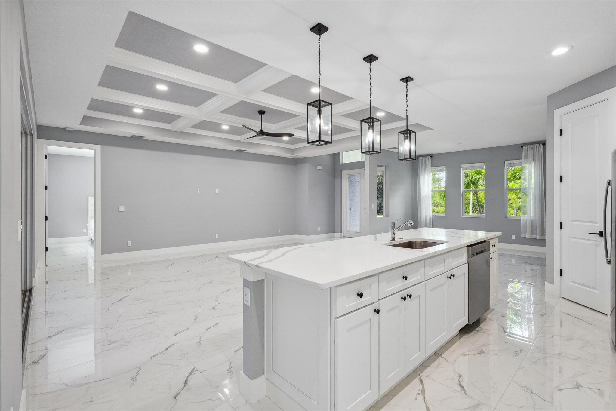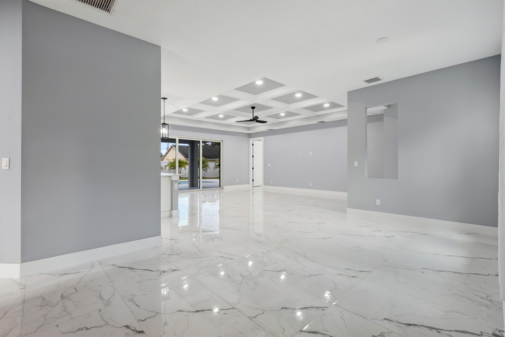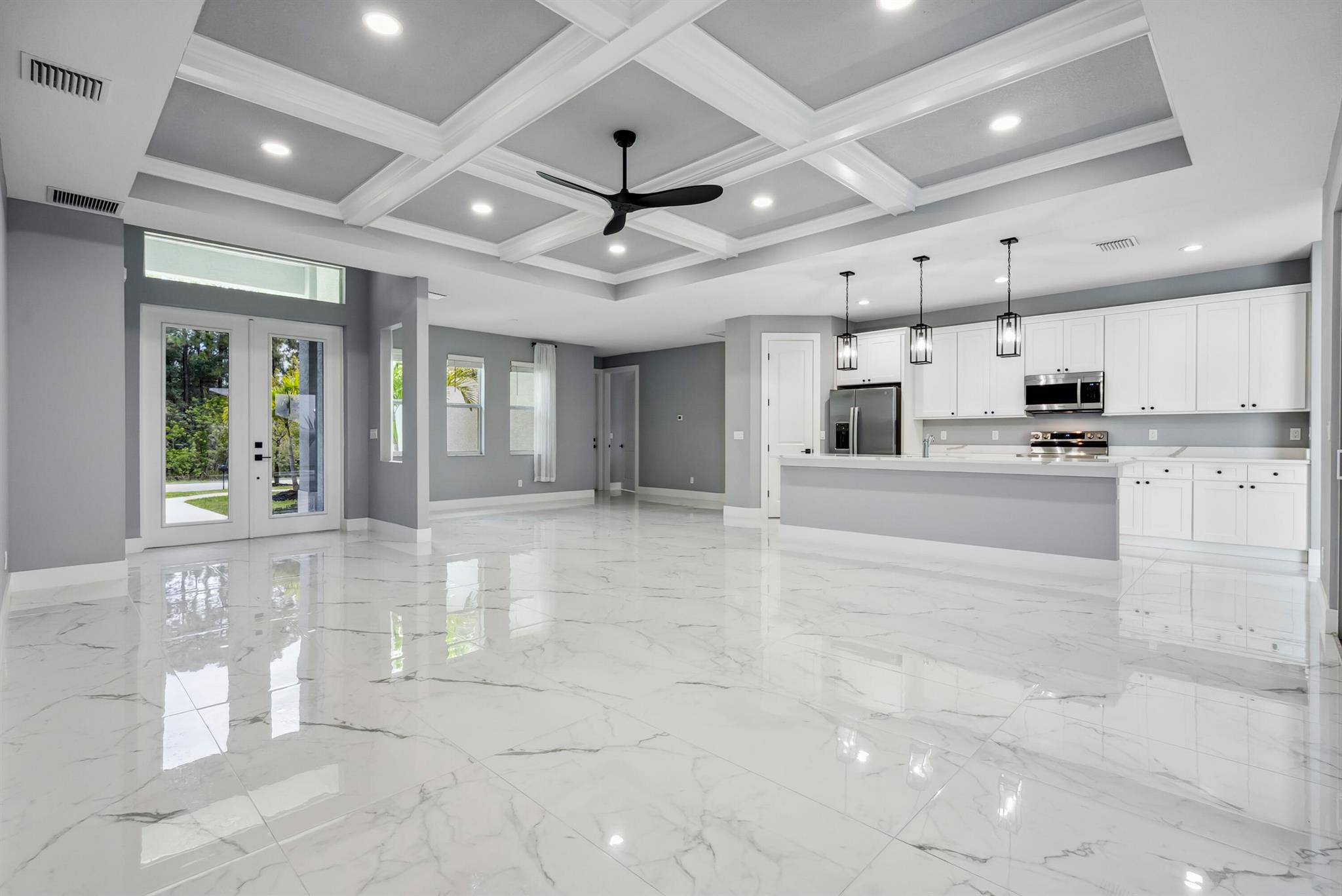 Pool home with a heated infinity spa! Fully fenced in yard for your pups! Only 1.4 miles to Tradition Square without having to pay the HOA or additional taxes to live in Tradition & only 52 minutes to the WPB Airport, making it an easy commute for a potential second home. Walking distance to Starbucks. No HOA, so bring your boat/RV! ALL IMPACT windows & doors built in 2022. Upgraded porcelain tile throughout, zero carpet. Beautiful white shaker kitchen with quartz countertops that overlooks the living room adorned with a coffer ceiling and crown molding. 8ft interior doors. The backyard is perfect to spend all summer! Two featured pergolas, an outdoor shower, extended pool cool decking and covered patio that can be easily screened for indoor/outdoor living.