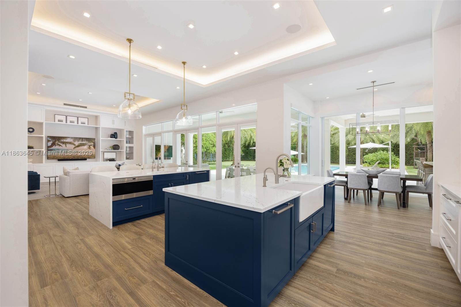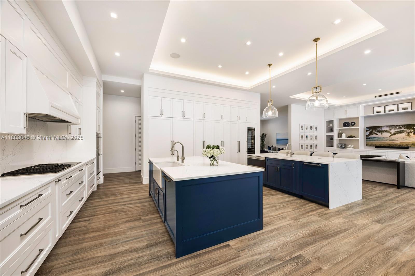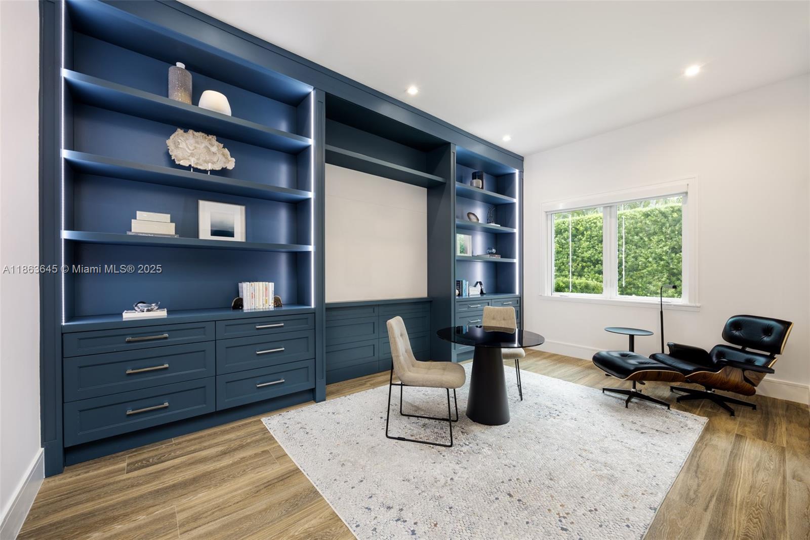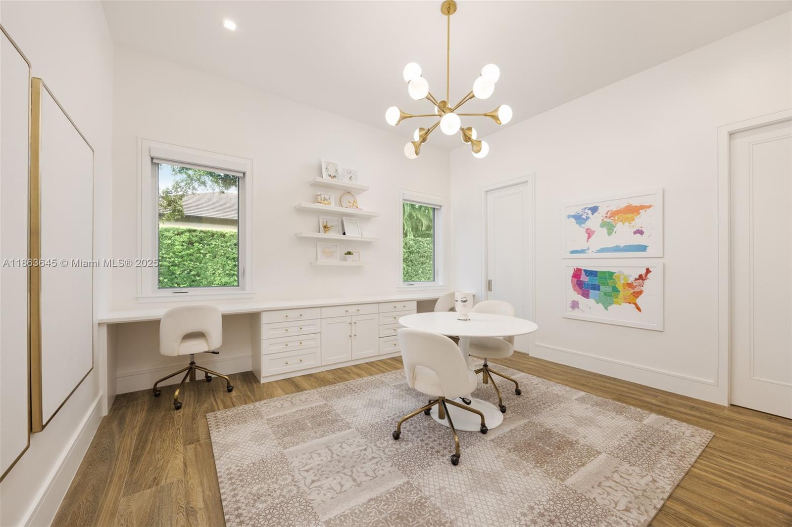 This residence radiates style and quiet luxury. Custom design in collaboration with Hollub Homes, it reflects exceptional craftsmanship, timeless design, and thoughtful livability. On an ultra-quiet street, this home features glass walls with captivating views to a perfectly curated and manicured pool lawn area, sprawling palms, and a Podocarpus hedge that perfectly lines the perimeter. An open kitchen with dual islands anchors everyday life and entertaining. The bedroom wing keeps the family connected, with a dedicated lounge area for time with friends. The smartly designed professional and wellness wing includes a private office, gym with separate entrance, flex workspace, and laundry room. Every detail was intentional—elevated yet welcoming, from first impression to everyday living.