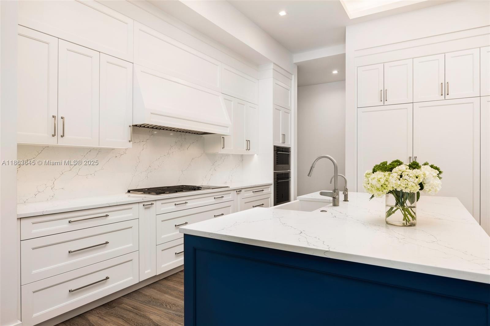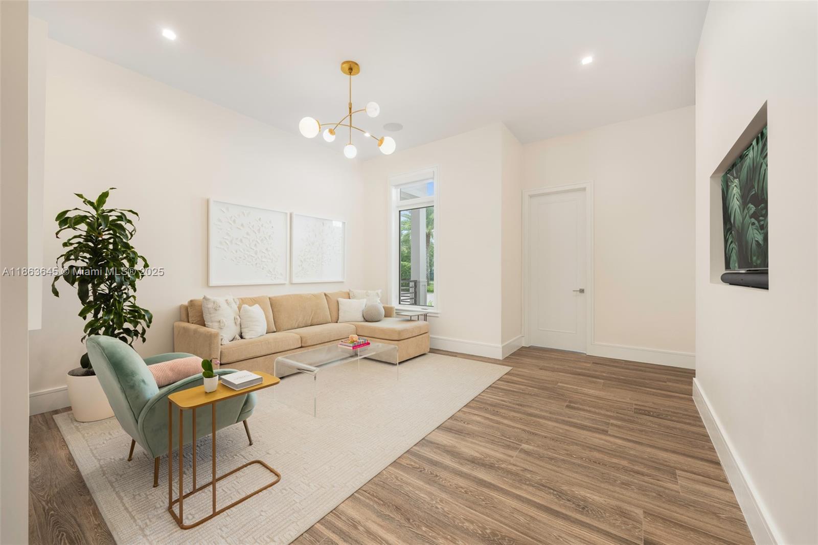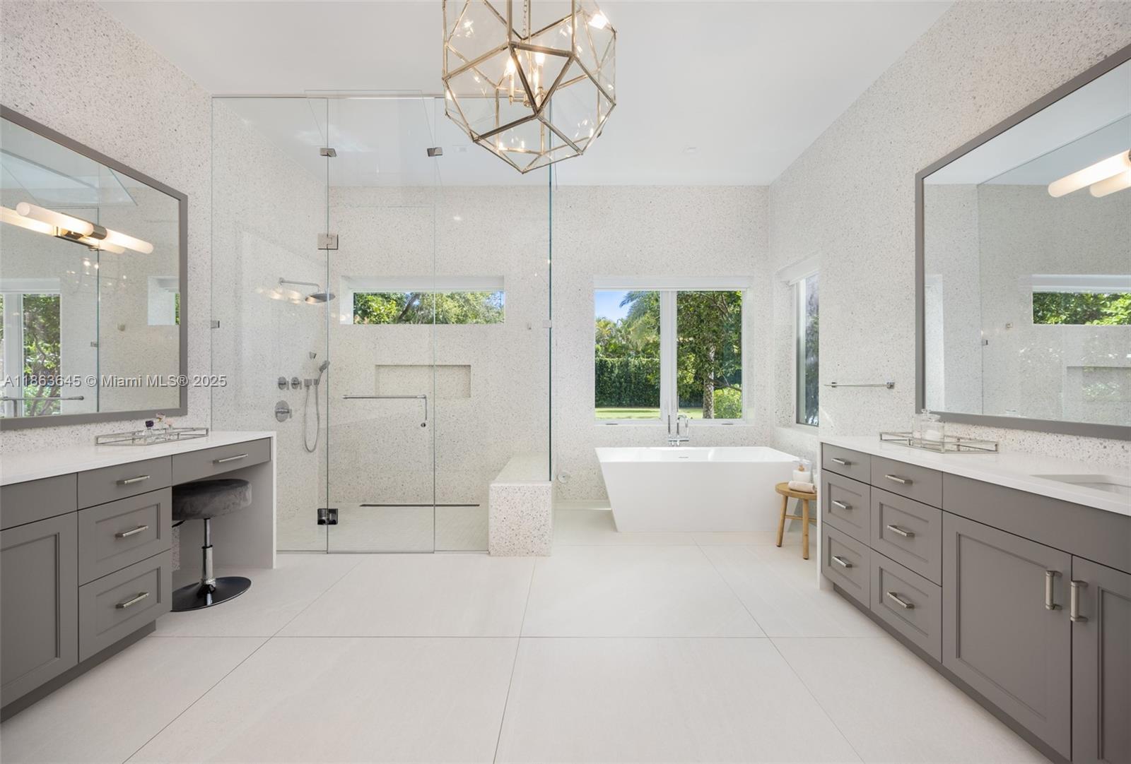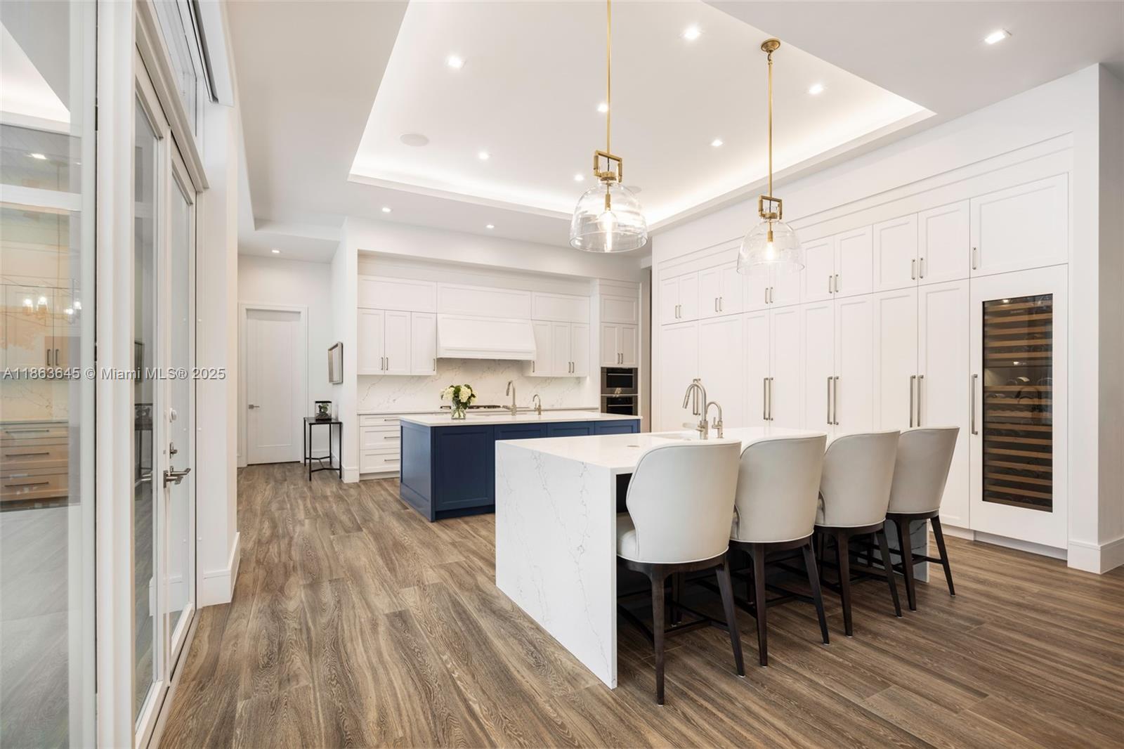 This residence radiates style and quiet luxury. Custom design in collaboration with Hollub Homes, it reflects exceptional craftsmanship, timeless design, and thoughtful livability. On an ultra-quiet street, this home features glass walls with captivating views to a perfectly curated and manicured pool lawn area, sprawling palms, and a Podocarpus hedge that perfectly lines the perimeter. An open kitchen with dual islands anchors everyday life and entertaining. The bedroom wing keeps the family connected, with a dedicated lounge area for time with friends. The smartly designed professional and wellness wing includes a private office, gym with separate entrance, flex workspace, and laundry room. Every detail was intentional—elevated yet welcoming, from first impression to everyday living.