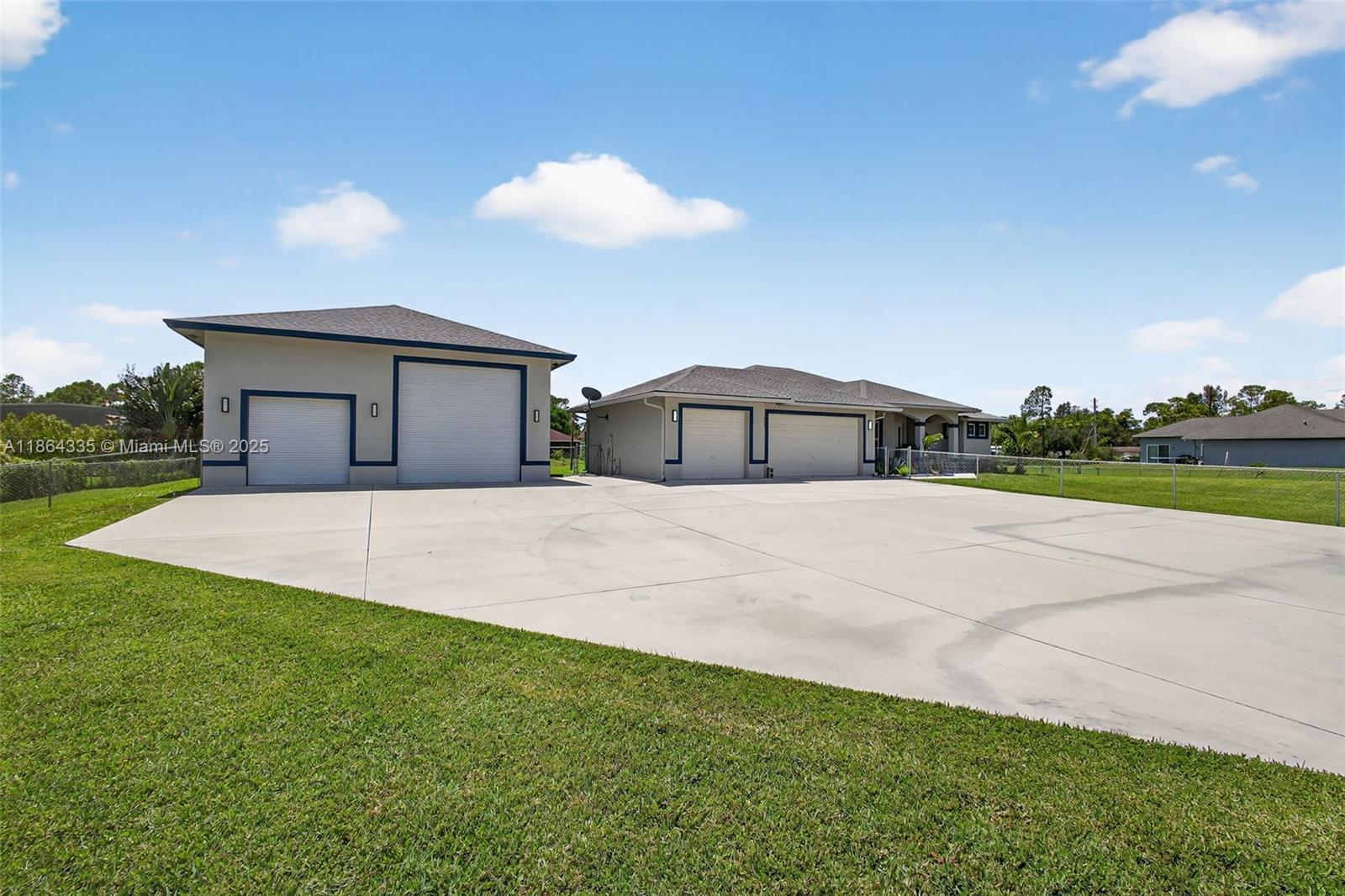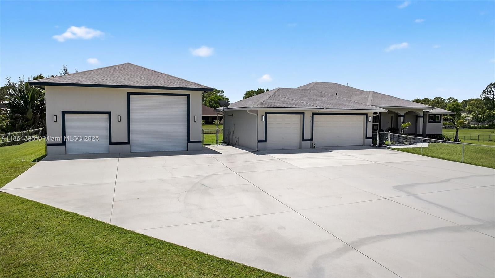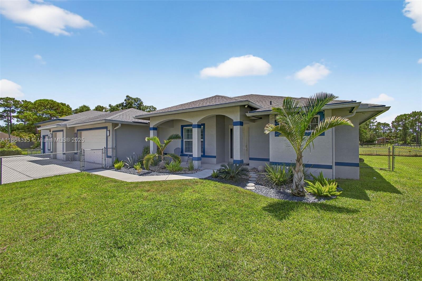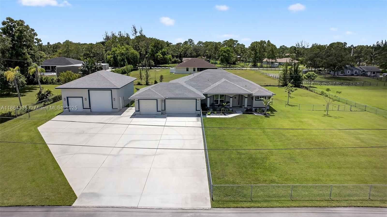$10,000 CLOSING CREDIT WITH AN ACCEPTED OFFER! Room to roam on this private 1-acre estate in The Acreage. Built in 2018 with CBS construction, this custom home offers 3 bedrooms plus an office, 3 full baths, and a sophisticated open-concept design. The gourmet kitchen boasts GE Profile appliances, walk-in pantry, and sleek finishes. Porcelain tile flows throughout, complemented by custom built-in closets and a whole-house water filtration system. Designed with energy efficiency in mind, this Synergy-built residence combines comfort and style. A remarkable 1,200 sq. ft. drive-thru garage with loft provides endless possibilities for recreational vehicles, storage, or a private retreat—perfect for those who want it all.