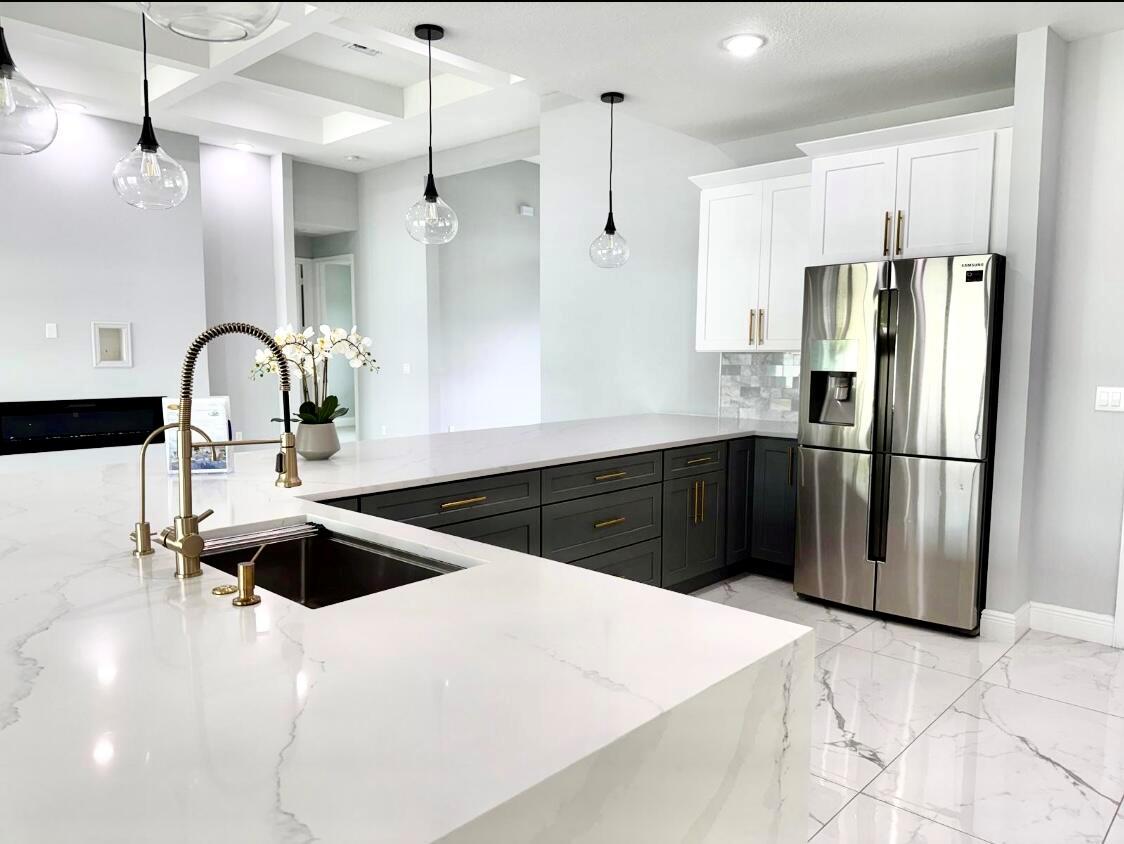 Stunning 2023 Custom -Build Home - Corner in Port Saint Lucie.Welcome to 2092 SW Airoso Blvd, a beautifully designed custom home, this move in ready residence offers 4 Spacious Bedrooms a dedicated Office /Studio and 3 Full Bathrooms,12ft in main living areas. Metal Roof, Impact Resistant Windows.The open concept living area is adorned with Large Porcelain title flooring. 2 Car Garage, Sprinkler system..Chef-style Kitchen featuring Massive Center Island. A cozy fireplace. Patio with Pavers and Gutters.. Located just minutes from shopping center, schools, parks, and Beach.Schedule your private tour today-