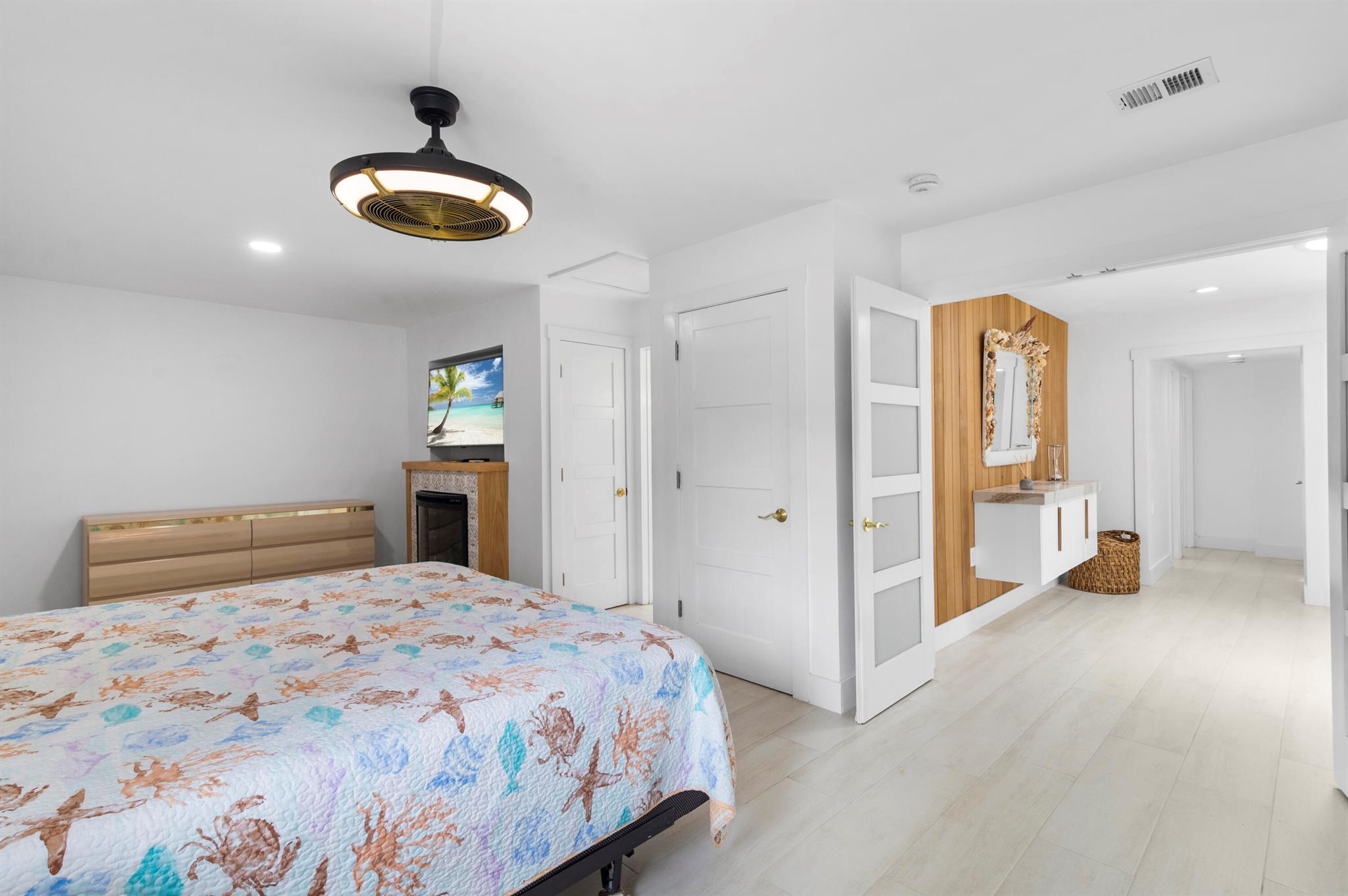 IMPRESSIVE, spacious floor plan! Modern cabinets throughout, high end ceiling fans and light fixtures, one skylight and four sun tunnels, two custom fireplaces, three TV's, lots of closet/storage space, fully owned ADT alarm system with cameras, modern European white kitchen with quartz counter tops, stainless steel appliances, tankless water heater, set up for central vacuum, all sliding glass doors have built in blinds, screened in salt pool offer a resort like getaway with travertine patio, sauna, full summer kitchen, tropical plants, smoker, bar with patio furniture, three storage sheds. Two full size refrigerators/freezer, two wine coolers, over 2.3 acres of 112 fruit trees and sprinkler system. New impact windows and accordion shutters. Enjoy a no HOA neighborhood.