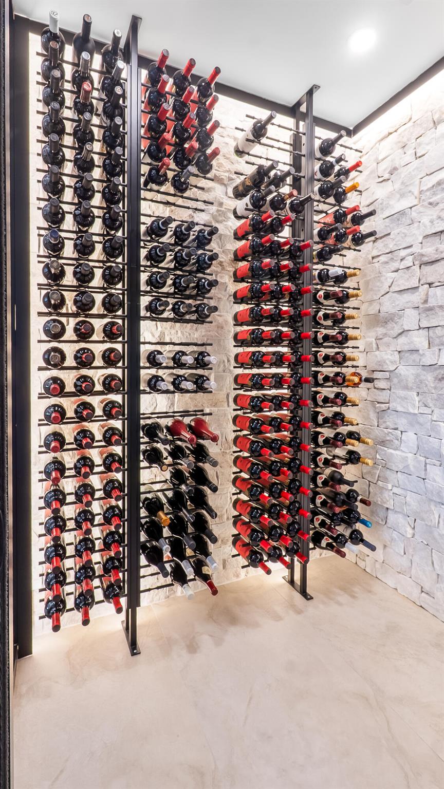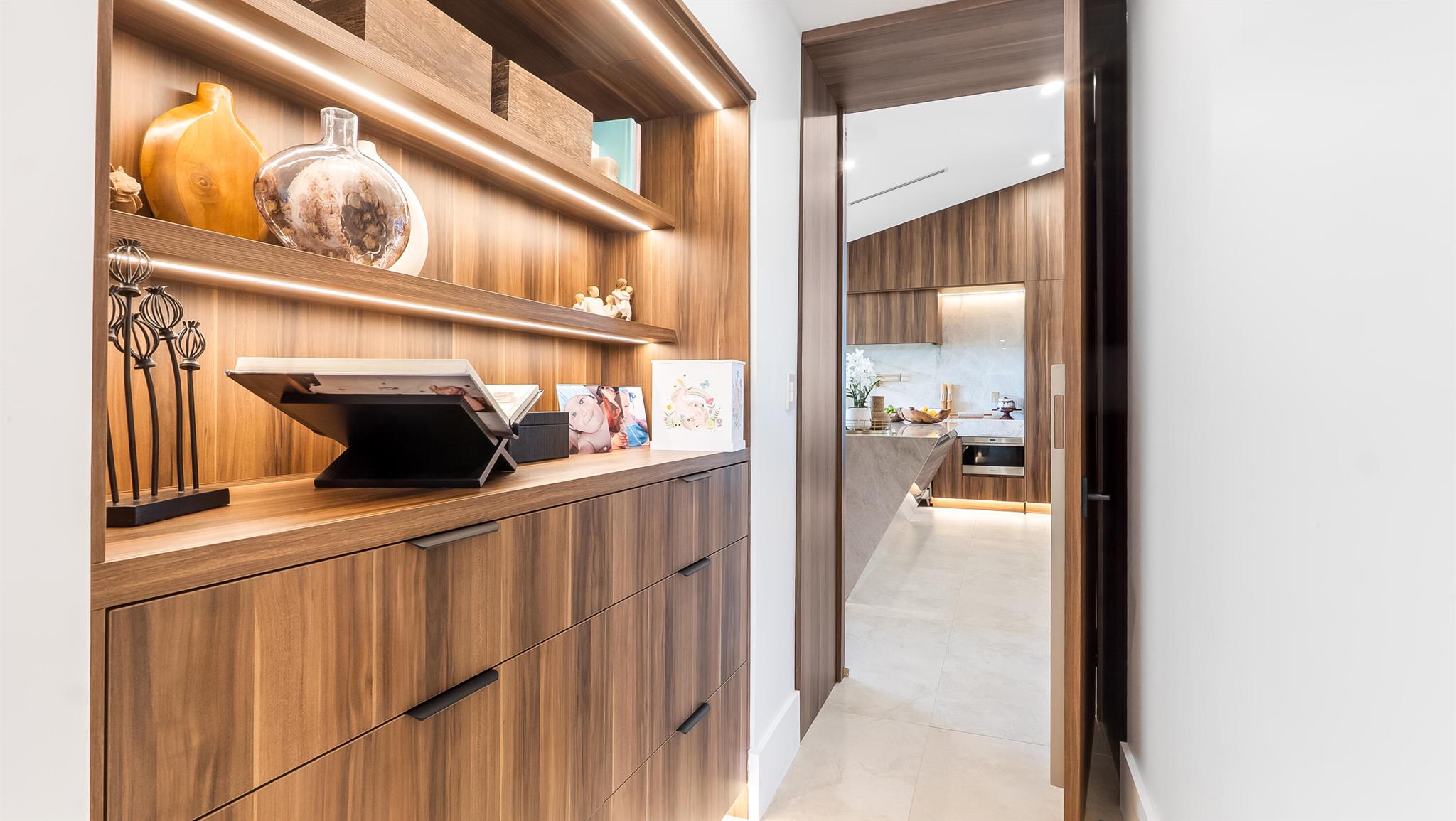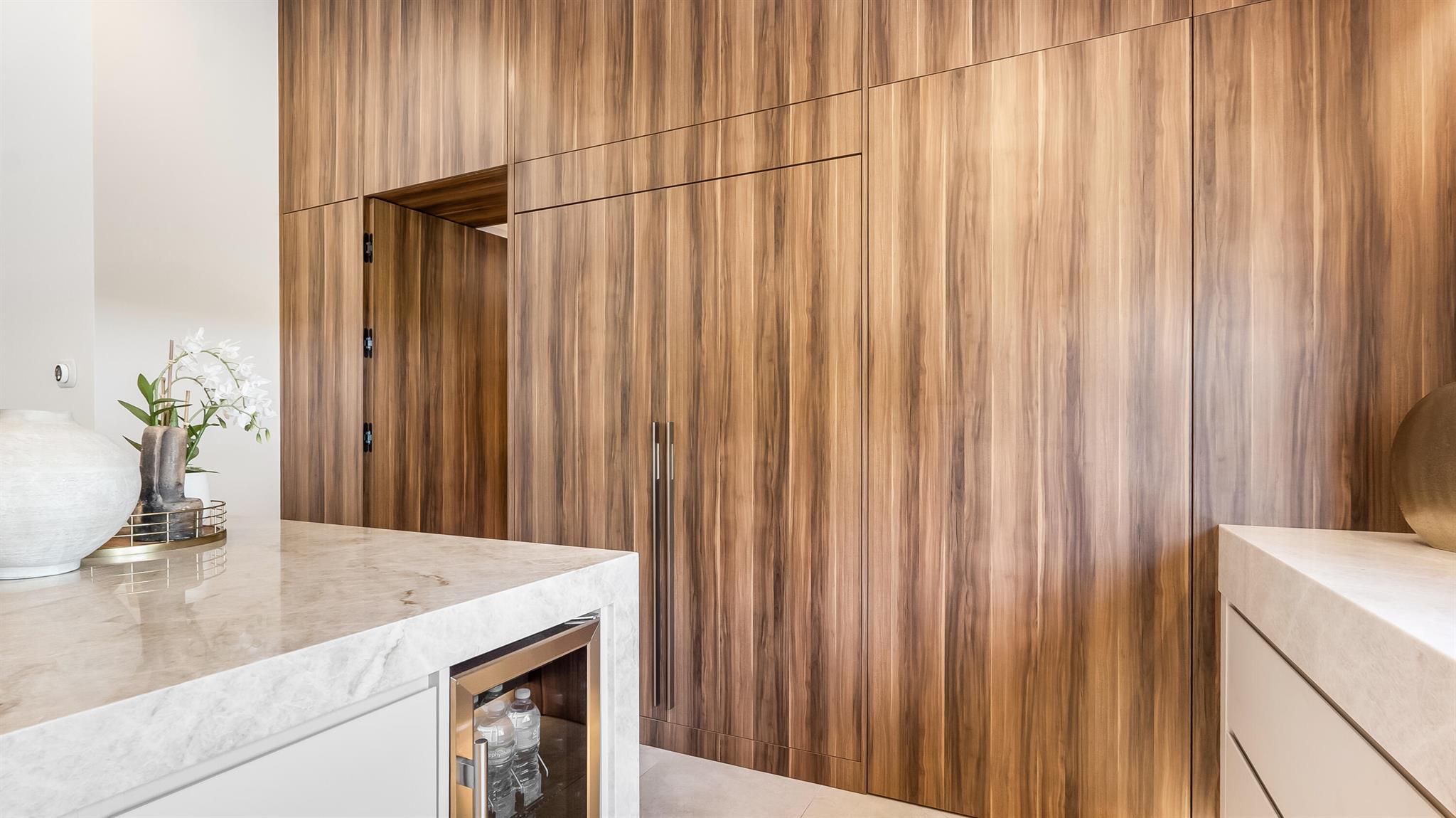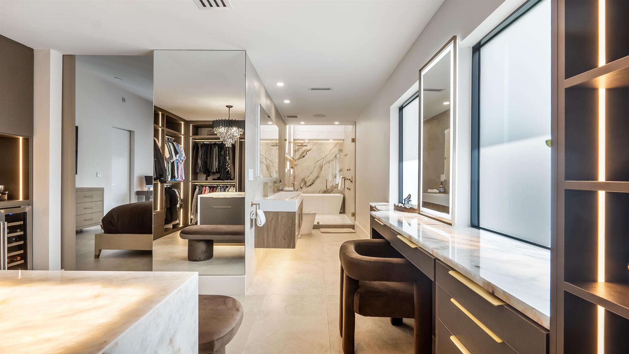 From the moment you arrive, this fully renovated home captivates with a floating water walkway and front glass pivot door. Inside, soaring 19-foot ceilings, open-concept living, and impeccable high-end finishes set the stage for sophisticated living. The residence features 4 en-suite bedrooms with custom closets, a spacious primary bedroom with wet-room and dream closet, a chef's kitchen with Wolf appliances, bespoke cabinetry, and quartzite island, a modern Taj Mahal stone fireplace, as well as a 300-bottle wine cellar and man cave garage that elevate lifestyle and entertainment. Step outside to your private resort oasis with a saltwater pool, sunken lounge, in-pool fire pit, swim jets,10-person spa, and cabana steam bath, all framed by lush tropical landscaping and golf course views.
