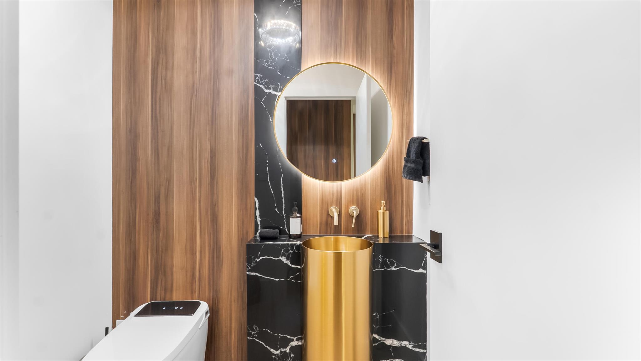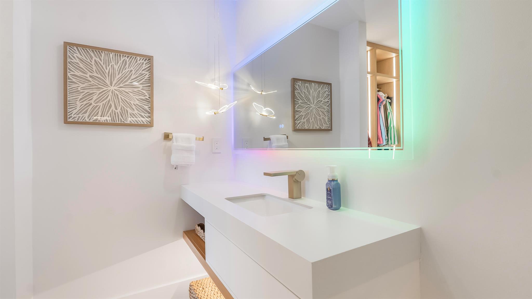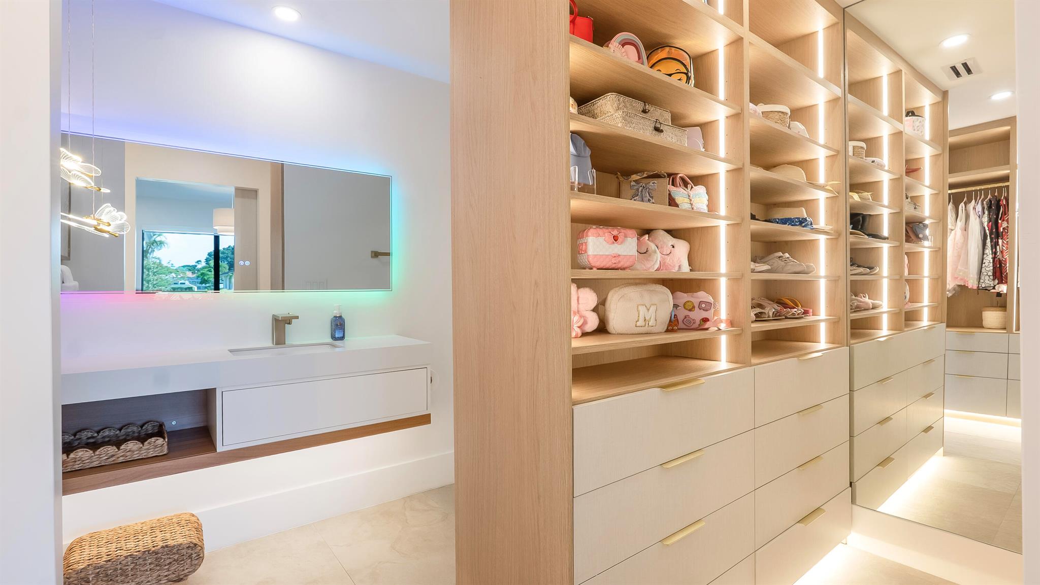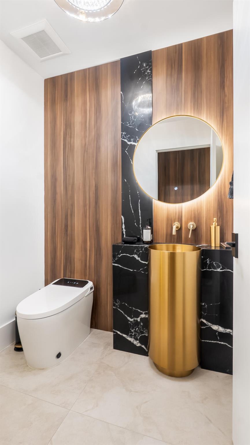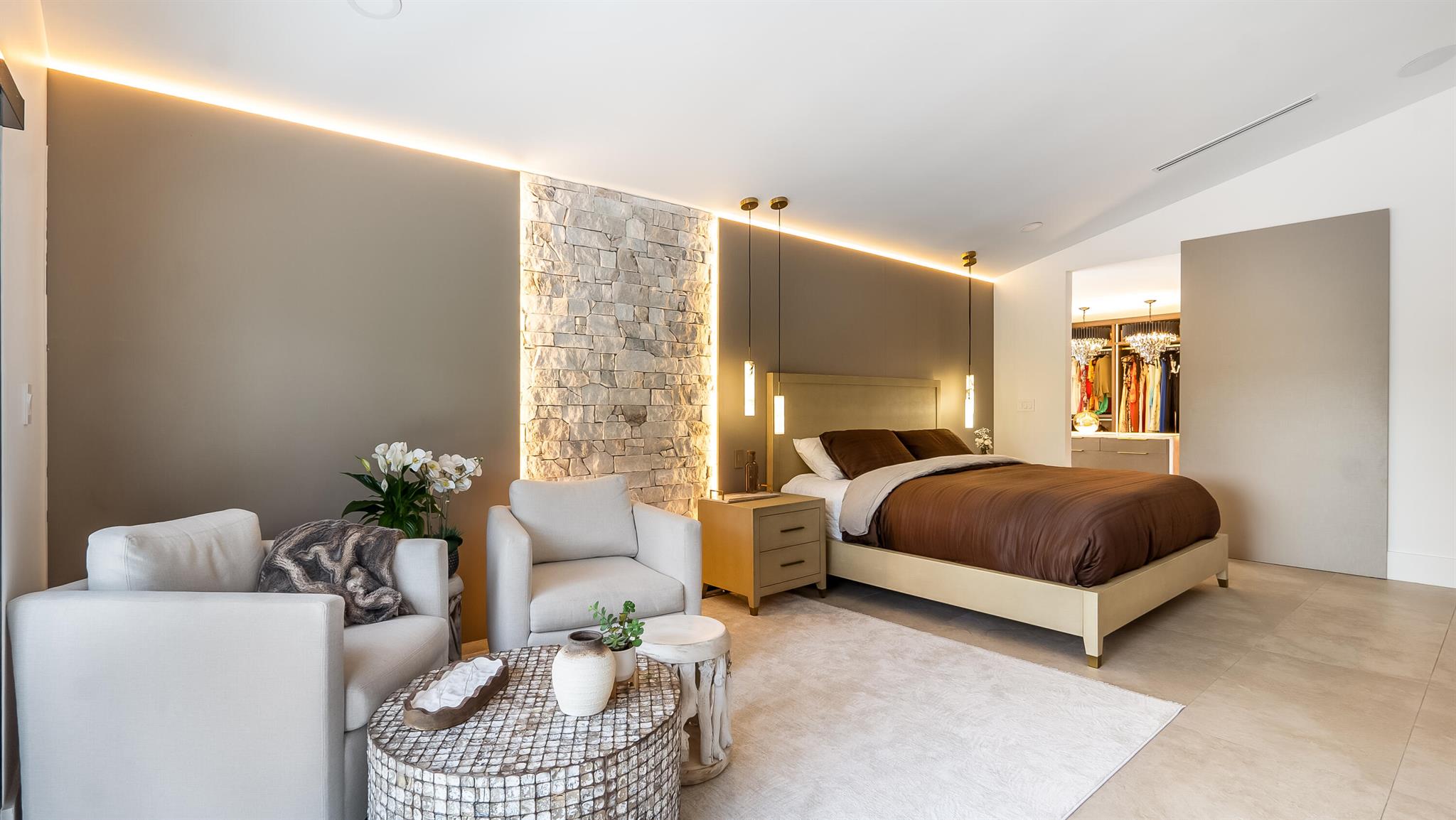 From the moment you arrive, this fully renovated home captivates with a floating water walkway and front glass pivot door. Inside, soaring 19-foot ceilings, open-concept living, and impeccable high-end finishes set the stage for sophisticated living. The residence features 4 en-suite bedrooms with custom closets, a spacious primary bedroom with wet-room and dream closet, a chef's kitchen with Wolf appliances, bespoke cabinetry, and quartzite island, a modern Taj Mahal stone fireplace, as well as a 300-bottle wine cellar and man cave garage that elevate lifestyle and entertainment. Step outside to your private resort oasis with a saltwater pool, sunken lounge, in-pool fire pit, swim jets,10-person spa, and cabana steam bath, all framed by lush tropical landscaping and golf course views.