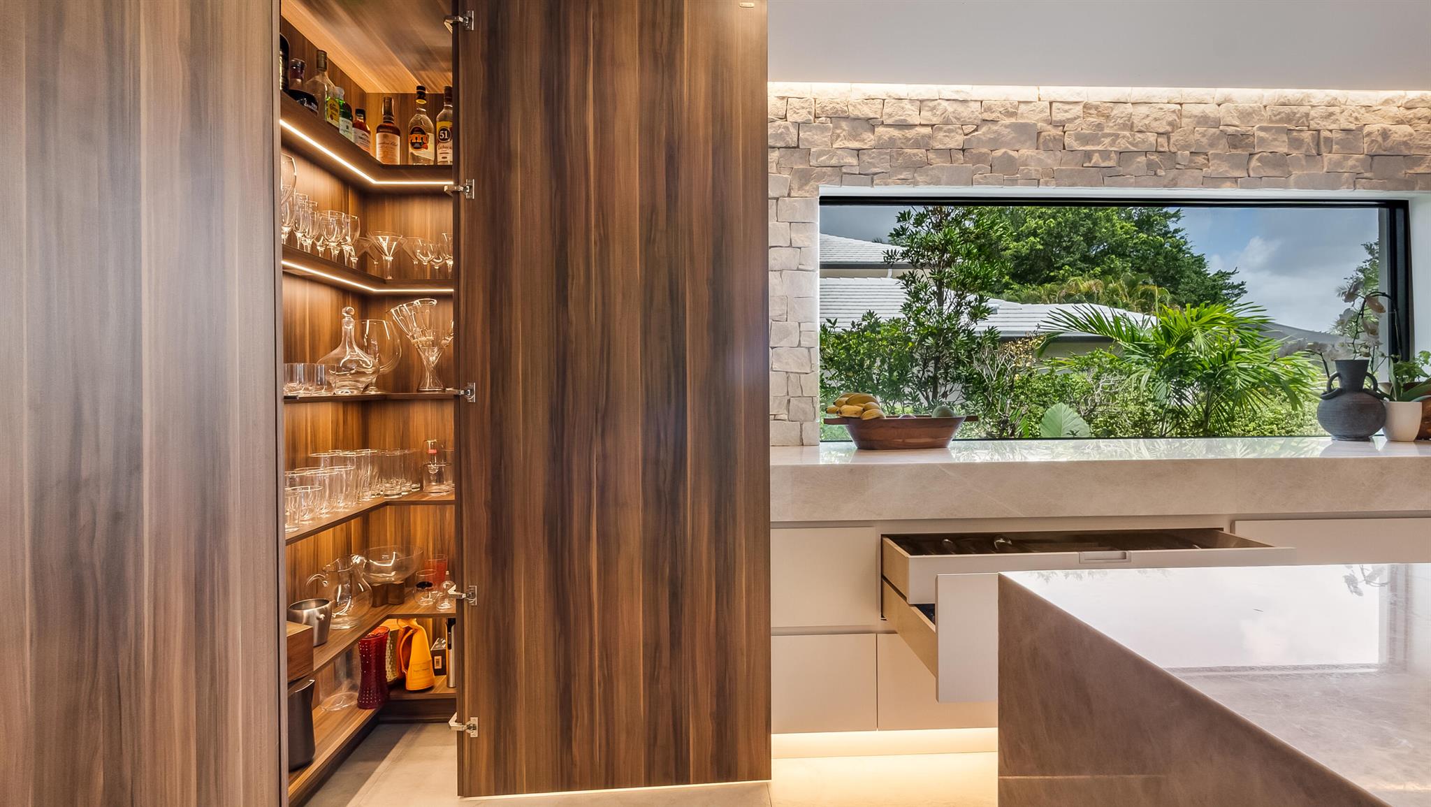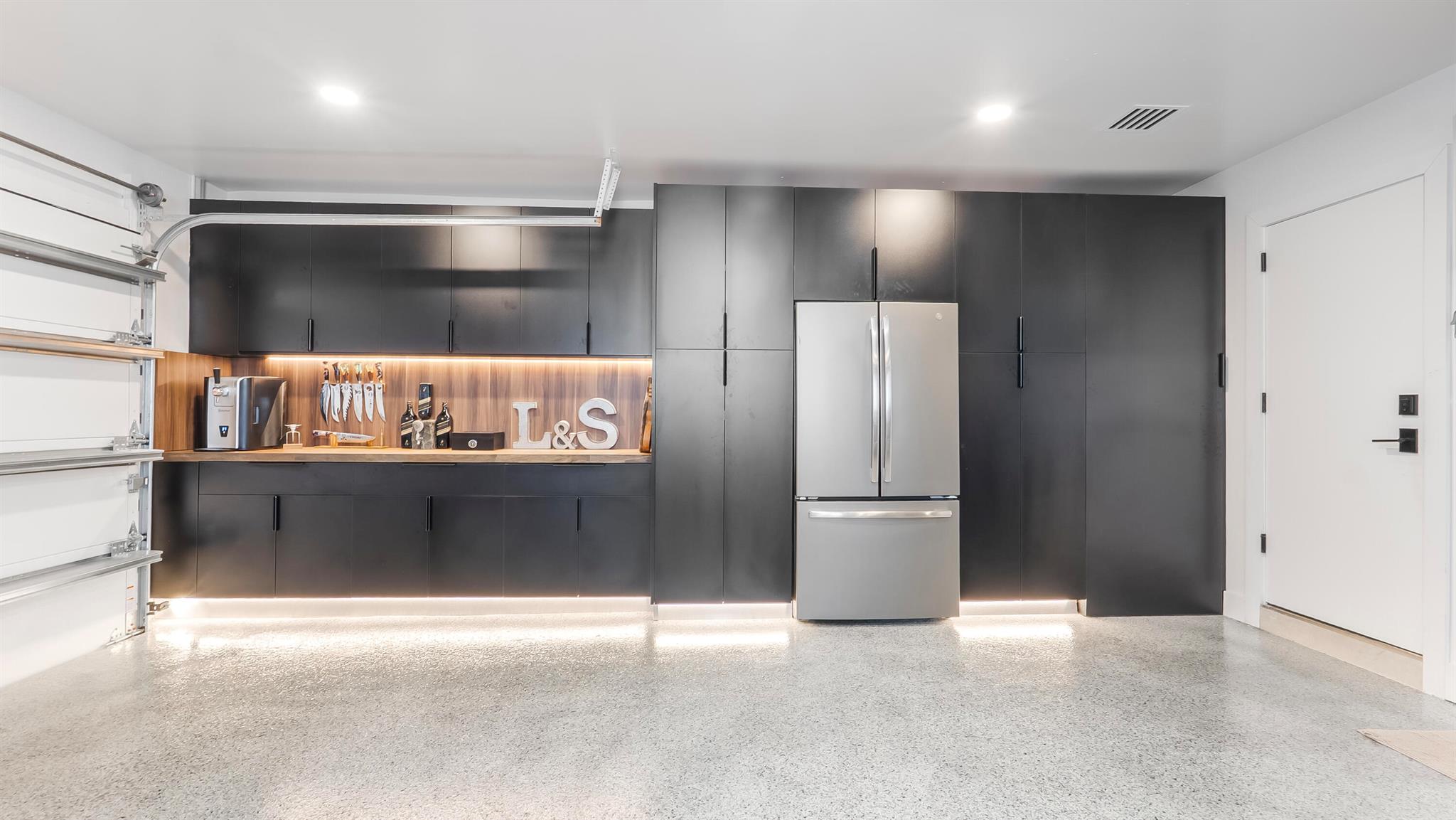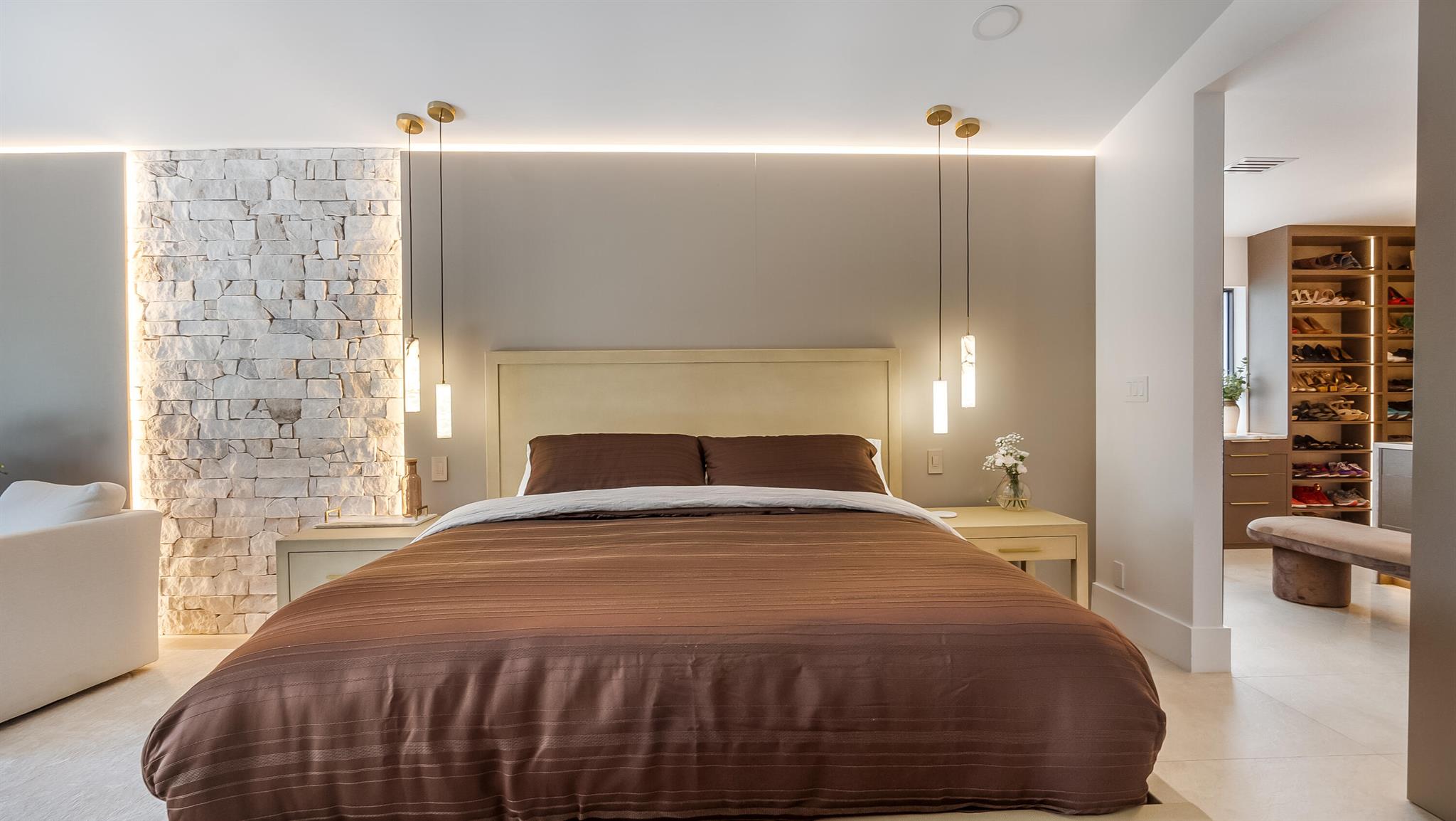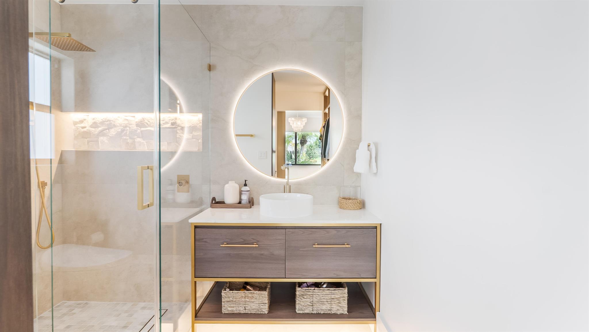 From the moment you arrive, this fully renovated home captivates with a floating water walkway and front glass pivot door. Inside, soaring 19-foot ceilings, open-concept living, and impeccable high-end finishes set the stage for sophisticated living. The residence features 4 en-suite bedrooms with custom closets, a spacious primary bedroom with wet-room and dream closet, a chef's kitchen with Wolf appliances, bespoke cabinetry, and quartzite island, a modern Taj Mahal stone fireplace, as well as a 300-bottle wine cellar and man cave garage that elevate lifestyle and entertainment. Step outside to your private resort oasis with a saltwater pool, sunken lounge, in-pool fire pit, swim jets,10-person spa, and cabana steam bath, all framed by lush tropical landscaping and golf course views.