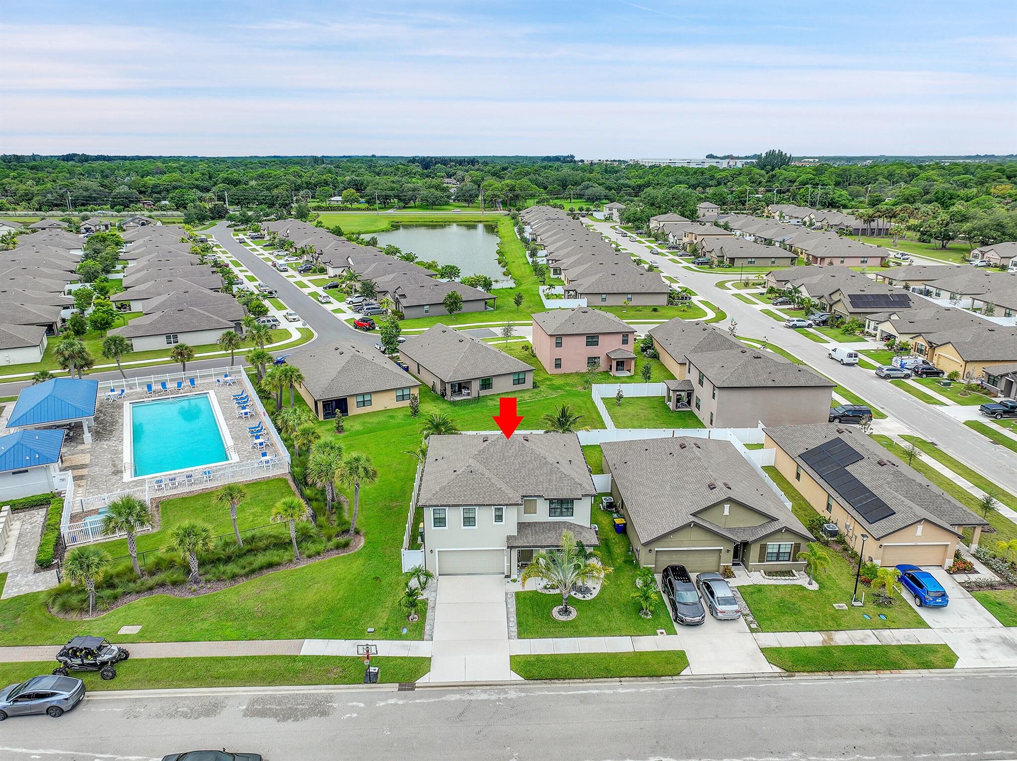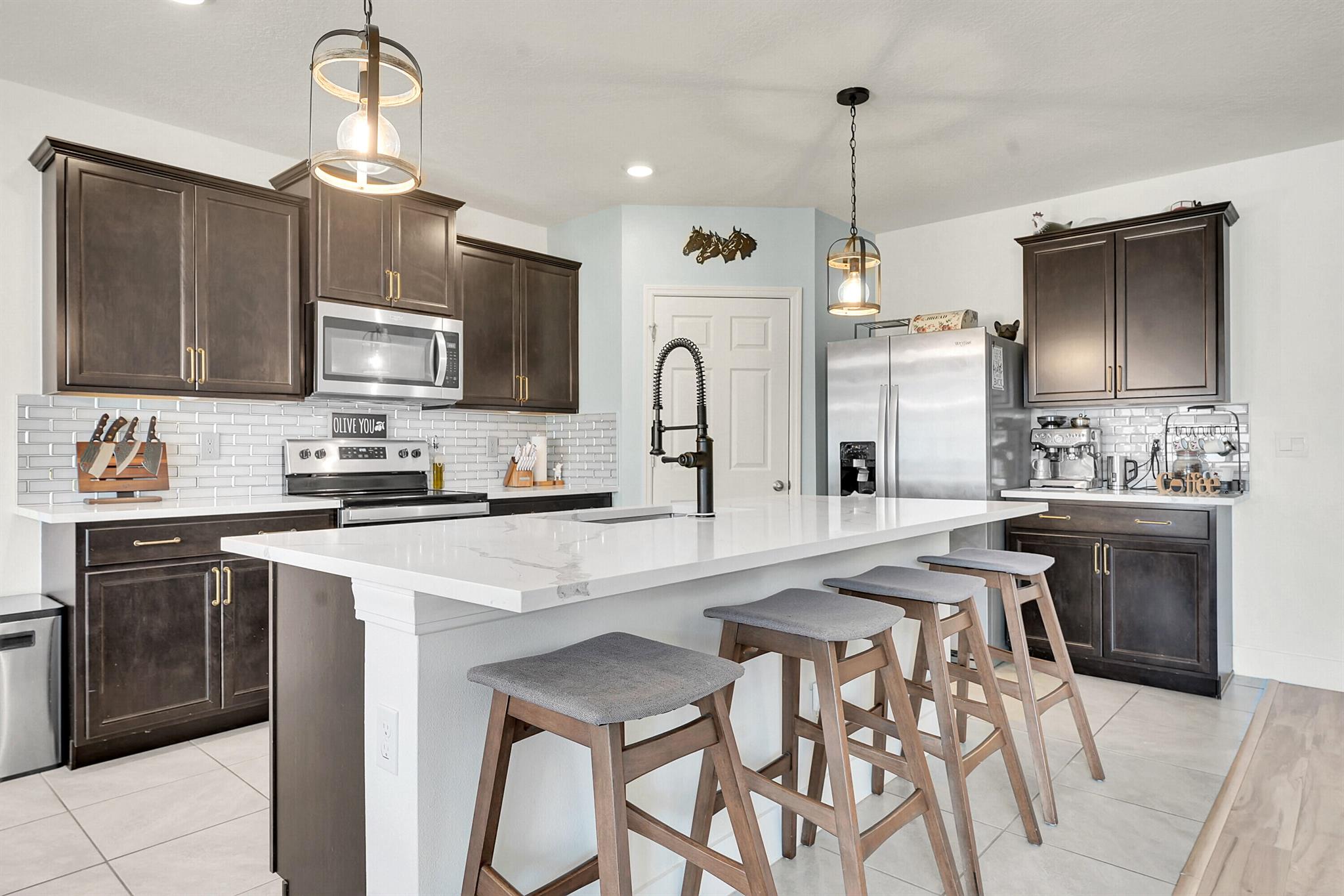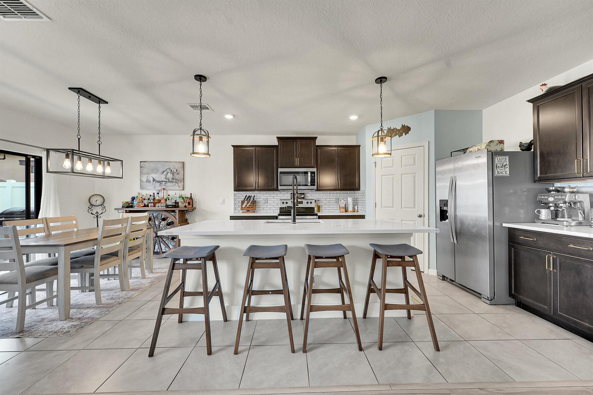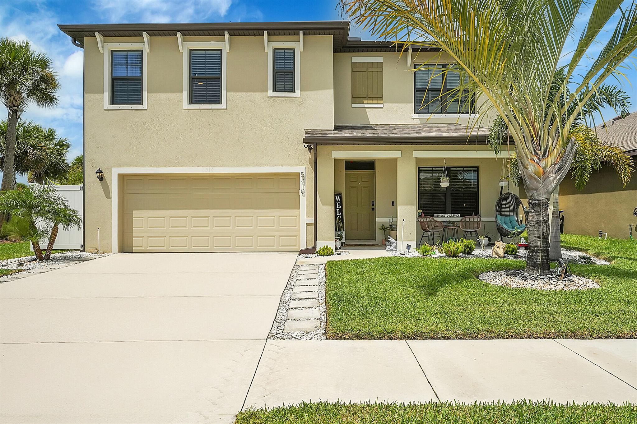 Immaculate two-story home with concrete block construction on both floors! This plan offers a flex room that could be an office. Central living room and open concept kitchen with Quartz countertops, extended island and complete the main level. Duravana waterproof flooring and tiles throughout the house. Upstairs has a generous owner's suite with full bath, loft area that could be an office or entertainment room and the laundry room simplifies an everyday chore! Epoxy coating flooring in the garage and porch of the house. The patio was extended and fenced with fruit trees like Coco Dwarf (refers to a specific type of coconut tree that is smaller in size, it typically reaches heights of 25-60 feet and Sylvestre. St. Augustin grass, that is vividly green, ideal for lawns in hotter climate