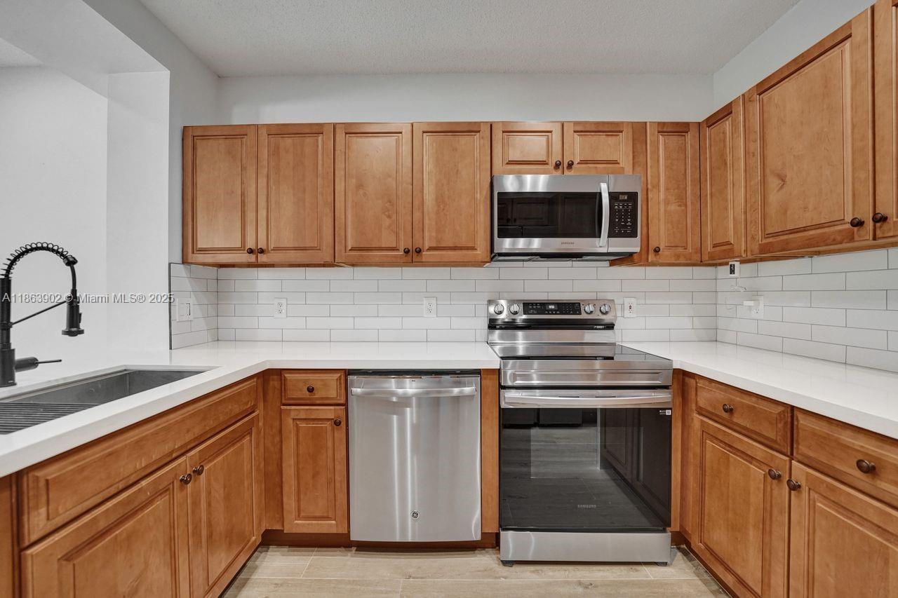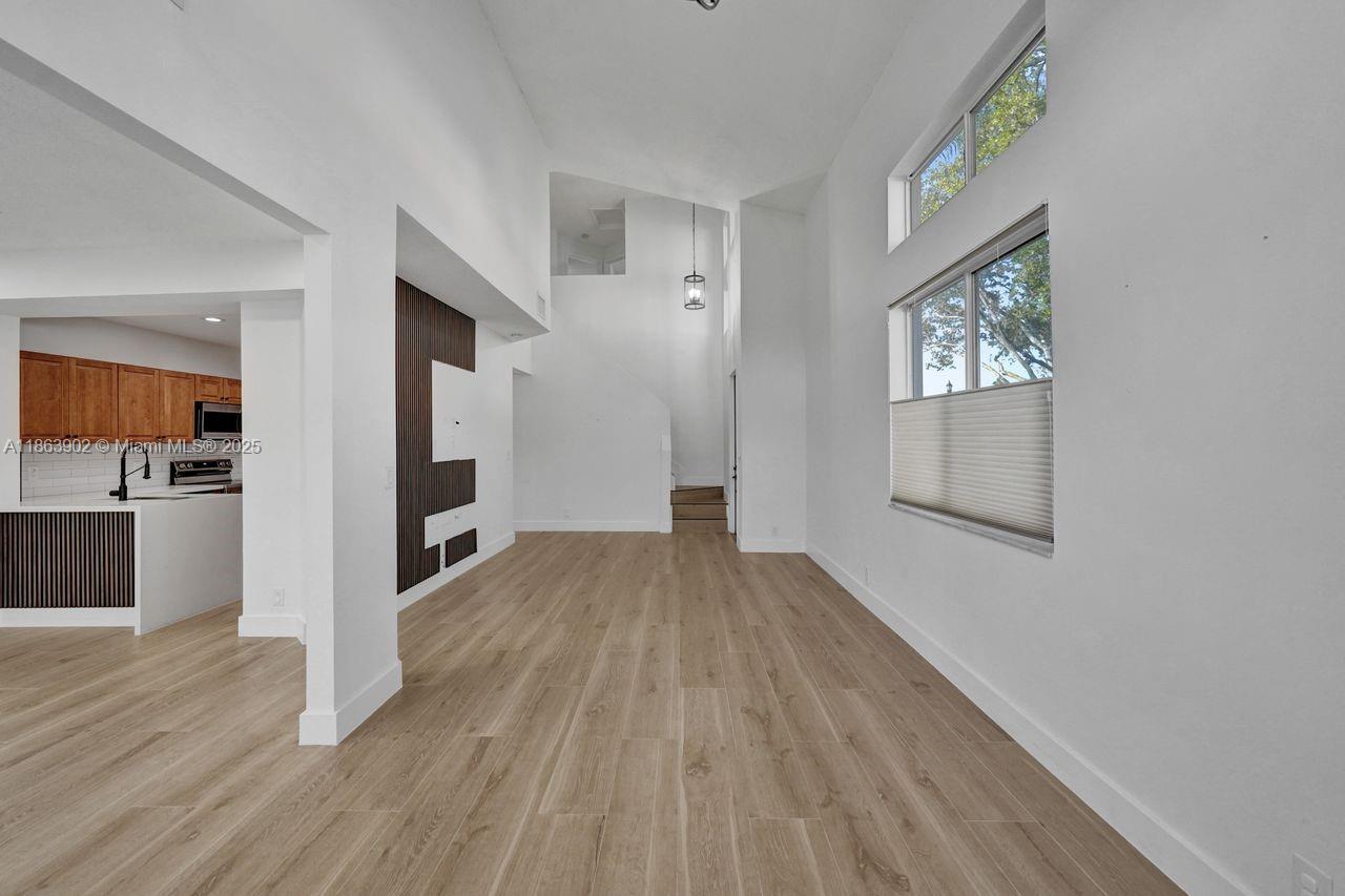 Stunning updated corner townhouse in secure Grand Palms Golf and Country Club. This 3 bedroom/2.5 bath, 2-car garage home has been tastefully remodeled. Enjoy an open kitchen with quartz countertops and Stainless-Steel appliances. The home is tiled with new ceramic wood plank tiles on both floors. The Courtyards section of Grand Palms has included in their HOA dues, Basic Cable, WIFI, Alarm, 24 hour Security Gated Entrance, Community pool, Children's playground and Landscaping maintenance. A new roof was done in 2022 as well as the garage update with Epoxy floors and shelving. In addition, this community has very good schools and is surrounded by excellent shops, restaurants and entertainment venues. This is a wonderful place to call home.