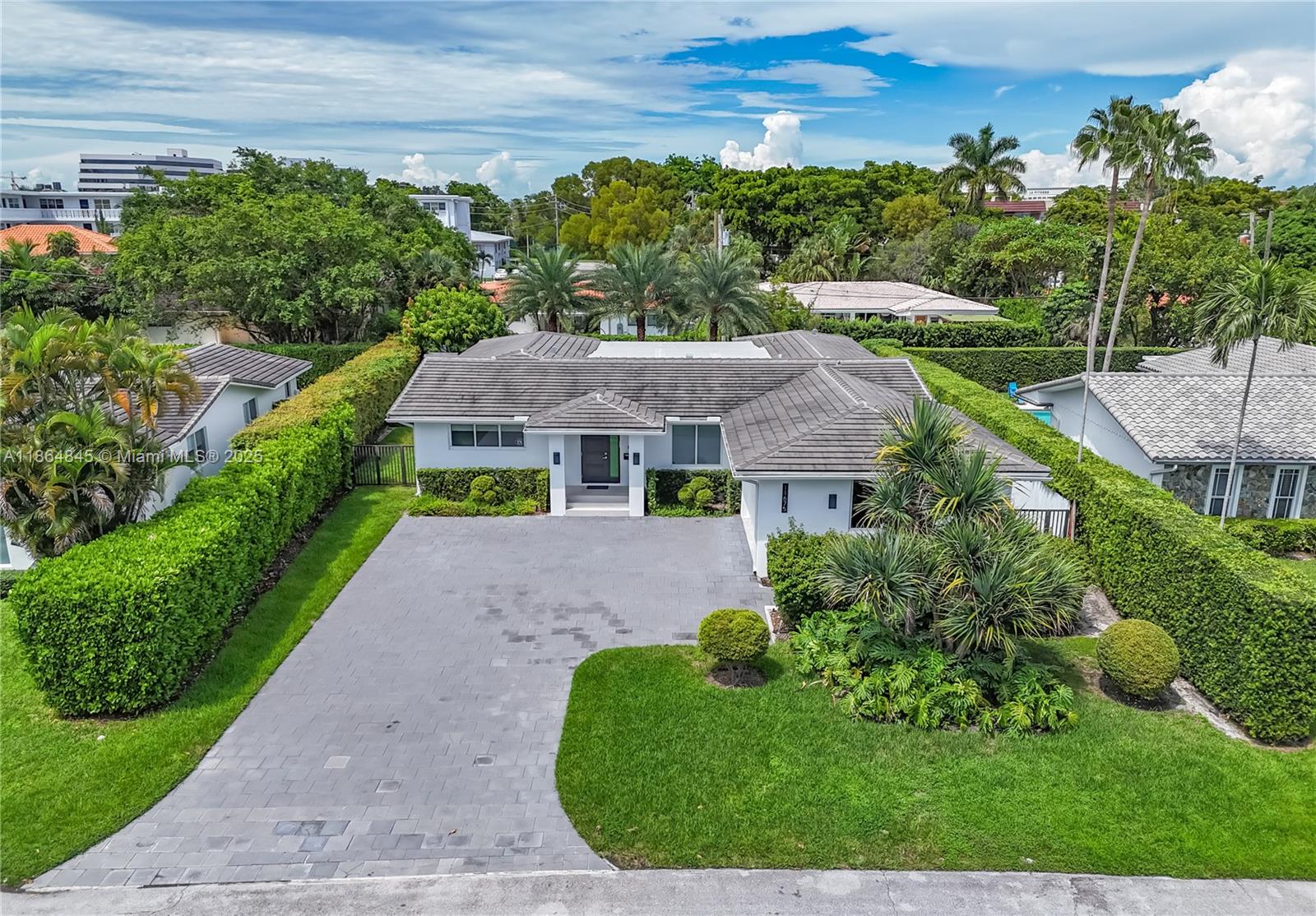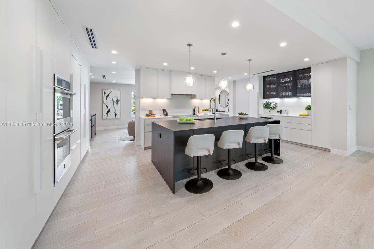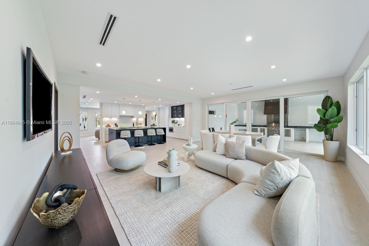 Modern Executive Style home in 24HR guard-gated Sans Souci Estates. 2,580 SF of AC living space, 3,323 SF under roof, boasting 4br 3ba & 2car gar w/AC. Whole-house generator w/automatic transfer switch, hurricane impact windows/doors, & new 2020 roof. Gourmet kitchen crafted by Mia Cucina with top-of-the-line JennAir appliances, including double 30" ovens & microwave drawer. Spa-like master bath is a Mia Cucina design, w/spa tub & separate Shower. Porcelain tile flrs, custom California closets in all rooms, new washer & dryer. Step outside to backyard with huge 350SF covered patio w/built-in BBQ + space for pool, even a private putting green. Sprinkler/irrigation system, 2nd refrigerator in garage. Home offers luxury and security in one of North Miami’s most desirable neighborhoods.