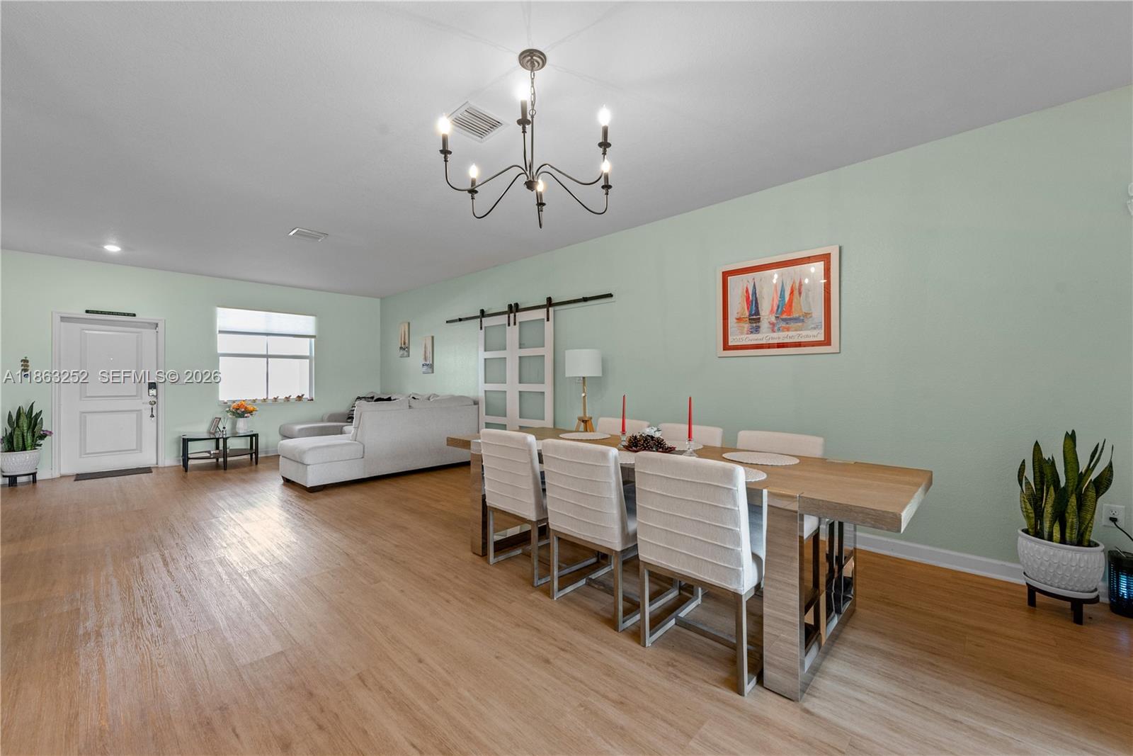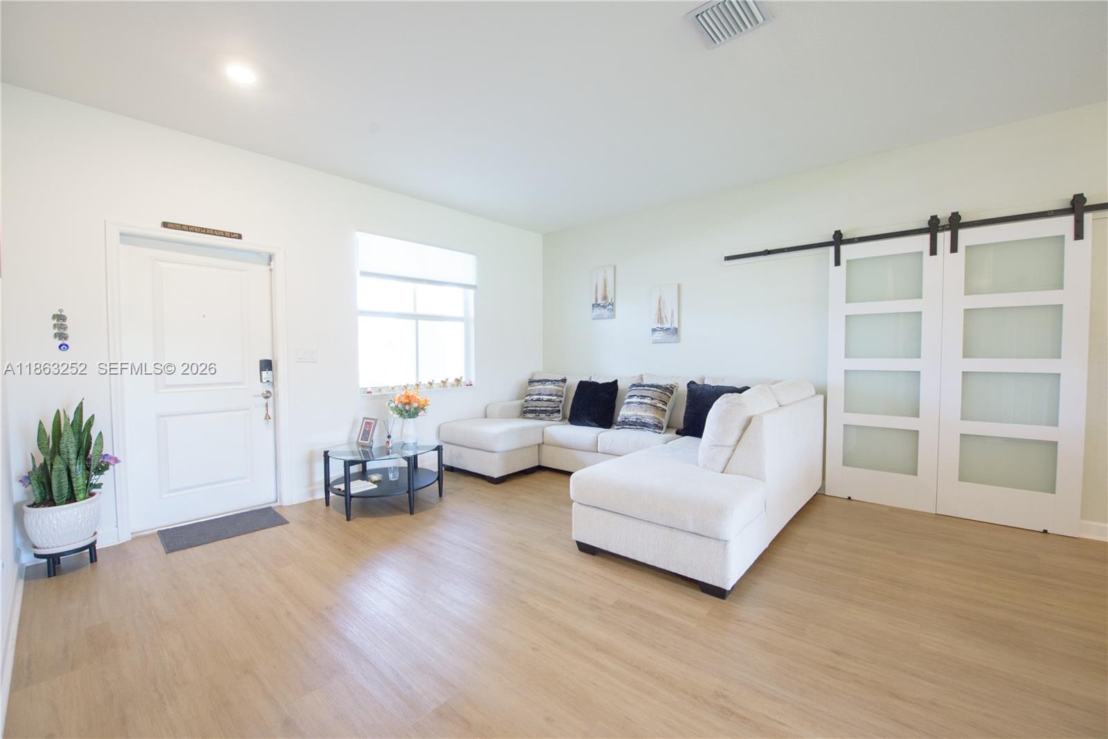 Elegant 5BR/4.5BA Estate featuring sleek tile & laminate floors, impact windows, designer shades, and custom barn doors. Main house is a 2/2.5. In-law suite with private entry, kitchenette, split A/C, open living room and 2 full baths. Or open it up and have a full 5/4.5 under the same roof! Gourmet kitchen boasts white cabinetry, stainless steel appliances, Corian countertops, island with sink & pantry. Formal dining with chandelier, spacious family room, and covered patio with pavers—perfect for entertaining. Lavish master with tray ceiling, spa-style bath, dual sinks, glass-enclosed shower, and walk-in closet. 2-car garage, laundry room, fenced yard, LED lighting & more. NO HOA!! PROOF OF FUNDS AND/OR PRE-APPROVAL LETTER REQUIRED PRIOR TO SCHEDULING A SHOWING OF THE PROPERTY!