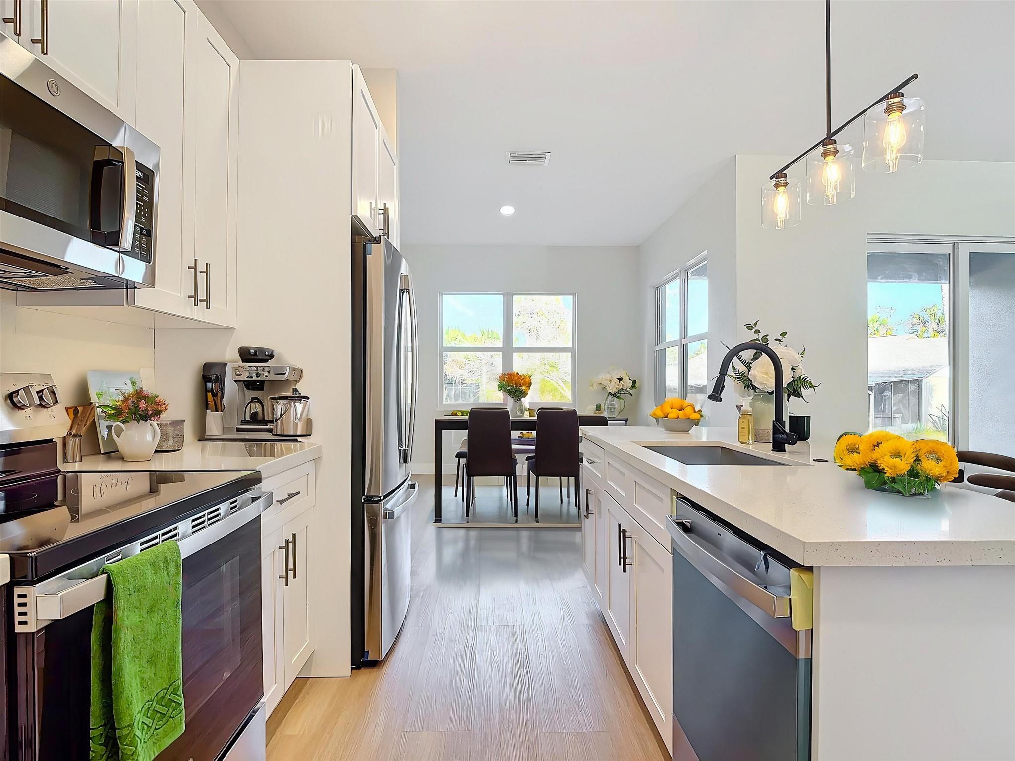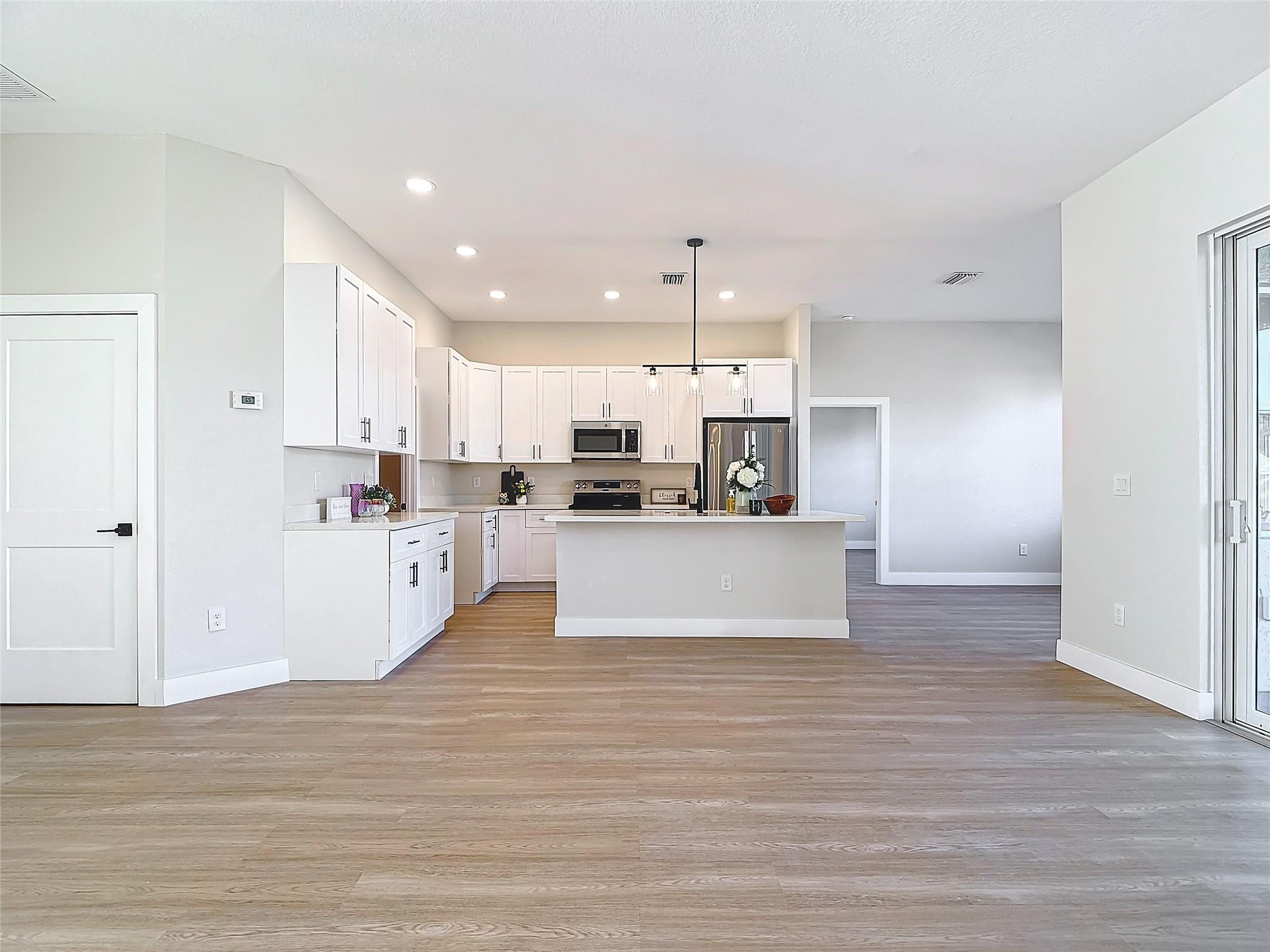MOTIVATED SELLER! 4-bedroom + den, 2-bathroom home. With over 2,000 square feet of living space and a 2-car garage. Built with 10-foot ceilings, tall doors, and luxury vinyl flooring throughout, the home provides an open floor plan. The kitchen features 42” upper cabinets, quartz countertops, and stainless-steel appliances. The primary suite includes a walk-in shower with glass door, double vanity, and a large walk-in closet. A separate den with double doors makes an ideal home office, playroom, or flex space. Additional features include an elegant glass front entry, energy-efficient construction, and modern finishes throughout. Schedule a private showing to see this move-in ready home.