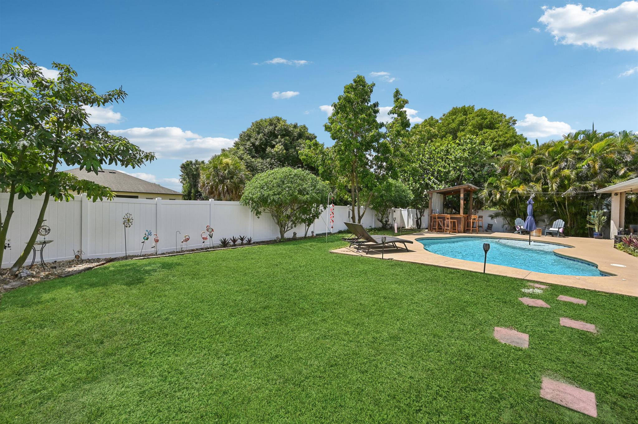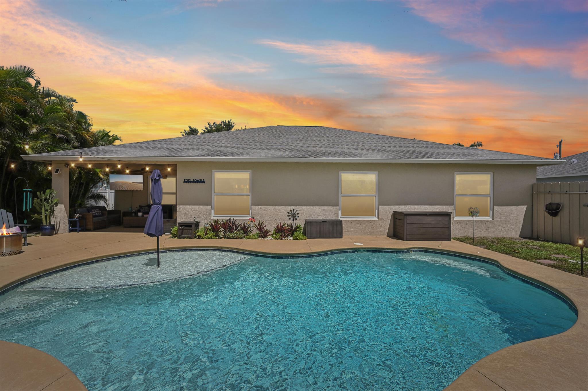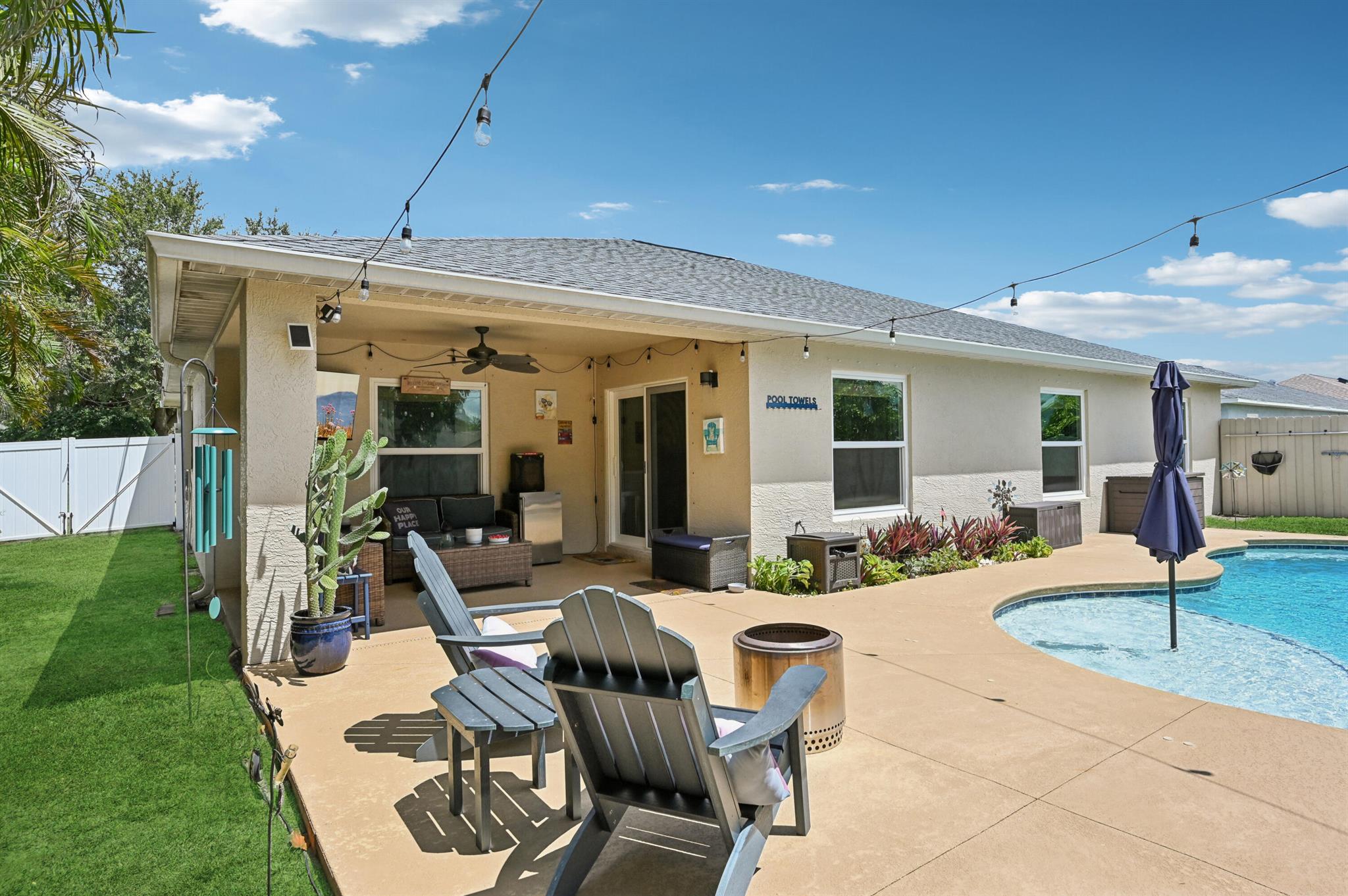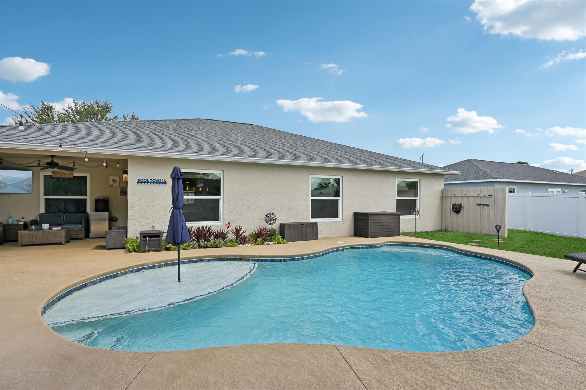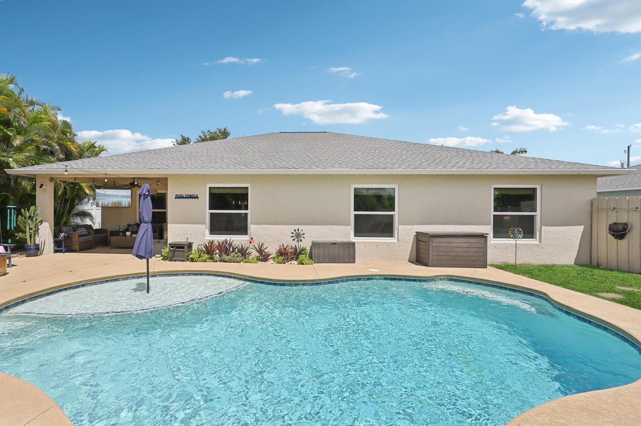 Move-in ready and perfectly located, this home checks every box and is now competitively priced at $469,000. No HOA | Saltwater Pool (2021) | New Roof (2022) | New A/C (2025) | Energy-Efficient Windows (2021) | Water Heater (2019) | GE Washer & Dryer (2021) | Outdoor Bar | Near I-95 & Turnpike. This CBS home offers nearly 2,000 sq ft of open-concept living with views of the sparkling saltwater pool. The fully fenced backyard (new vinyl 2024) includes a covered patio, lounge seating, bar, and cooking station for grilling and smoking. Inside, enjoy a SPLIT FLOOR PLAN, TWO WALK-IN CLOSETS, LUXURY LAMINATE flooring, updated lighting, DEDICATED LAUNDRY ROOM, and BUILT-IN STORAGE.