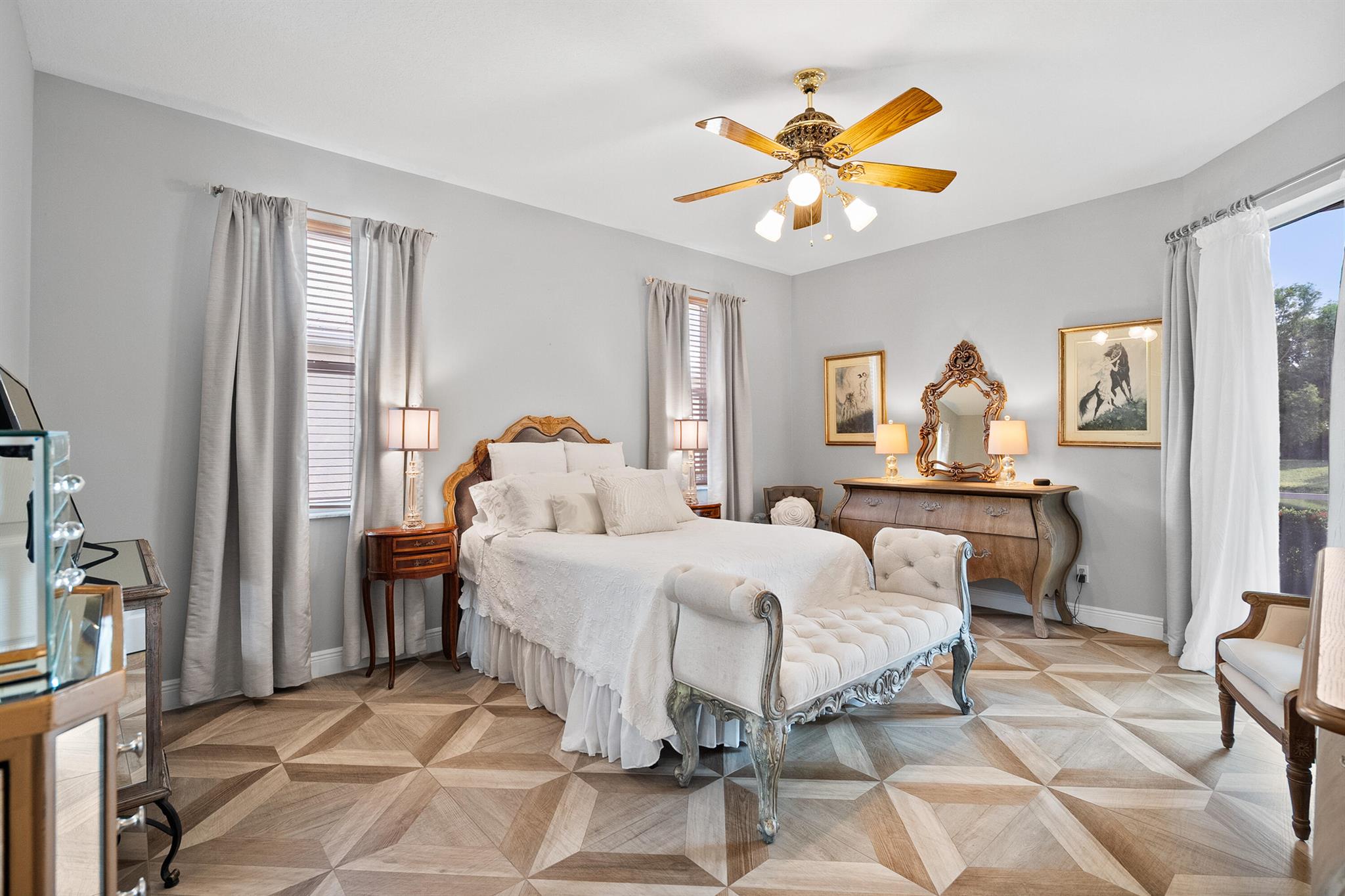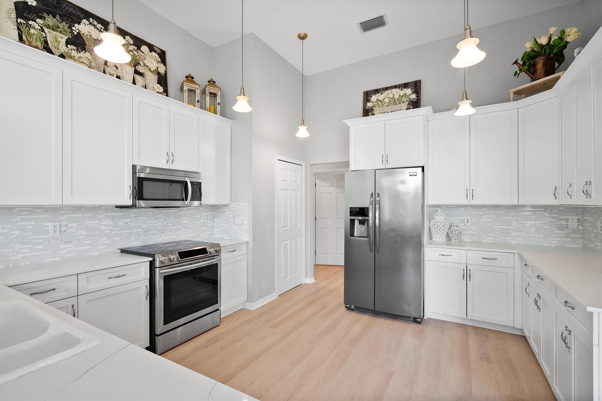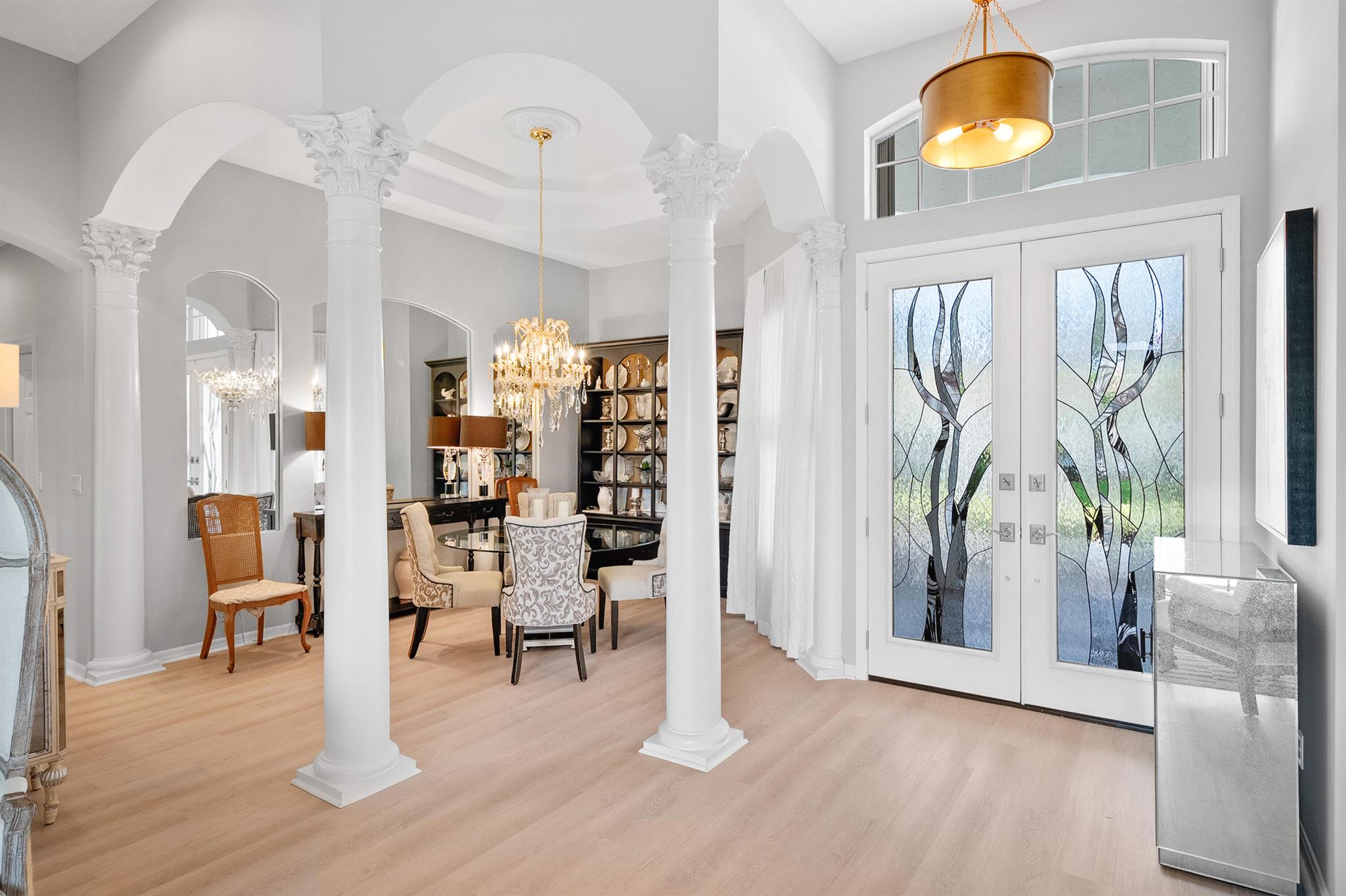 Elegance with modern renovations in this captivating floor Plan. Featuring light, neutral vinyl floors, soaring 12' ceilings in the main living areas, and 10' ceilings throughout the rest of the home, this residence is filled with natural light from abundant windows. Updated kitchen showcases white quartz countertops and stainless steel appliances. Floor plan includes a formal dining room, living room, and family room, plus 4 bedrooms and 3.5 baths. One bedroom is an en suite ideal for a nanny or in-law quarters, while another bath serves as a cabana. Enjoy tranquil lakefront views, beautiful mature landscaping, a 2021 roof, and complete hurricane panels. Community amenities include a clubhouse, pool, tennis, fitness center, and optional golf club with cafe and dining. Membership Optional